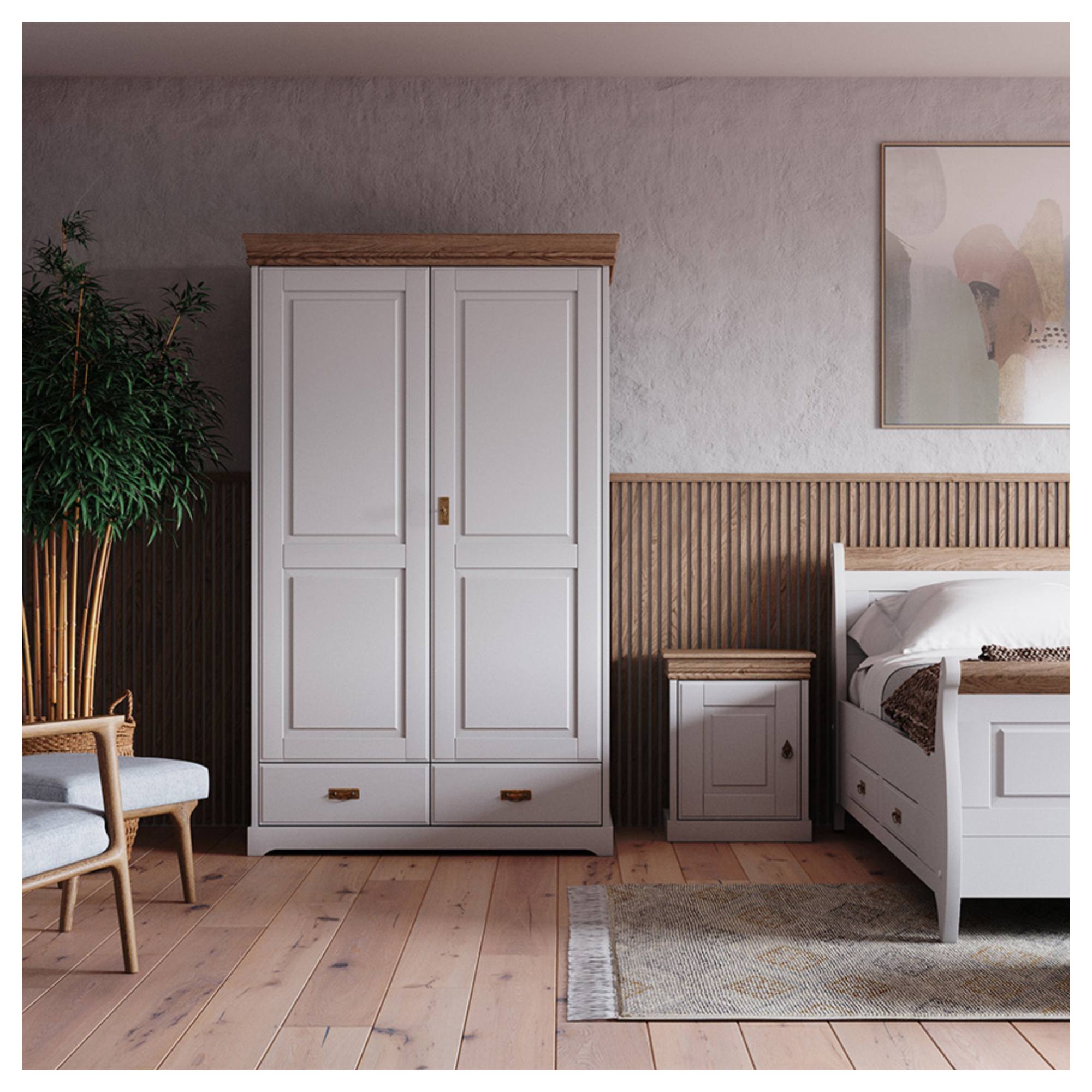 Šatní skříň KANIA 2D v kvalitním nadčasovém zpracování je ideální volbou pro ložnice a šatny inspirované venkovským stylem.