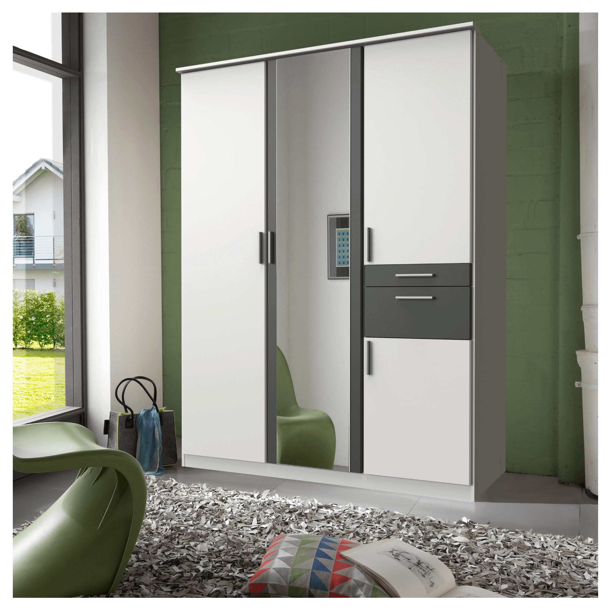 Skříň je uzavíratelná pomocí 4 otočných dveří z nichž jedny jsou celé vyplněny zrcadlem a vy si tak můžete kdykoli zkontrolovat svůj vzhled. První pár dveří zabírá většinu skříně a za sebou ukrývá propojený vnitřní prostor. Zde se nachází široká šatní tyč, která se postará o bundy, kabáty, šaty a další větší kusy oblečení. Nad ní se po celé šířce rozprostírá vložená police. Pravá strana skříně obsahuje 2 menší dveře, kdy za vrchními je umístěna šatní tyč a za spodními vložená police předělující vnitřní prostor. Prostor mezi malými dveřmi zaplňují 2 praktické zásuvky na menší kousky oblečení a doplňky. Všechny přední plochy jsou vybaveny výraznými úchyty pro snadné každodenní používání. Skříň je vyrobena z laminovaného dřevěného materiálu, který nevyžaduje speciální údržbu.