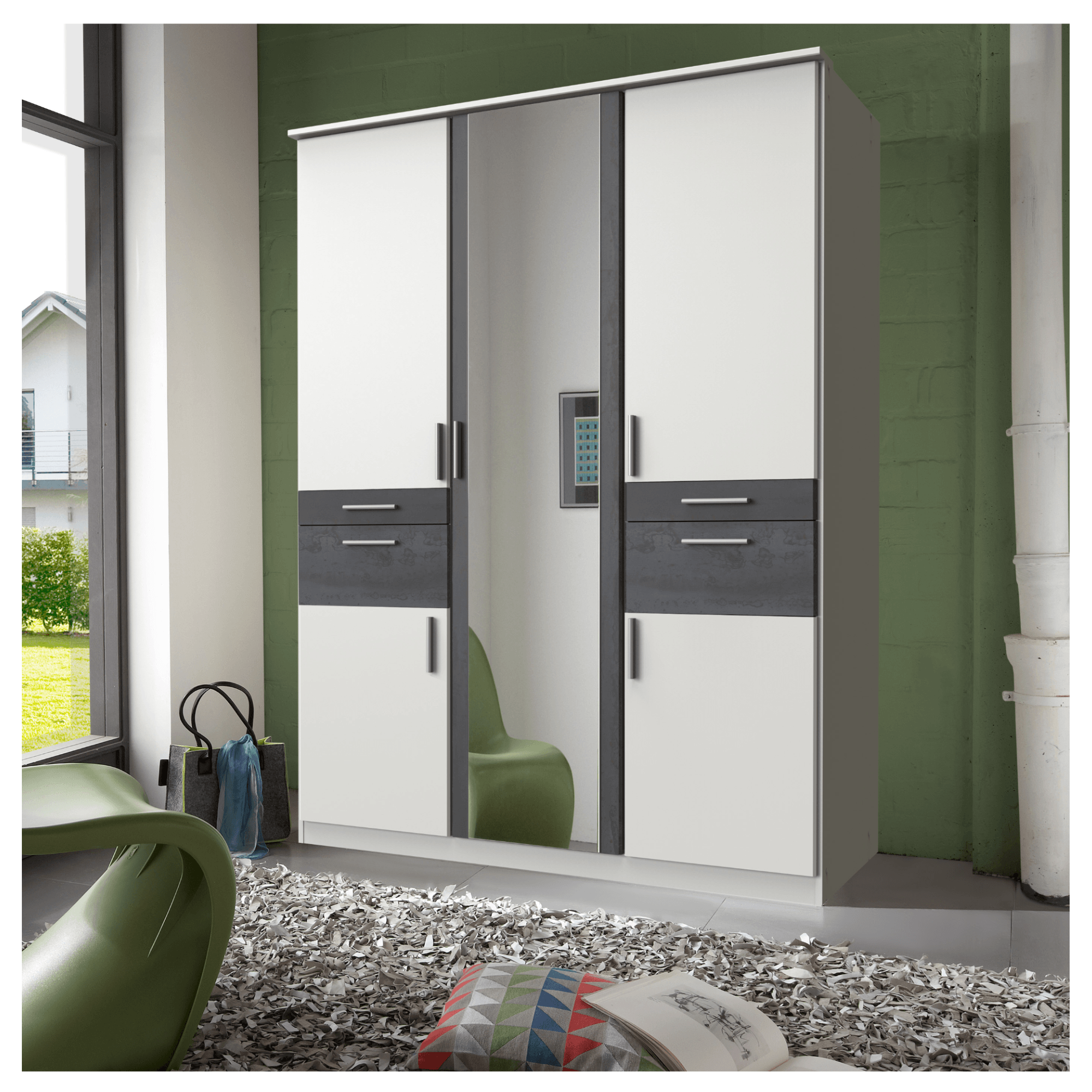Skříň je tvořena 3 bloky z nichž 2 jsou totožné. Prostřední část uzavírají otočné zrcadlové dveře, kde si můžete kdykoli zkontrolovat svůj vzhled a zároveň pomohou prosvětlit a opticky zvětšit místnost. Za nimi se nachází 1 šatní tyč a nad ní 1 vložená police. Levá strana, stejně jako ta pravá, obsahuje 2 otočné dveře a 2 praktické zásuvky. Za každými vrchními dveřmi se nachází šatní tyč a za spodními vložená police. Všechny přední plochy jsou doplněny o výrazné úchyty, díky kterým se vám bude skříň snadno otevírat a zavírat i za tmy. Vyrobena je ze snadno udržovatelného laminovaného dřevěného materiálu.