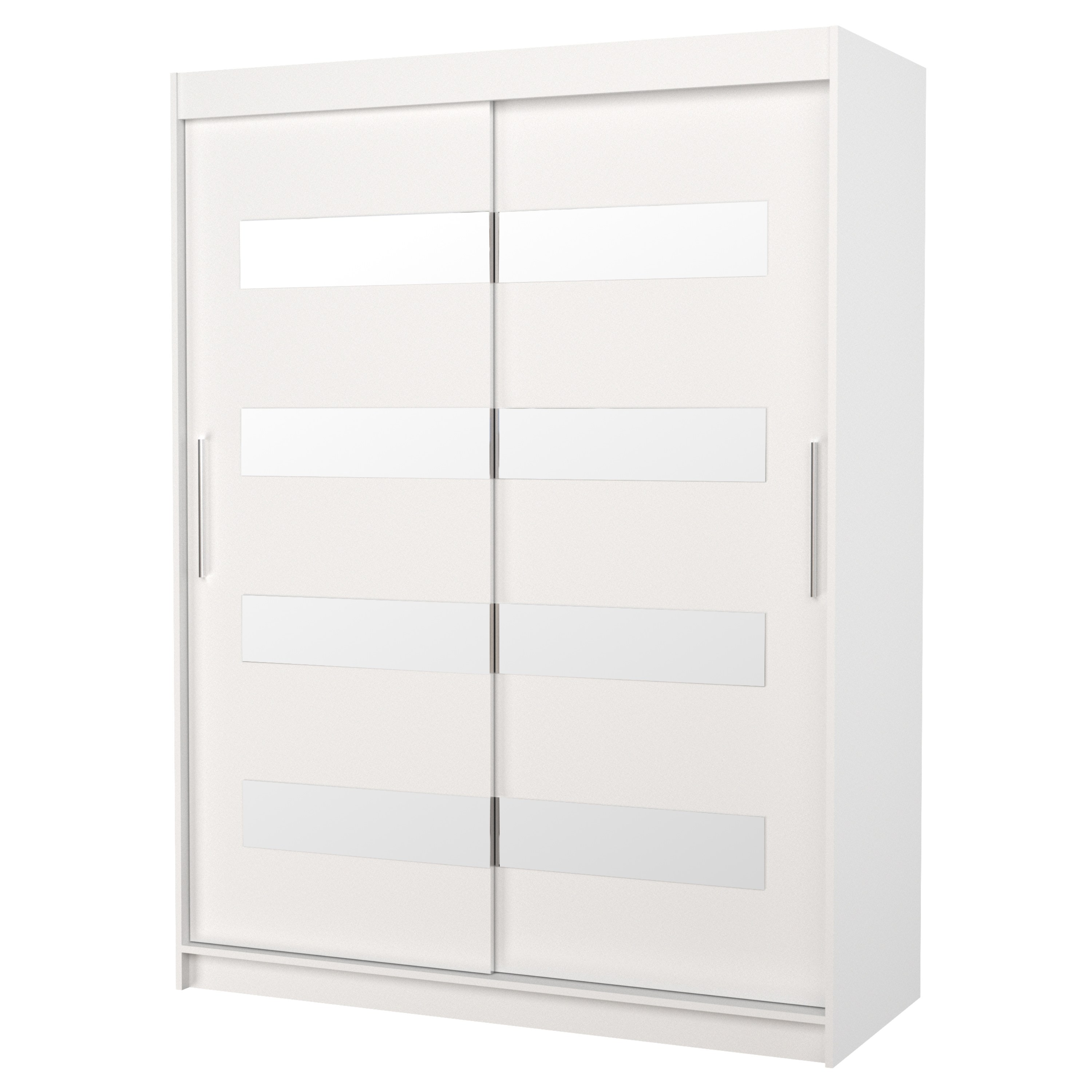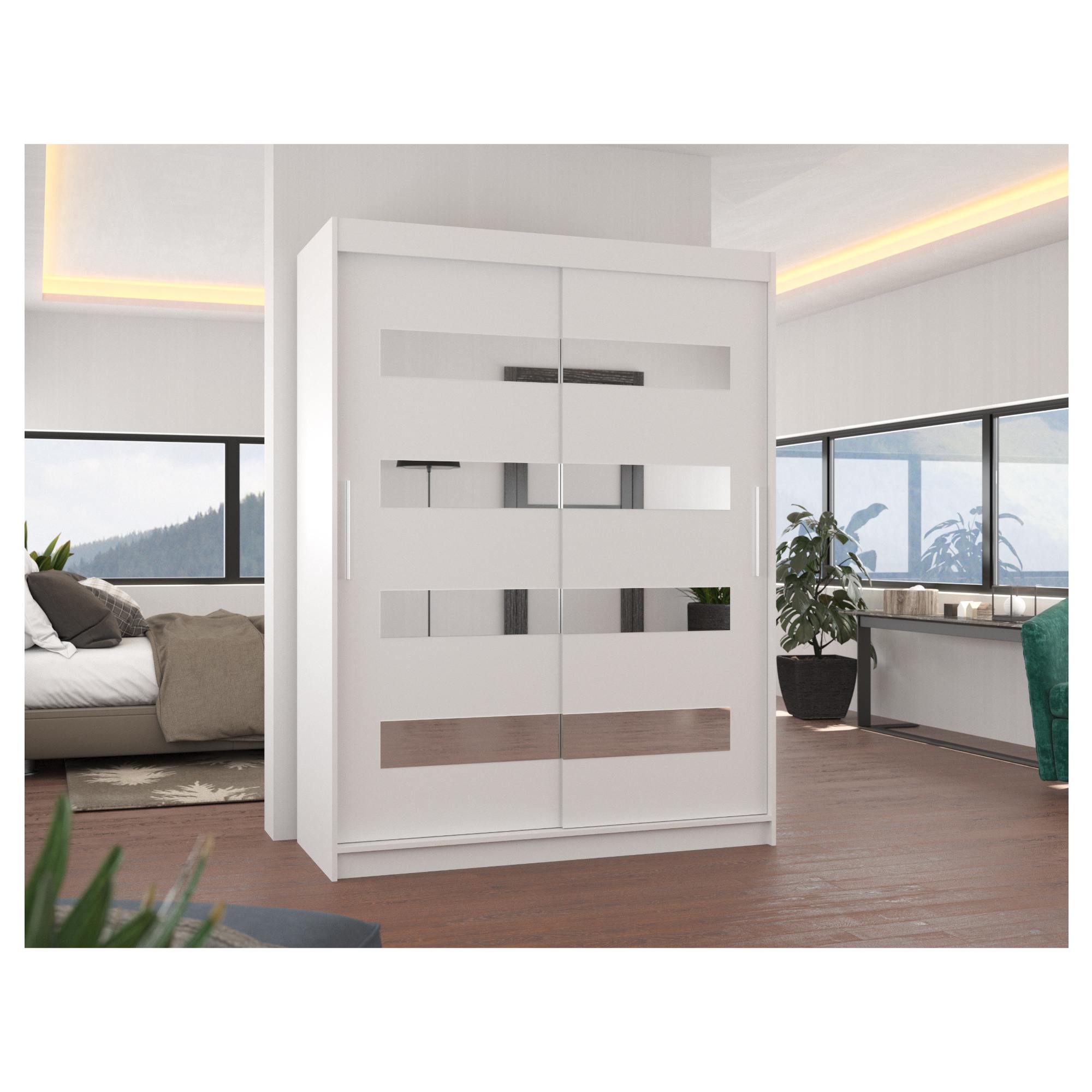 Disponuje posuvnými dveřmi s hliníkovými vodicími lištami pro pohodlné otevírání, které zároveň šetří místo. Dveře skříně jsou doplněny zrcadlovými pruhy, které slouží jako stylová a zároveň praktická dekorace.