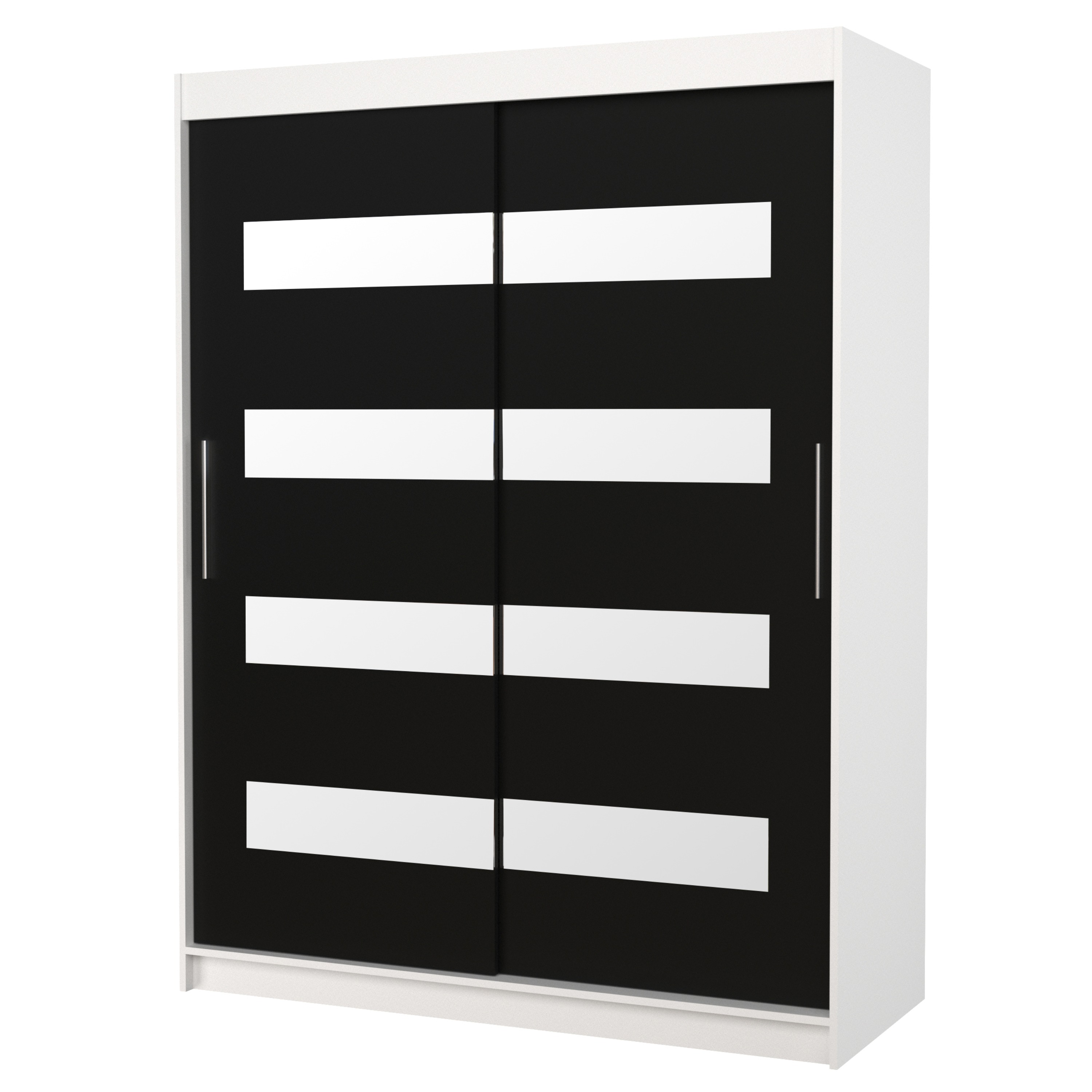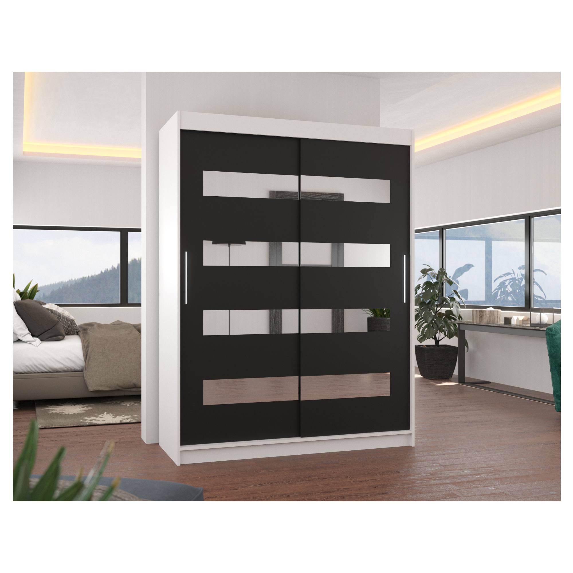 Disponuje posuvnými dveřmi s hliníkovými vodicími lištami pro pohodlné otevírání, které zároveň šetří místo. Dveře skříně jsou doplněny zrcadlovými pruhy, které slouží jako stylová a zároveň praktická dekorace.