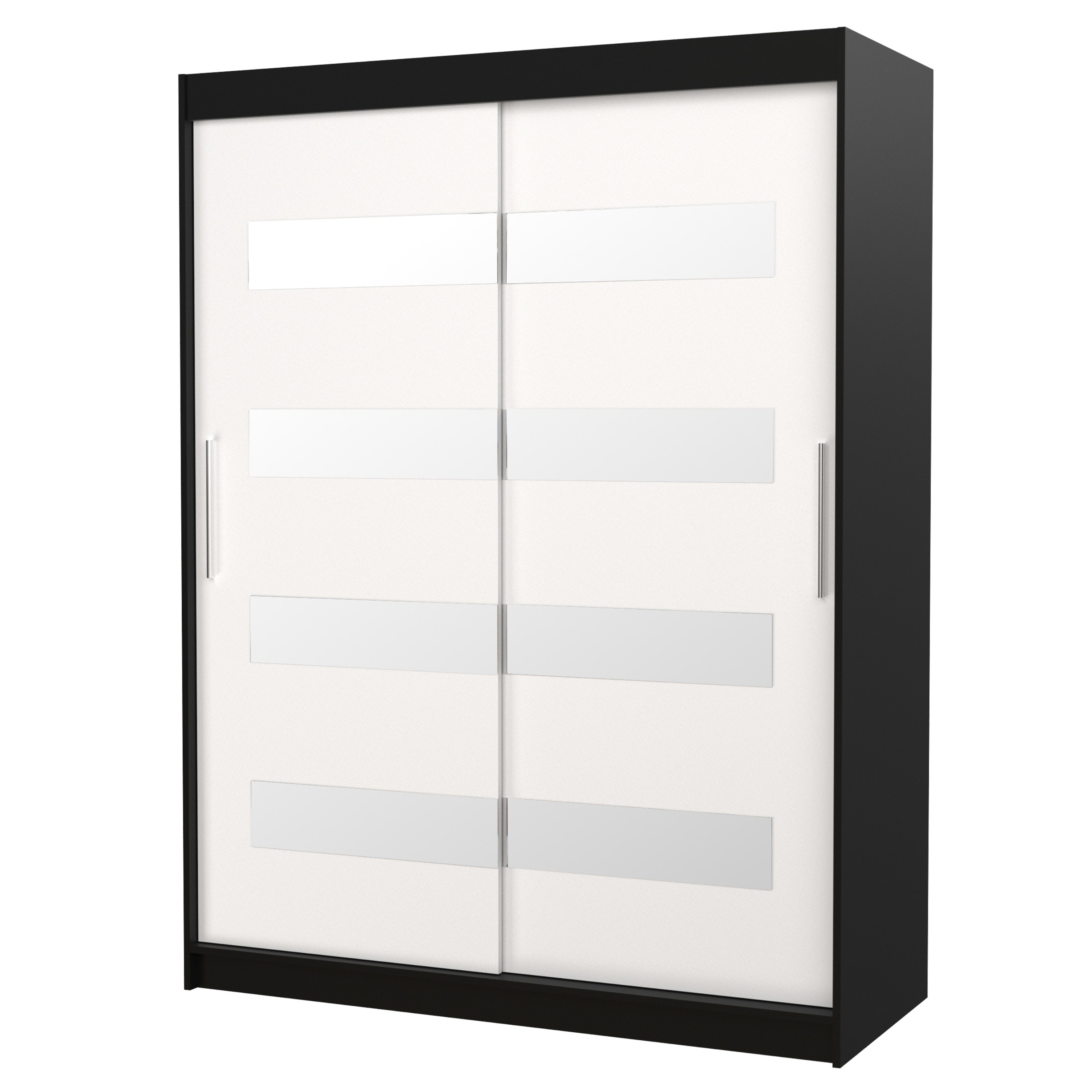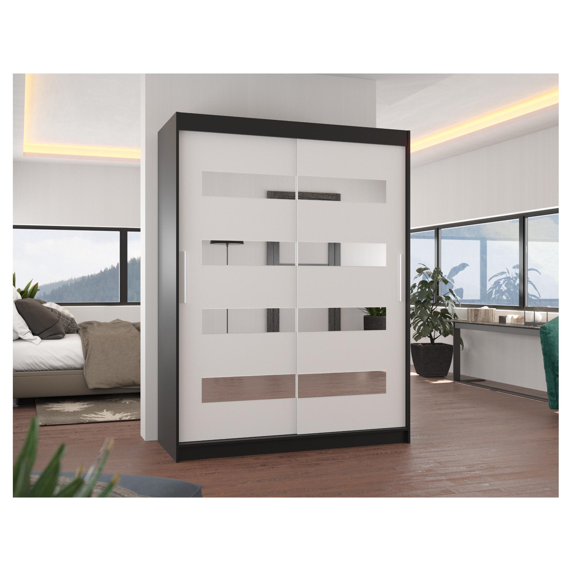 Disponuje posuvnými dveřmi s hliníkovými vodicími lištami pro pohodlné otevírání, které zároveň šetří místo. Dveře skříně jsou doplněny zrcadlovými pruhy, které slouží jako stylová a zároveň praktická dekorace.