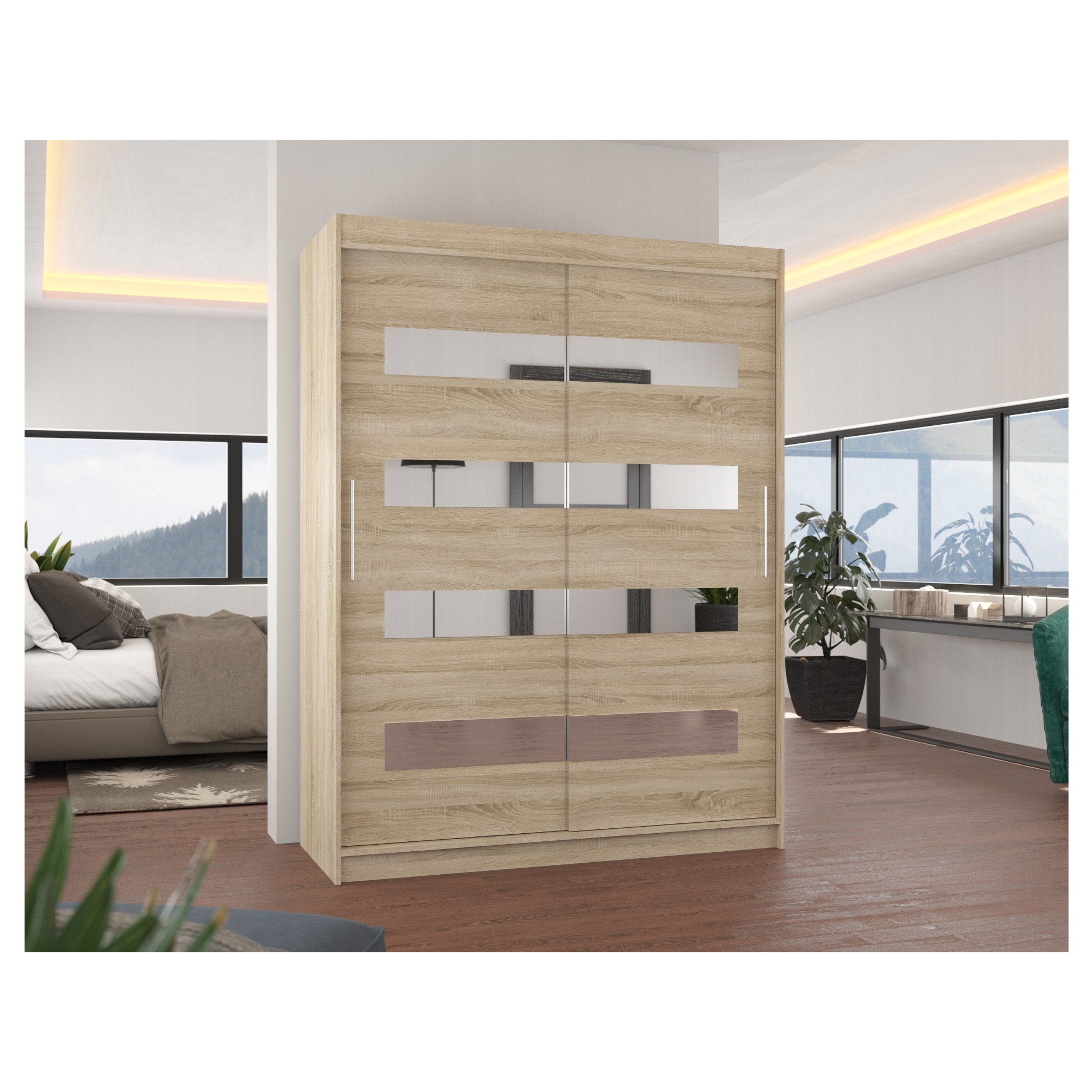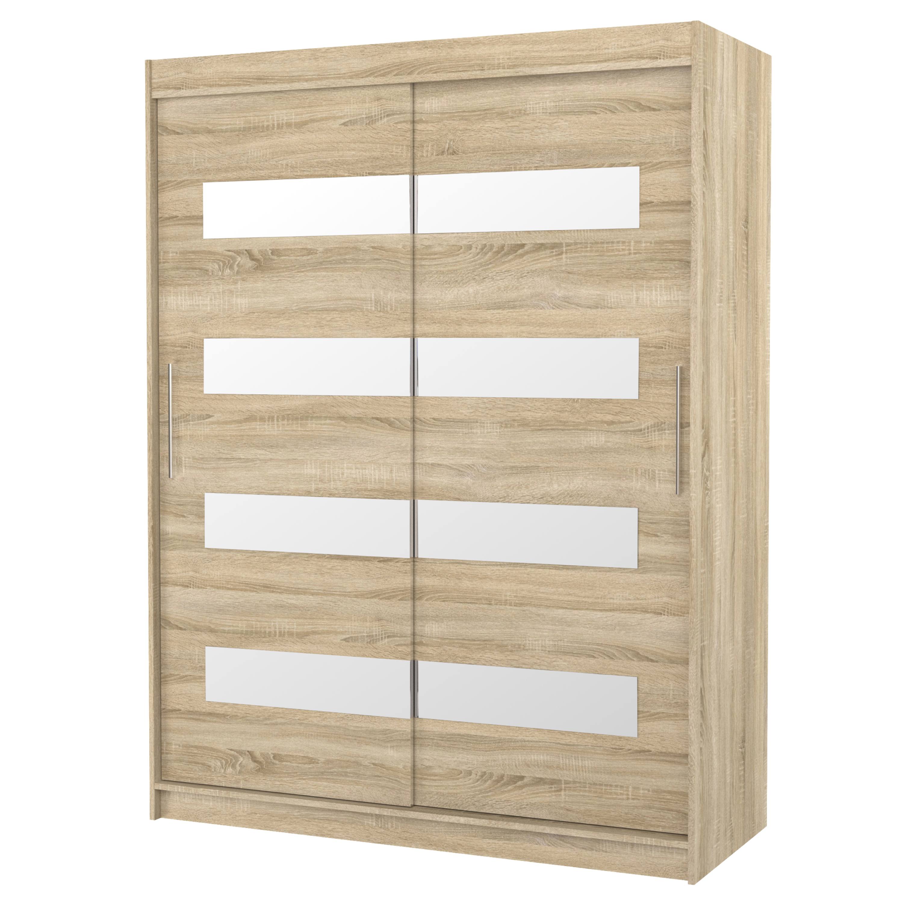 Disponuje posuvnými dveřmi s hliníkovými vodicími lištami pro pohodlné otevírání, které zároveň šetří místo. Dveře skříně jsou doplněny zrcadlovými pruhy, které slouží jako stylová a zároveň praktická dekorace.