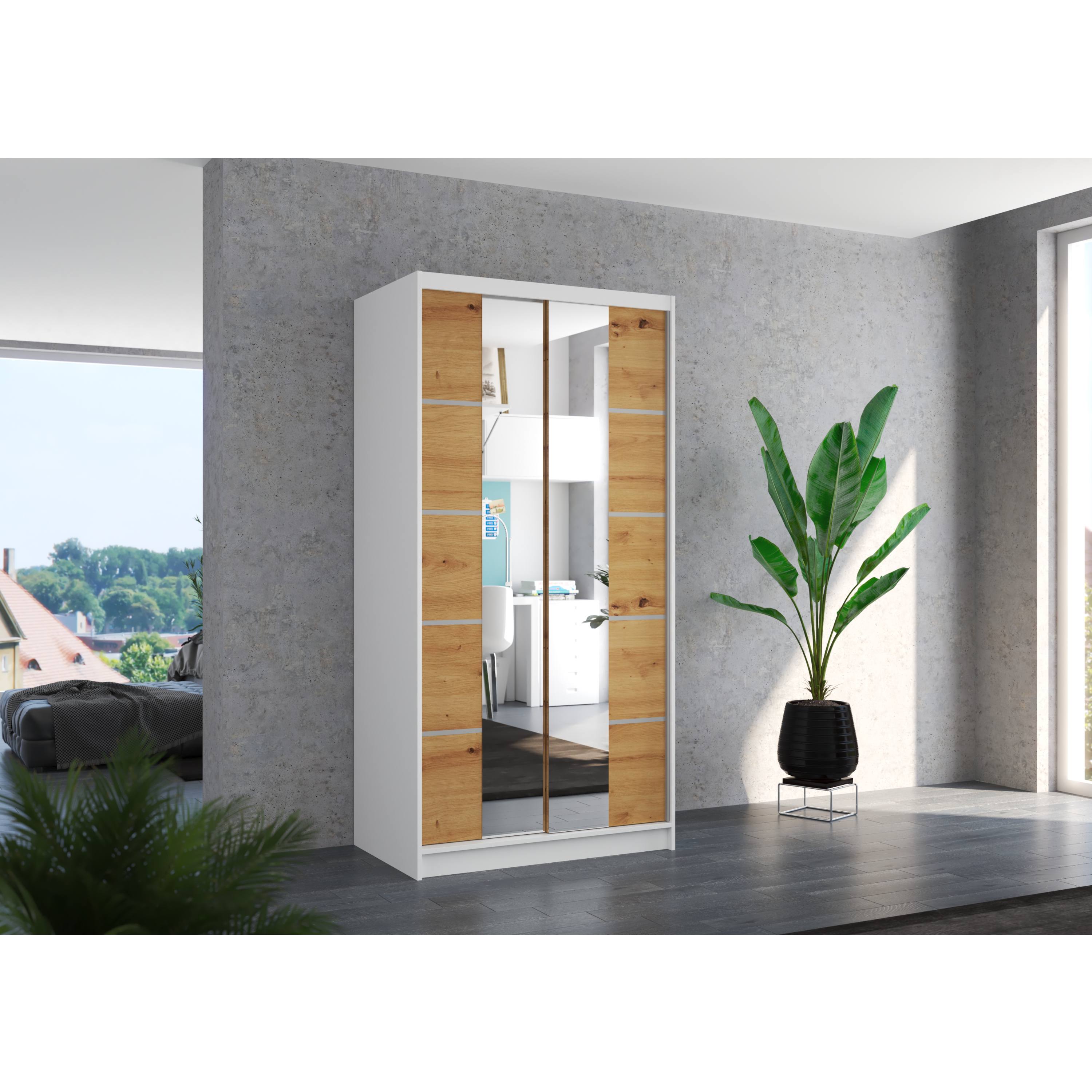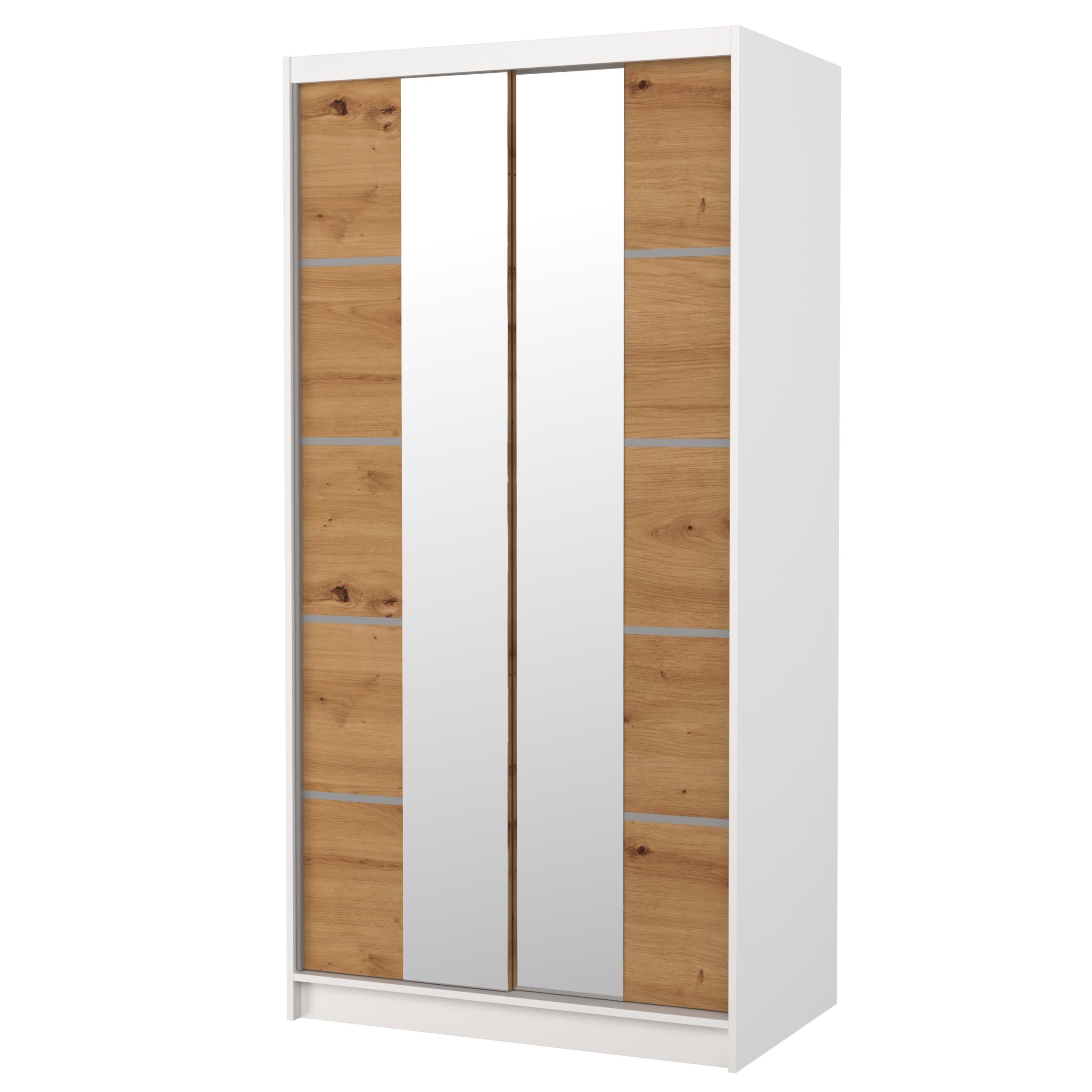 Skříň je vybavena párem posuvných dveří, které se neotevírají do prostoru a šetří tak spoustu cenného místa vně i uvnitř skříně. Součástí dveří jsou také praktické zrcadlové plochy, díky kterým si můžete kdykoli upravit svůj vzhled. Vnitřní prostor je vybaven celkem 4 policemi, pro přehledné uložení poskládaného oblečení nebo i sezonních doplňků, a také šatní tyčí, která je ideální pro zavěšení objemných nebo mačkavých oděvů. Skříň je vyrobena z laminovaného dřevěného materiálu doplněného o ABS hrany chránící před mechanickým poškozením.