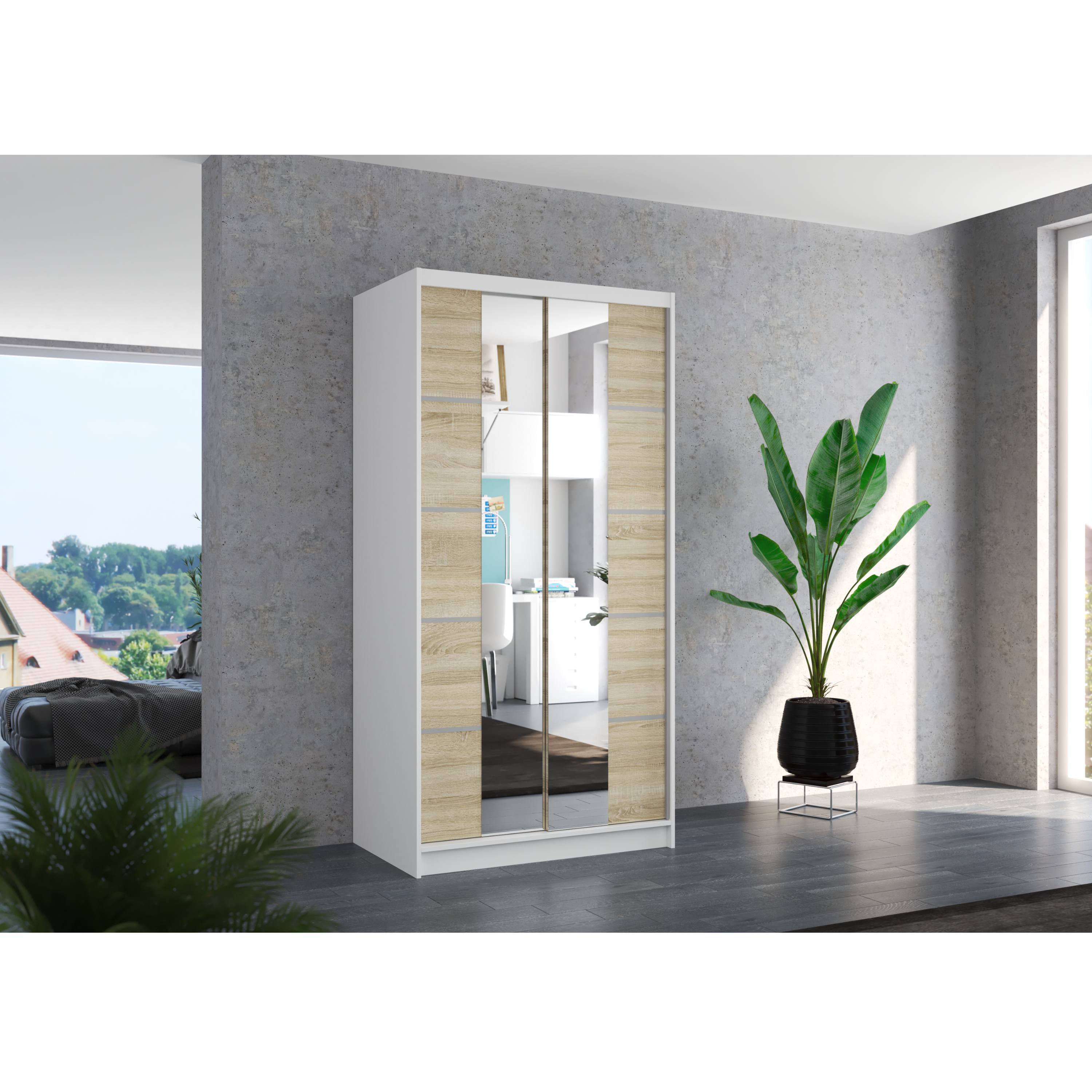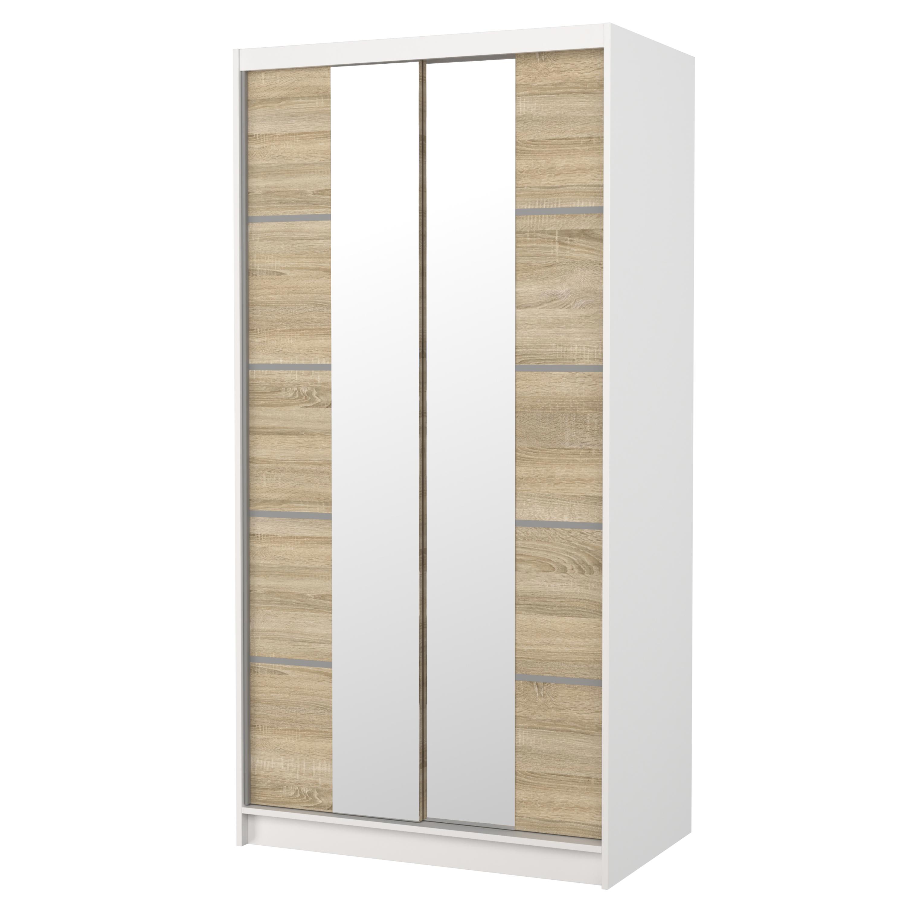 Skříň je vybavena párem posuvných dveří, které se neotevírají do prostoru a šetří tak spoustu cenného místa vně i uvnitř skříně. Součástí dveří jsou také praktické zrcadlové plochy, díky kterým si můžete kdykoli upravit svůj vzhled. Vnitřní prostor je vybaven celkem 4 policemi, pro přehledné uložení poskládaného oblečení nebo i sezonních doplňků, a také šatní tyčí, která je ideální pro zavěšení objemných nebo mačkavých oděvů. Skříň je vyrobena z laminovaného dřevěného materiálu doplněného o ABS hrany chránící před mechanickým poškozením.