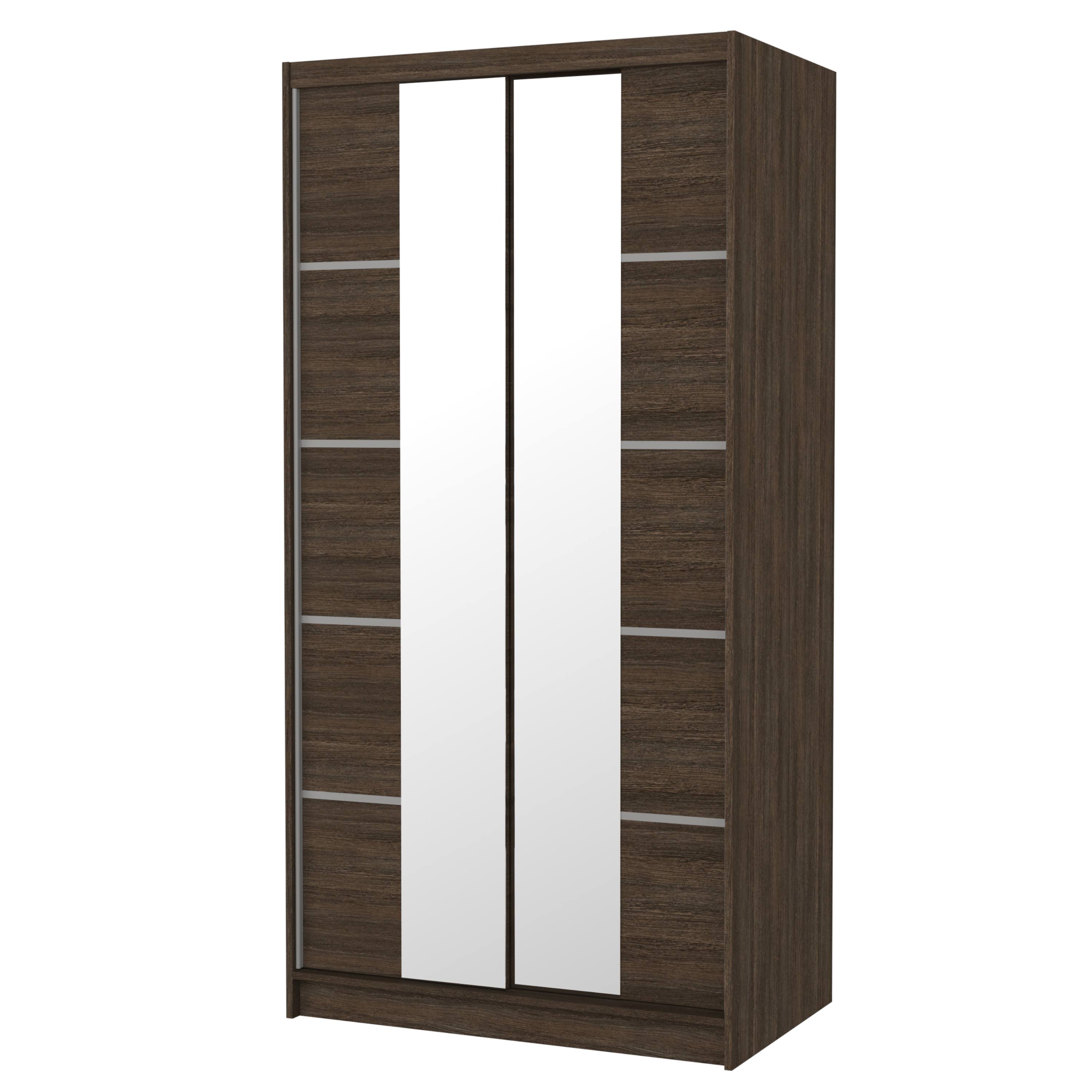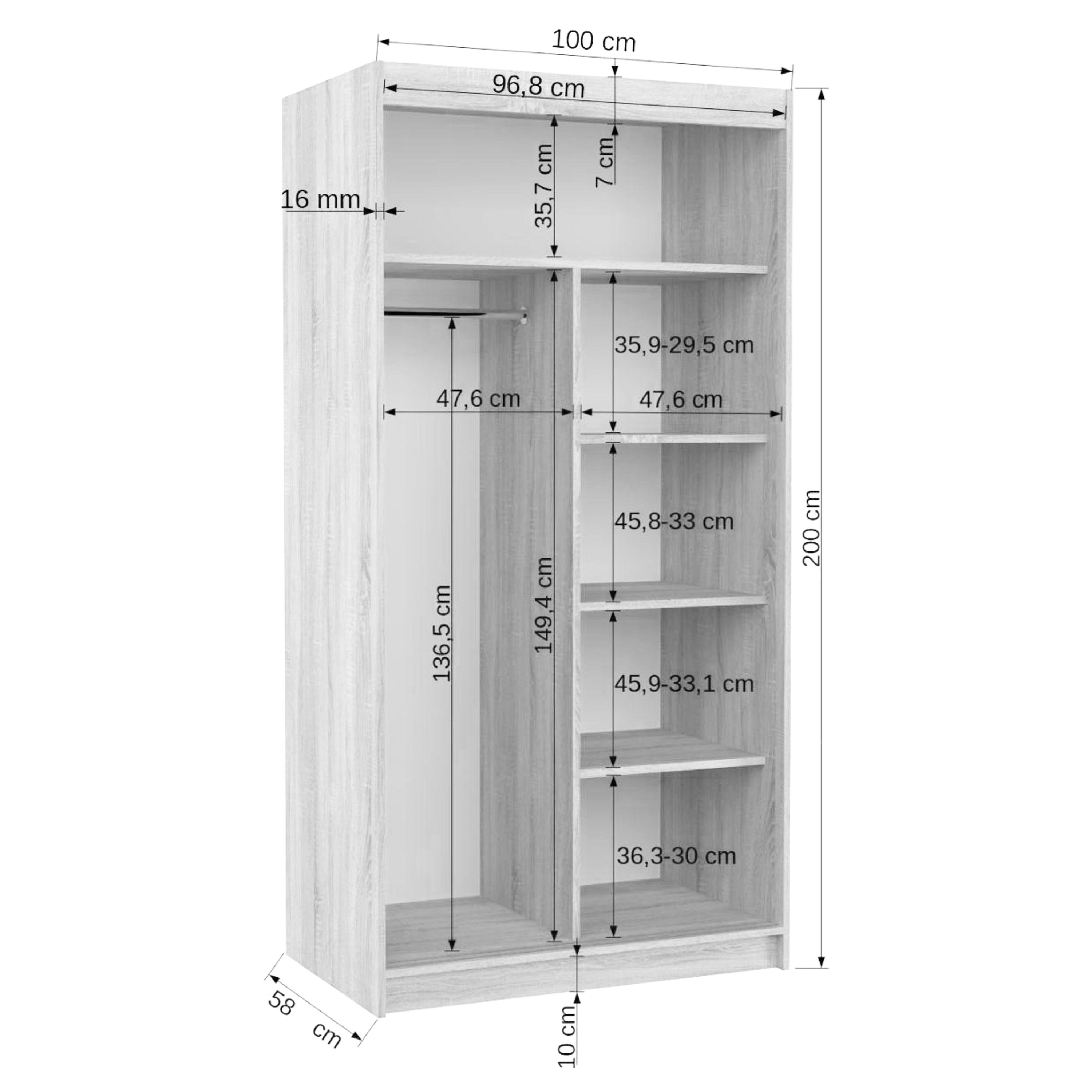 Skříň je vybavena párem posuvných dveří, které se neotevírají do prostoru a šetří tak spoustu cenného místa vně i uvnitř skříně. Součástí dveří jsou také praktické zrcadlové plochy, díky kterým si můžete kdykoli upravit svůj vzhled. Vnitřní prostor je vybaven celkem 4 policemi, pro přehledné uložení poskládaného oblečení nebo i sezonních doplňků, a také šatní tyčí, která je ideální pro zavěšení objemných nebo mačkavých oděvů. Skříň je vyrobena z laminovaného dřevěného materiálu doplněného o ABS hrany chránící před mechanickým poškozením.