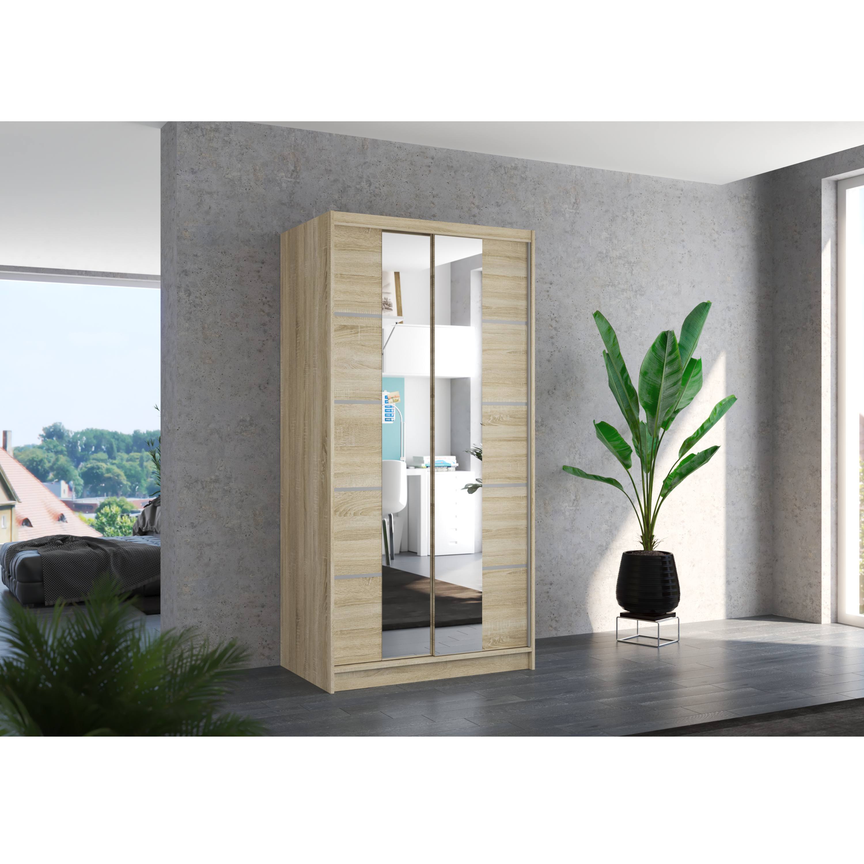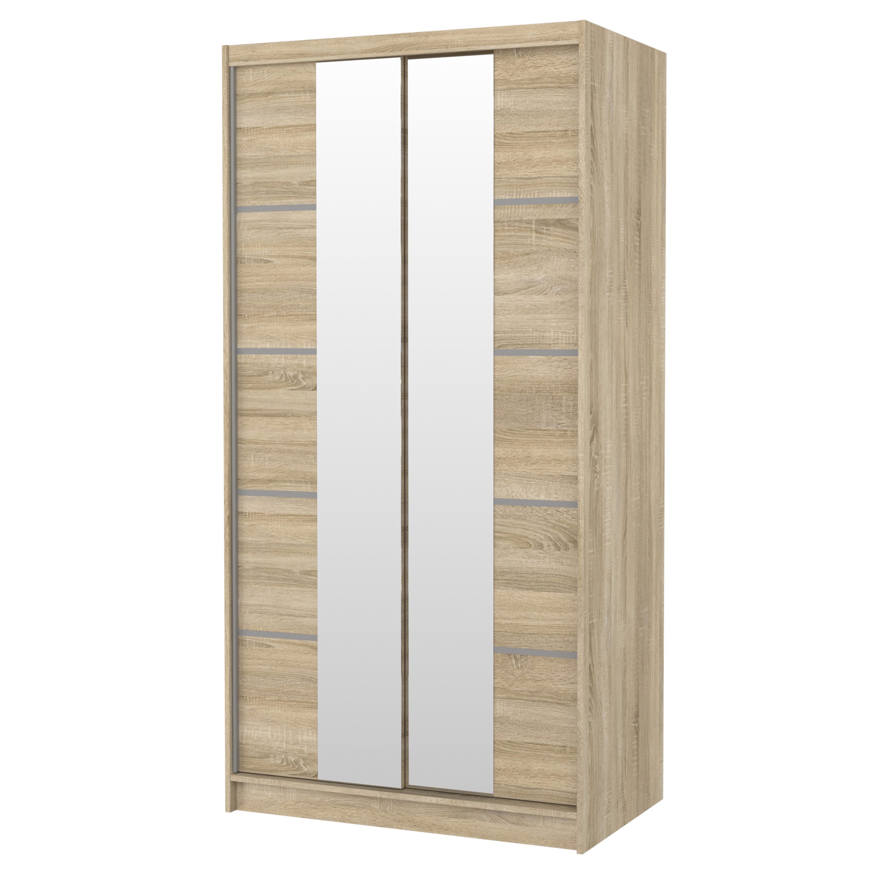 Skříň je vybavena párem posuvných dveří, které se neotevírají do prostoru a šetří tak spoustu cenného místa vně i uvnitř skříně. Součástí dveří jsou také praktické zrcadlové plochy, díky kterým si můžete kdykoli upravit svůj vzhled. Vnitřní prostor je vybaven celkem 4 policemi, pro přehledné uložení poskládaného oblečení nebo i sezonních doplňků, a také šatní tyčí, která je ideální pro zavěšení objemných nebo mačkavých oděvů. Skříň je vyrobena z laminovaného dřevěného materiálu doplněného o ABS hrany chránící před mechanickým poškozením.