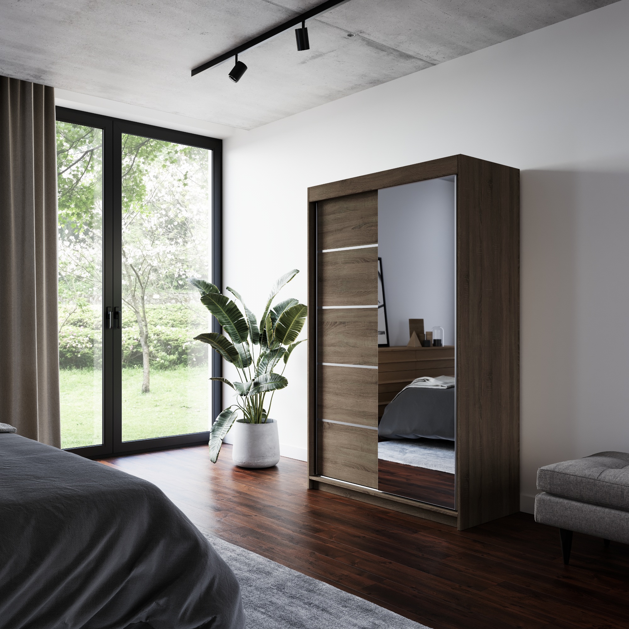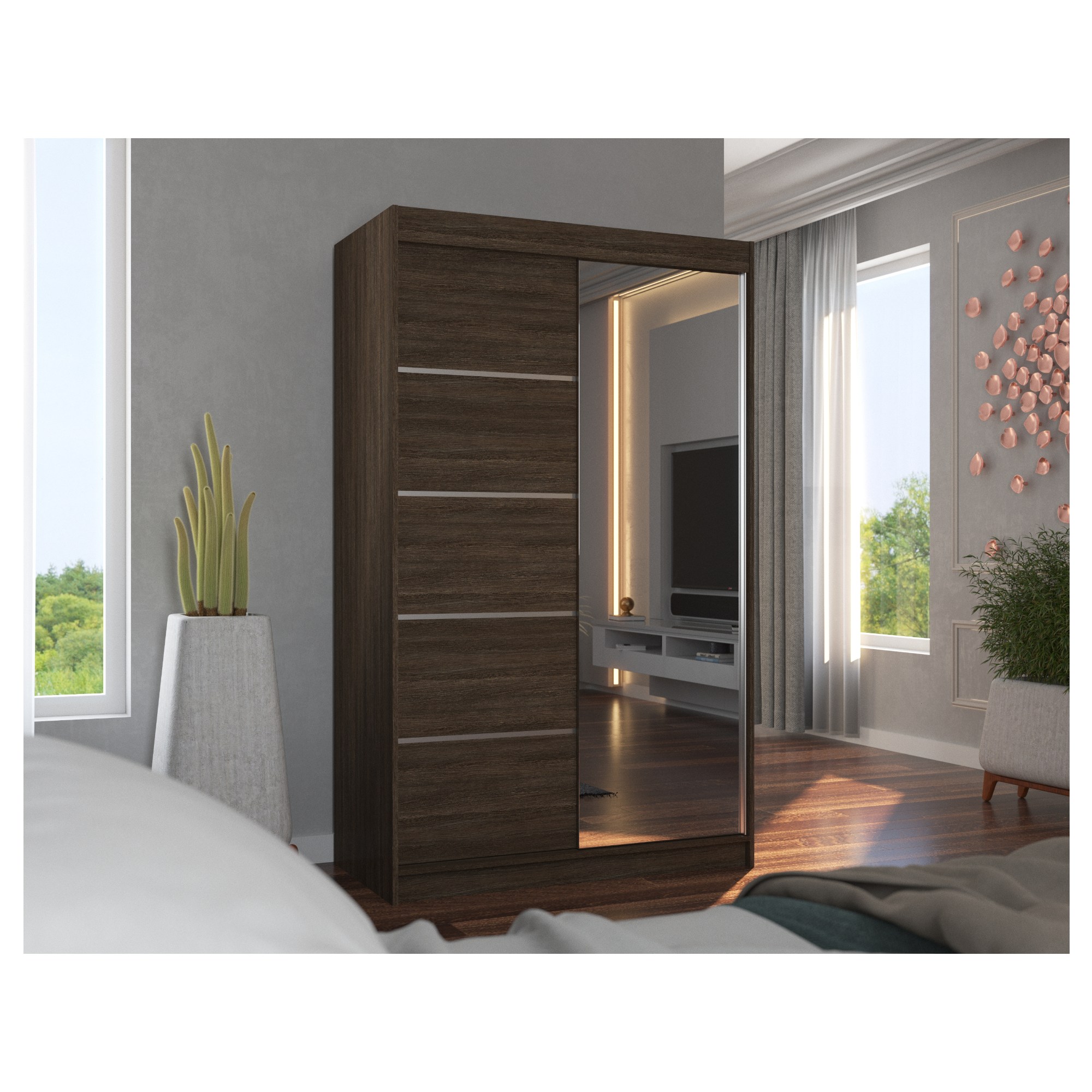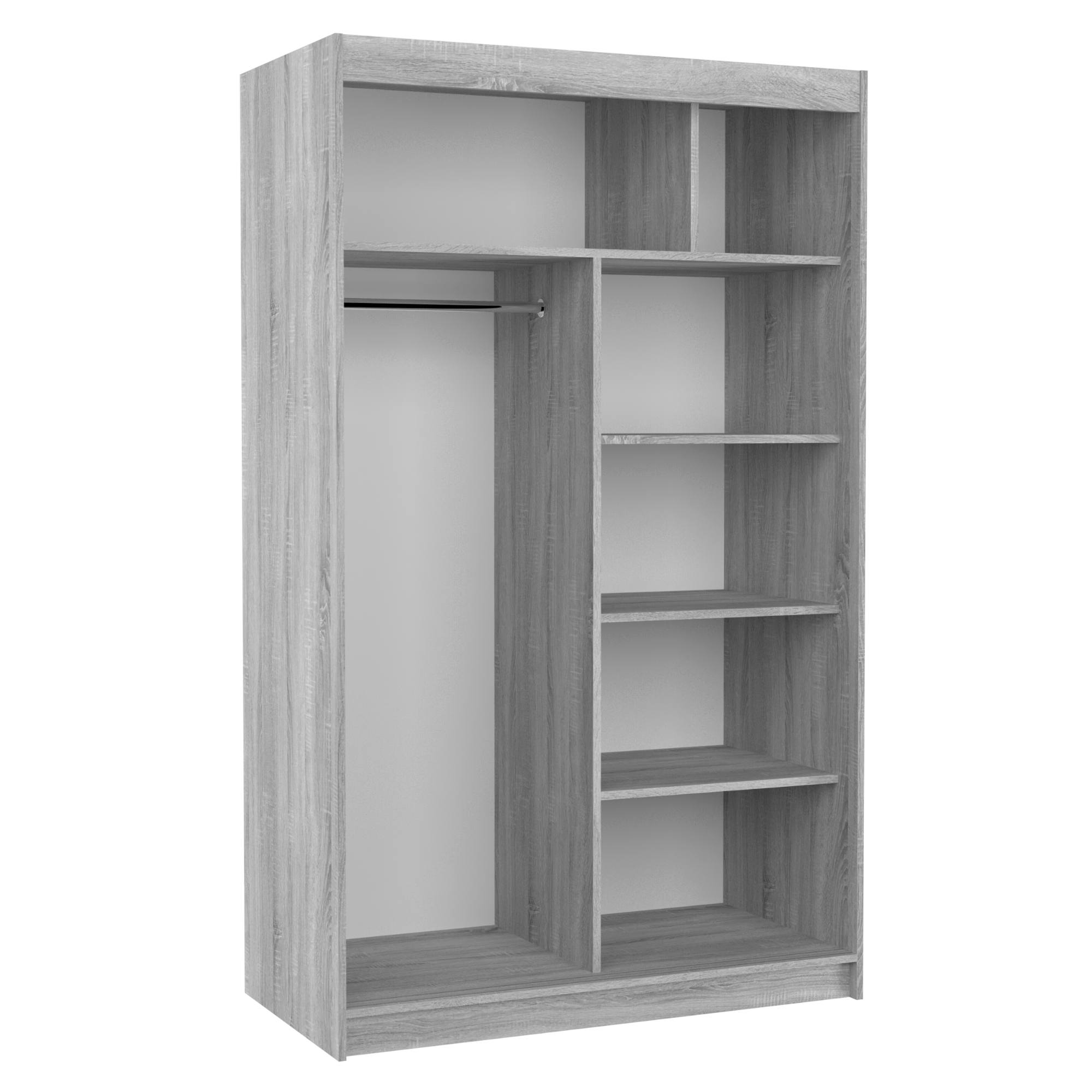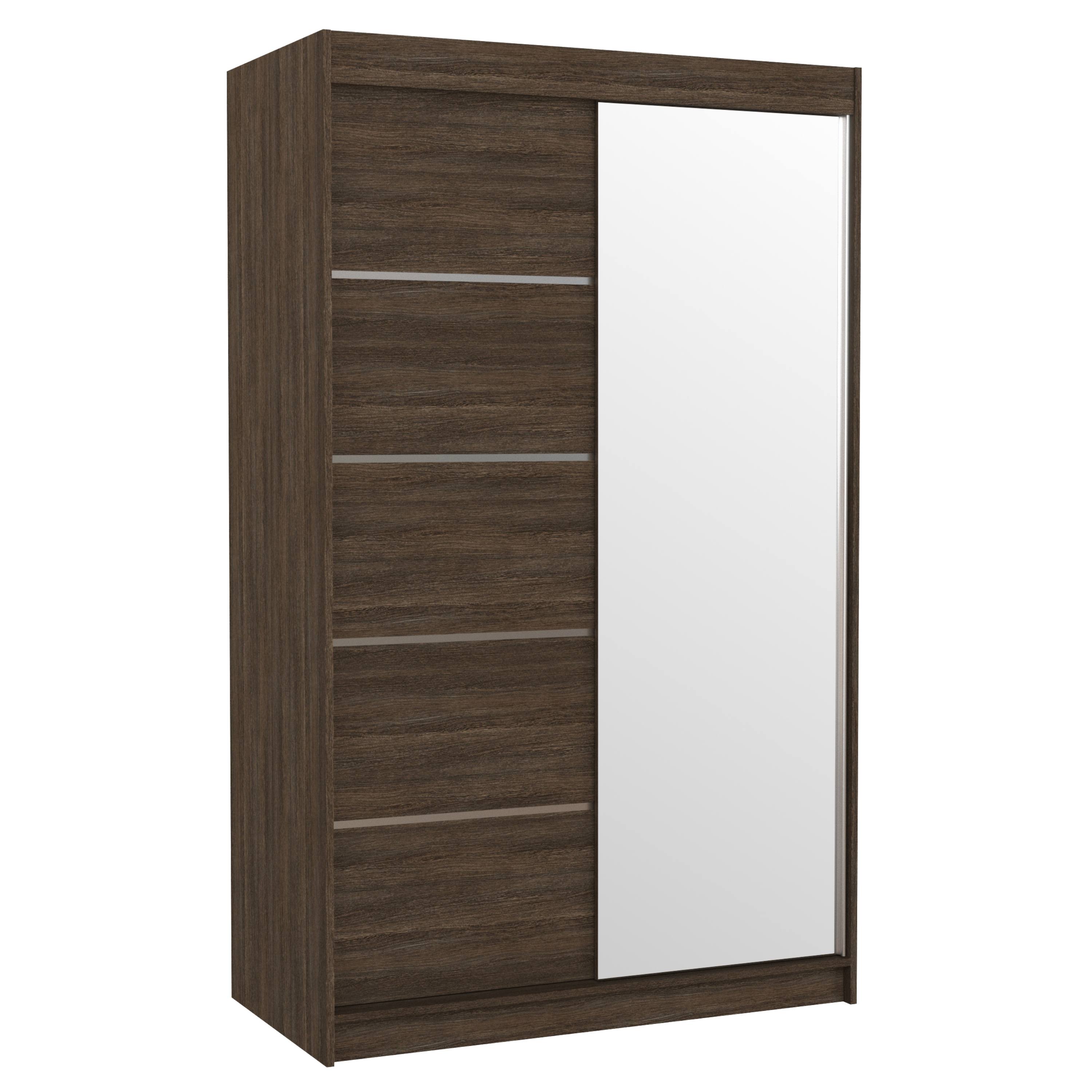 Disponuje posuvnými dveřmi s hliníkovými vodicími lištami pro pohodlné otevírání, které zároveň šetří místo a jsou tak ideální volbou do menších místností. Pravé dveře skříně jsou doplněny zrcadlem, které usnadní vaše přípravy při ranním shonu a zároveň opticky zvětší prostor.