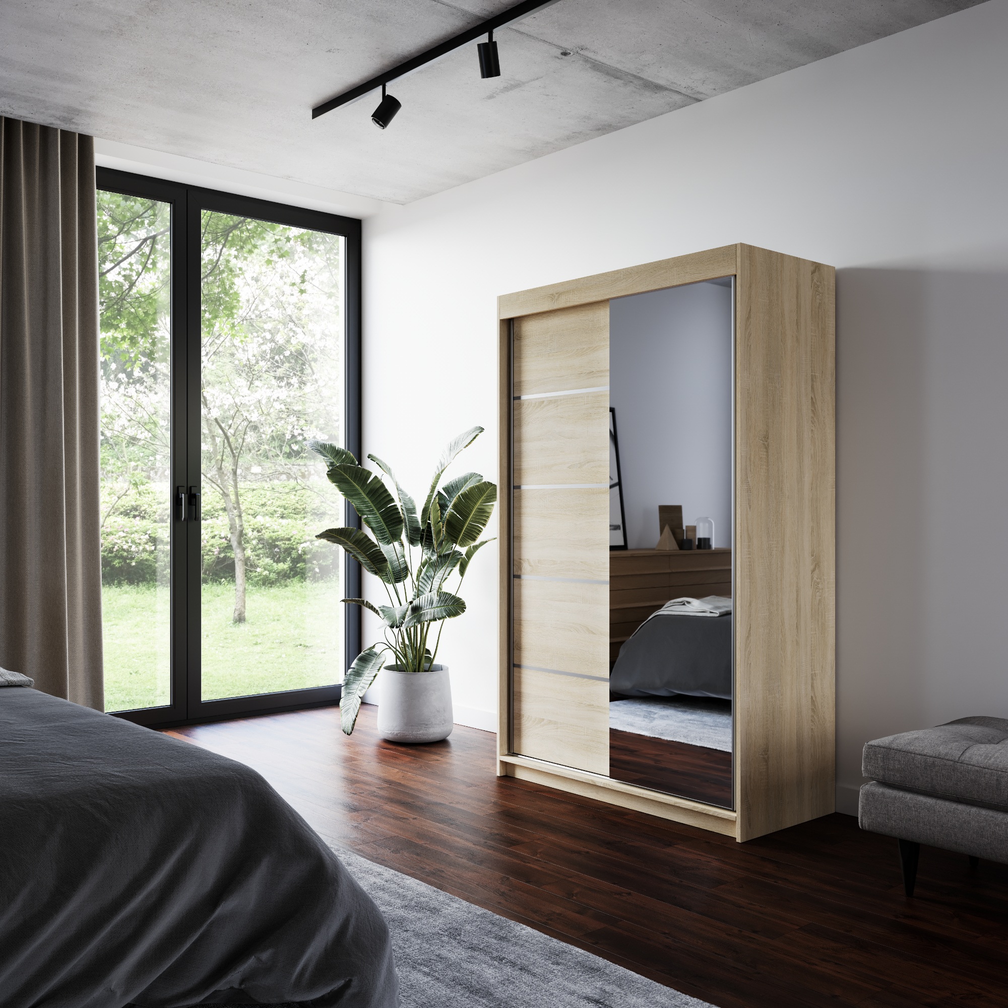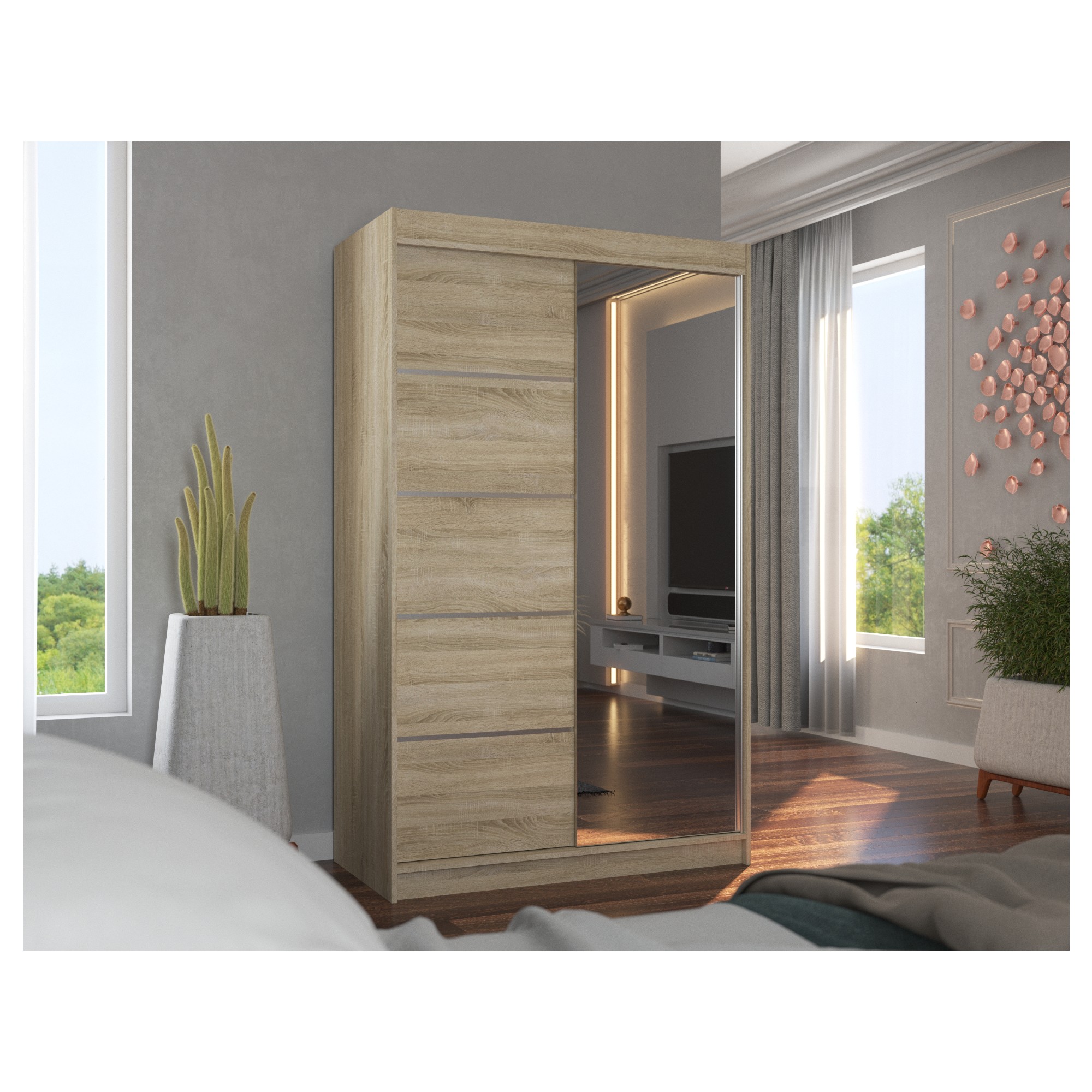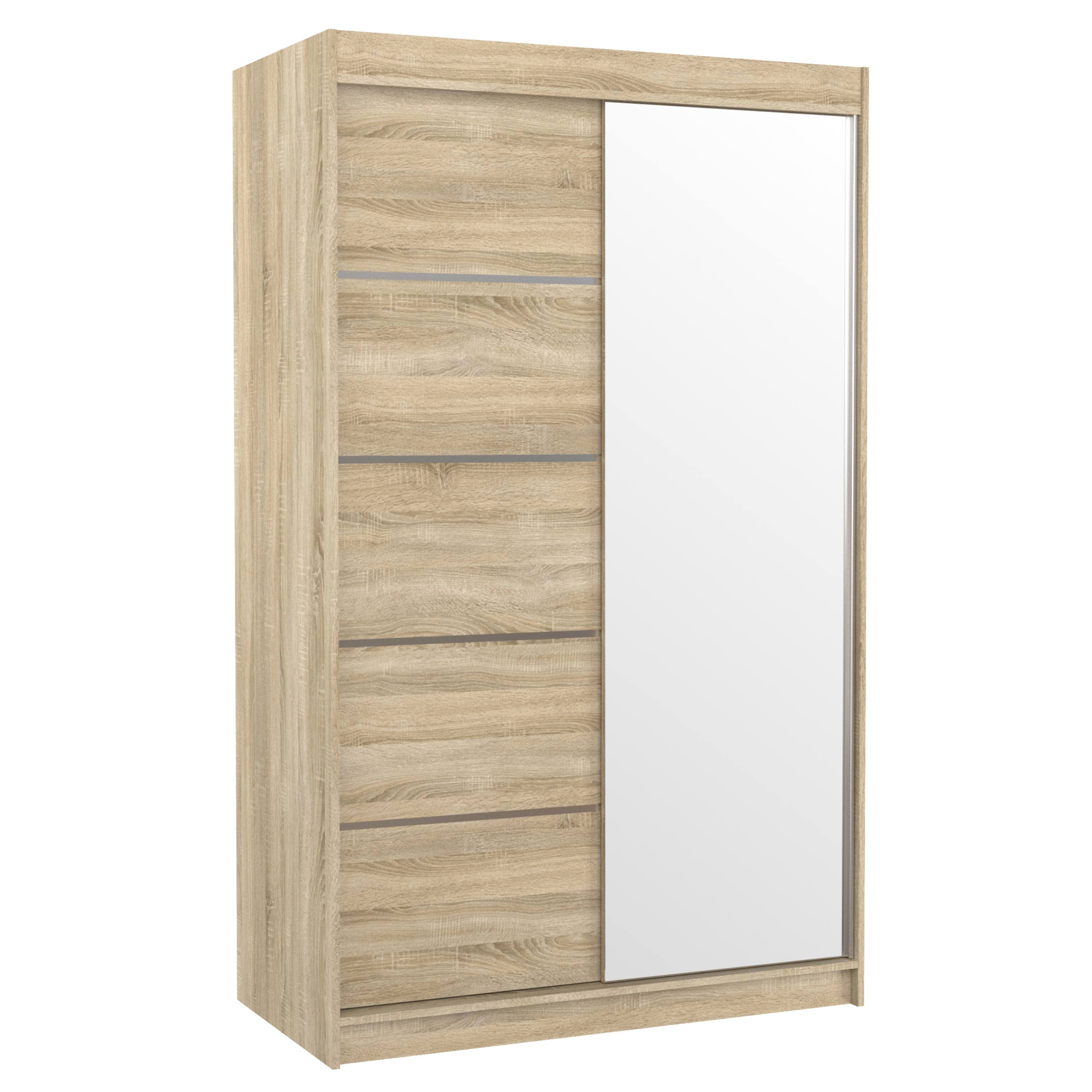 Disponuje posuvnými dveřmi s hliníkovými vodicími lištami pro pohodlné otevírání, které zároveň šetří místo a jsou tak ideální volbou do menších místností. Pravé dveře skříně jsou doplněny zrcadlem, které usnadní vaše přípravy při ranním shonu a zároveň opticky zvětší prostor.
