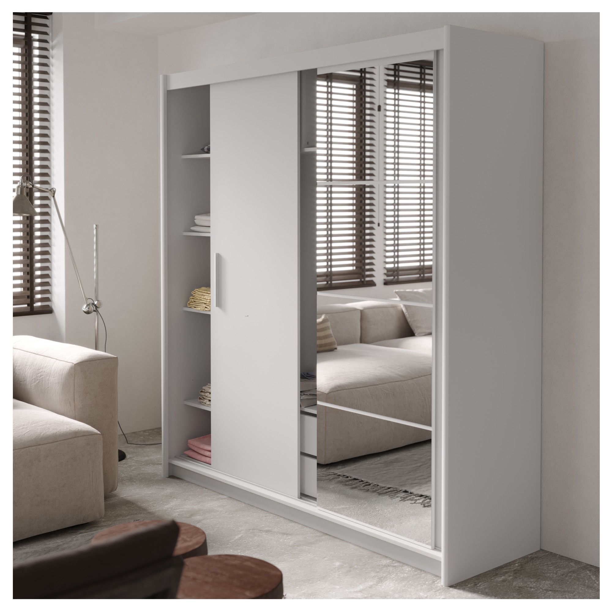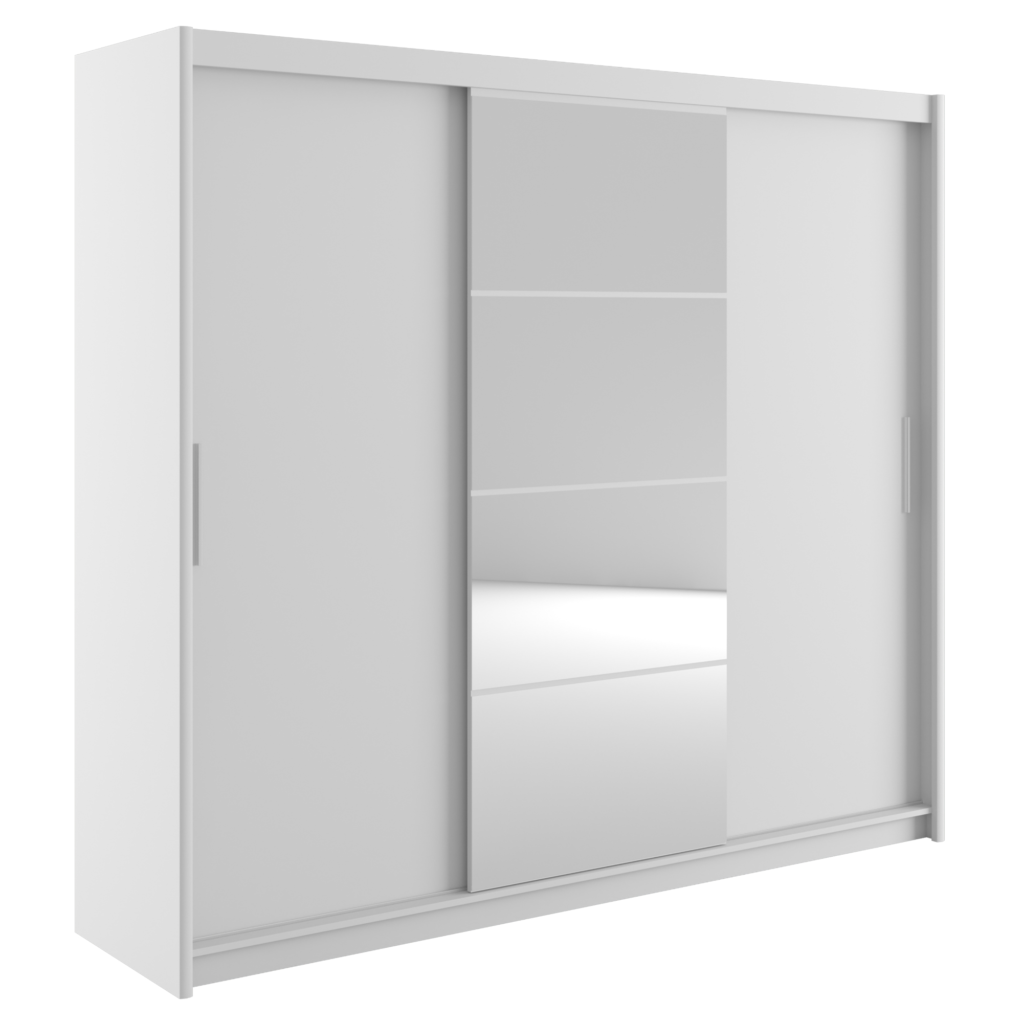 Úložný prostor je rozčleněn do 3 hlavních bloků. Prostor za levými dveřmi obsahuje 3 vložené police, které bez problému pojmou poskládané oblečení, úložné boxy s doplňky či lůžkoviny. Prostor za prostředními i pravými dveřmi je vyplněn 1 prostornou šatní tyčí a ty umožňují pohodlné zavěšení větších oděvů nebo těch z mačkavých materiálů. Prostřední blok navíc obsahuje 2 praktické zásuvky ve spodní částí. Poslední součástí vnitřního vybavení jsou 2 mezipatrové police v horní části skříně. Skříň uzavírají 3 posuvné dveře s plastovými úchyty pro snadnou manipulaci. Prostřední dveře jsou navíc vyplněny zrcadlovou plochou a vy si tak můžete kdykoli zkontrolovat svůj vzhled. Zrcadlo také zajistí optické zvětšení a prosvětlení interiéru. Skříň je vyrobena z laminované dřevotřísky nenáročné na údržbu.