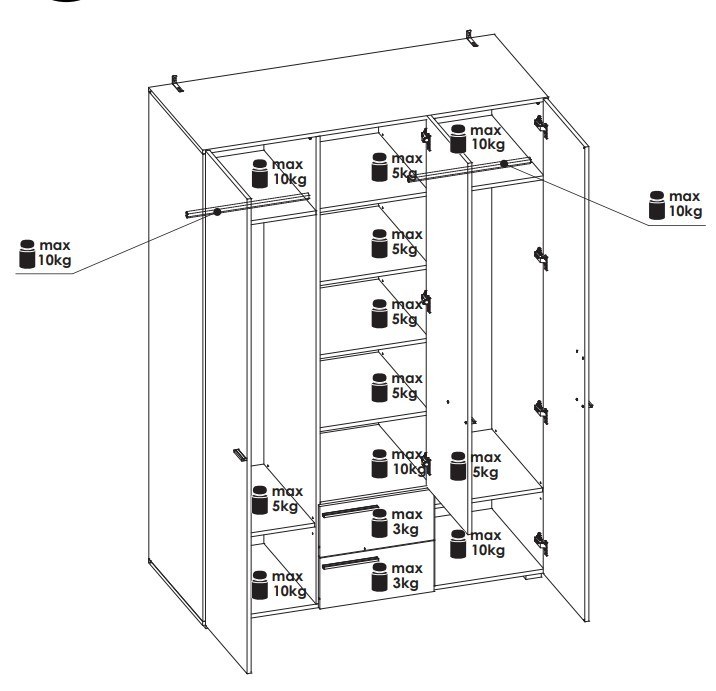 - 8 vložených polic, 2 šatní tyče a 2 zásuvky