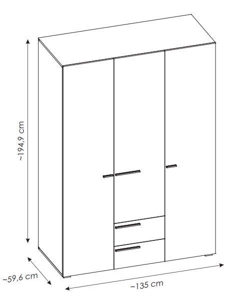 Skříň je uzavíratelná pomocí 2 otočných dveří, které umožňují maximální využití vnitřního prostoru. Za nimi se nachází celkem 8 vložených polic a 2 šatní tyče, které nabízí dostatek místa pro přehledné uložení šatstva, doplňků, ale i obuvi nebo lůžkovin. Dodatečný úložný prostor poskytují ještě 2 praktické zásuvky, které jsou ideální na doplňky či spodní prádlo. Skříň je vyrobena z laminovaného dřevěného materiálu jehož povrch není náročný na údržbu.