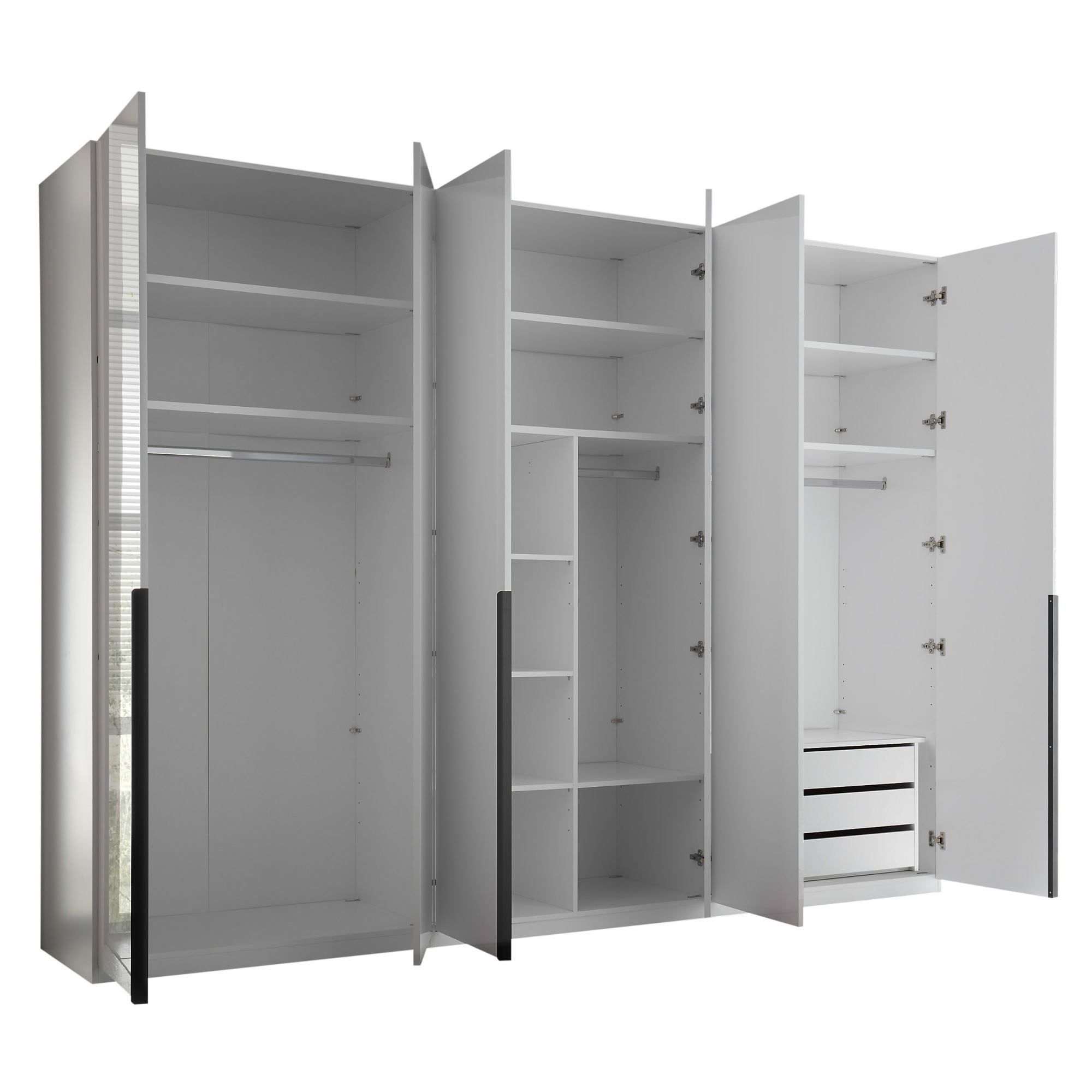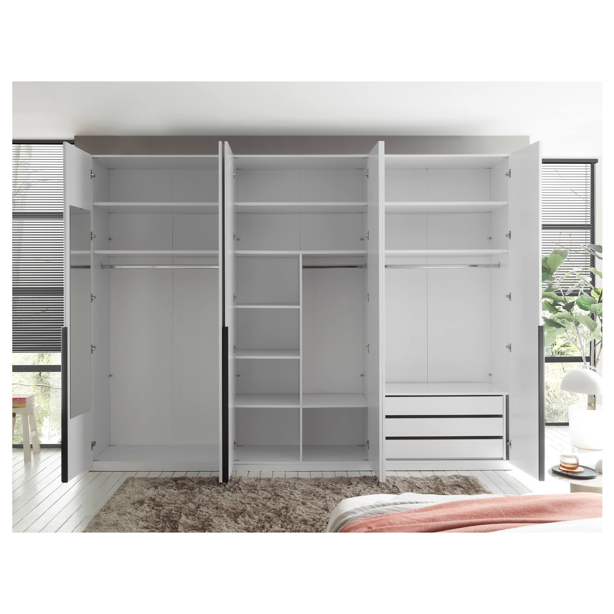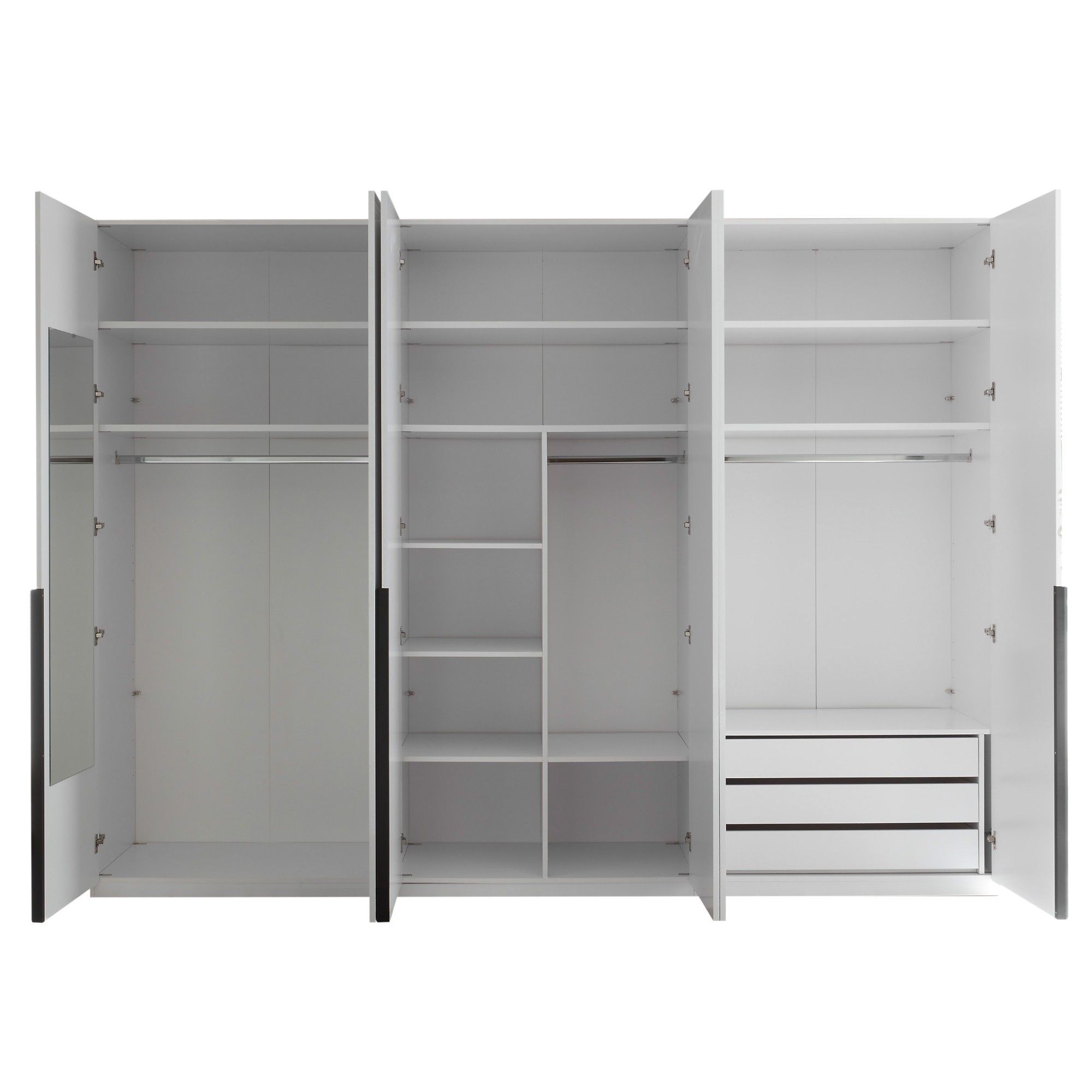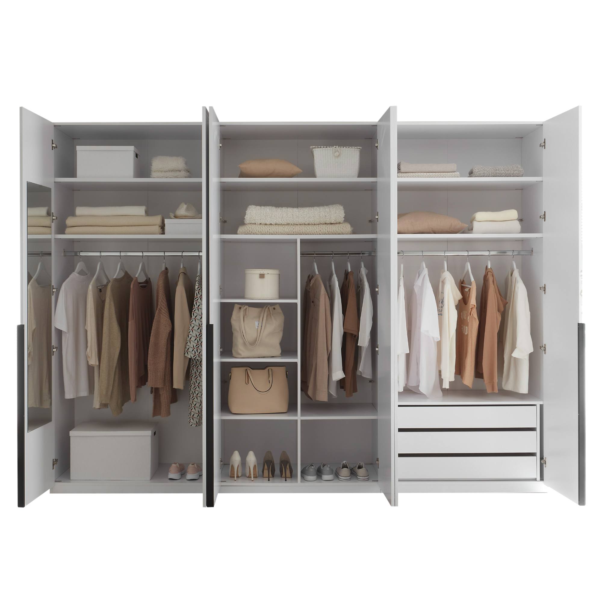Uvnitř naleznete bohatý úložný prostor pro přehlednou organizaci vašeho oblečení. Skříň je rozdělena na 3 části. Levá strana je vybavena 2 policemi, 1 šatní tyčí a 1 zrcadlem umístěným na vnitřní straně dveří. V prostřední části naleznete 2 police v horní části, další 3 police v úzkém postranním panelu a 1 šatní tyč s další policí. Pravá strana je vybavena 2 policemi, 1 šatní tyčí a 3 zásuvkami. Vrchní police nabízejí ideální místo pro uložení lůžkovin či úložných boxů. Šatní tyče jsou perfektním pomocníkem pro zavěšení šatů, kabátů či obleků, díky nimž zabráníte pomačkání oděvů. Zásuvky lze využít pro uskladnění menších doplňků. Každá část je vybavena otočnými dveřmi s 1 úchytem. Dveře jsou vyvedeny ve vysokém lesku, který dodává skříni luxusní vzhled.