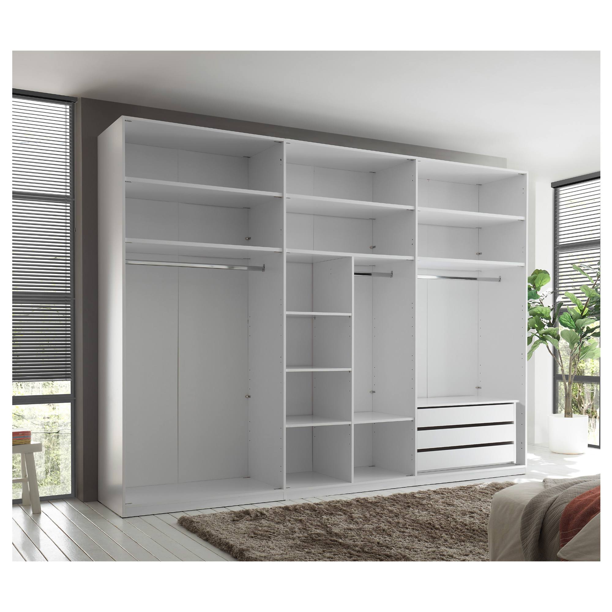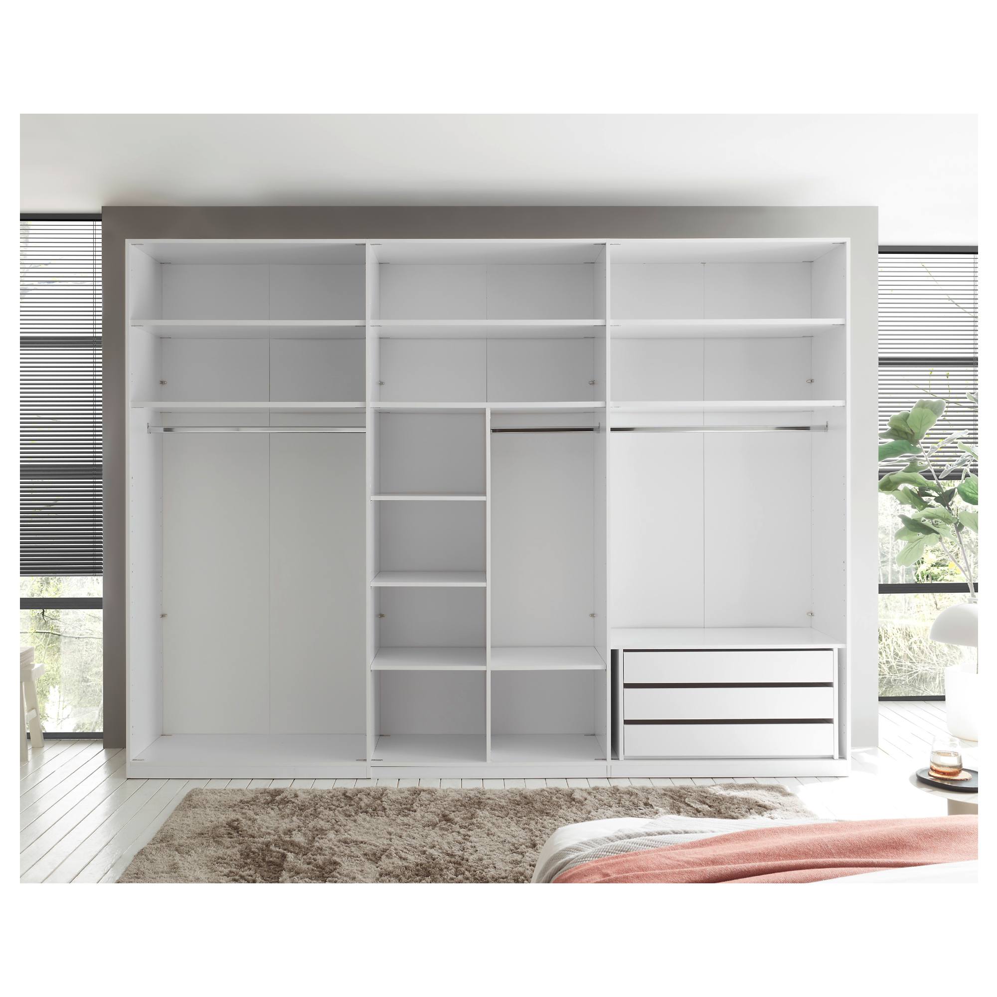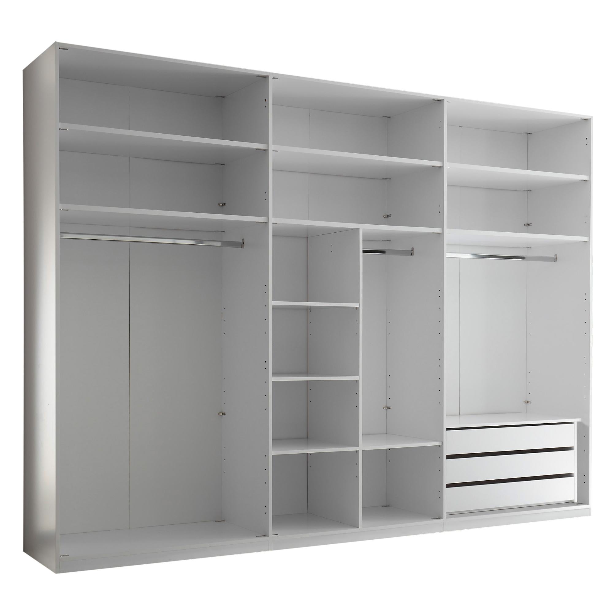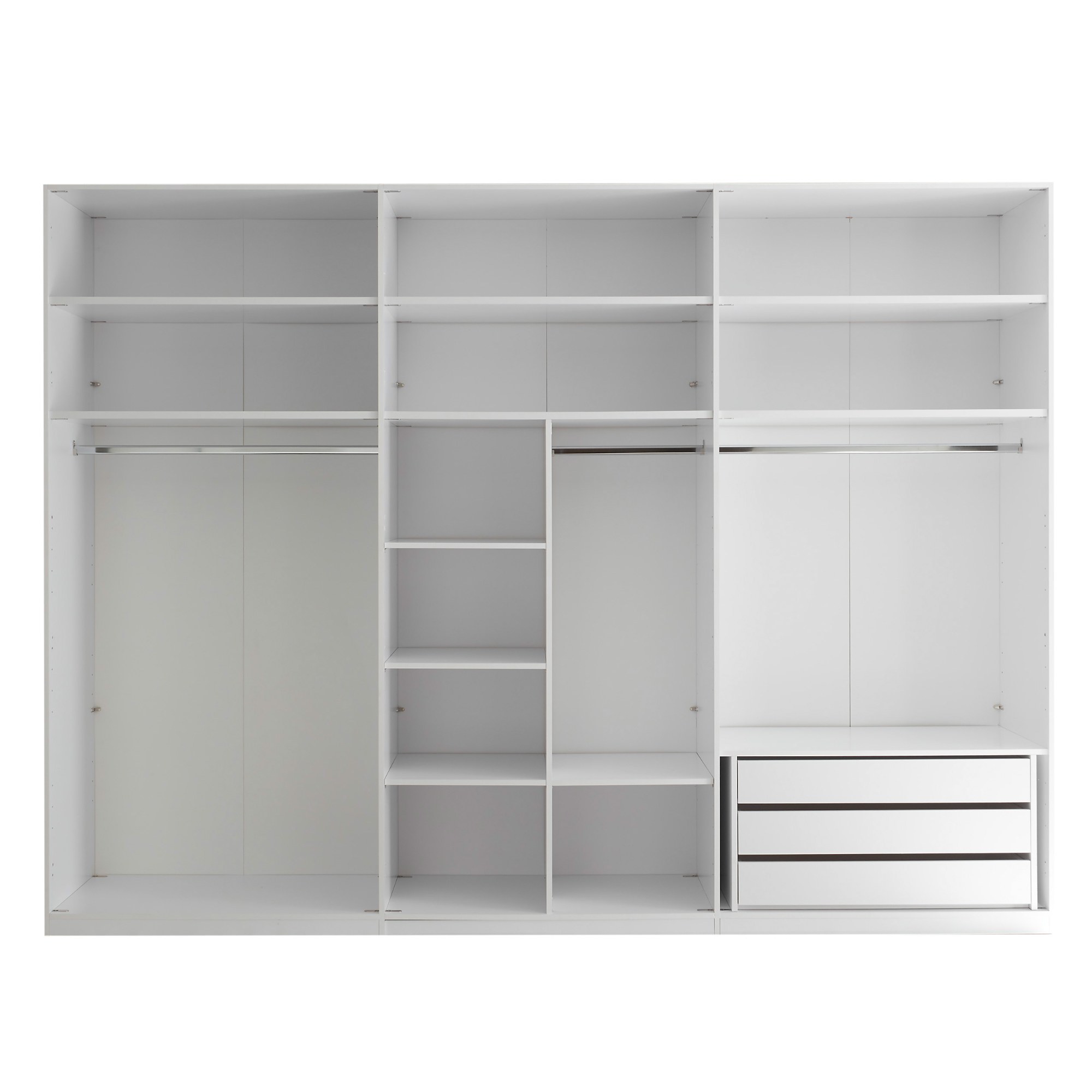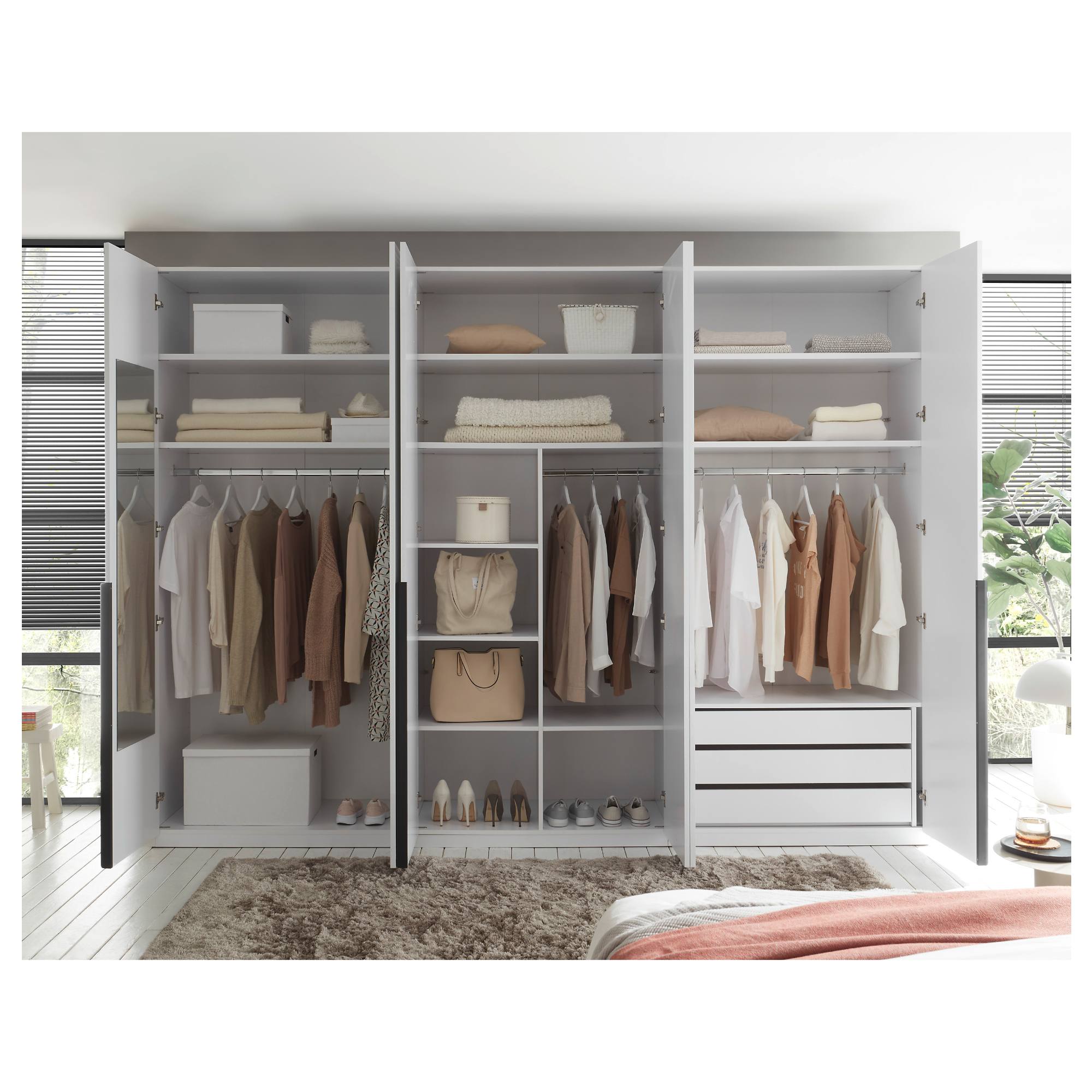 Uvnitř naleznete bohatý úložný prostor pro přehlednou organizaci vašeho oblečení. Skříň je rozdělena na 3 části. Levá strana je vybavena 2 policemi, 1 šatní tyčí a 1 zrcadlem umístěným na vnitřní straně dveří. V prostřední části naleznete 2 police v horní části, další 3 police v úzkém postranním panelu a 1 šatní tyč s další policí. Pravá strana je vybavena 2 policemi, 1 šatní tyčí a 3 zásuvkami. Vrchní police nabízejí ideální místo pro uložení lůžkovin či úložných boxů. Šatní tyče jsou perfektním pomocníkem pro zavěšení šatů, kabátů či obleků, díky nimž zabráníte pomačkání oděvů. Zásuvky lze využít pro uskladnění menších doplňků. Každá část je vybavena otočnými dveřmi s 1 úchytem. Dveře jsou vyvedeny ve vysokém lesku, který dodává skříni luxusní vzhled.
