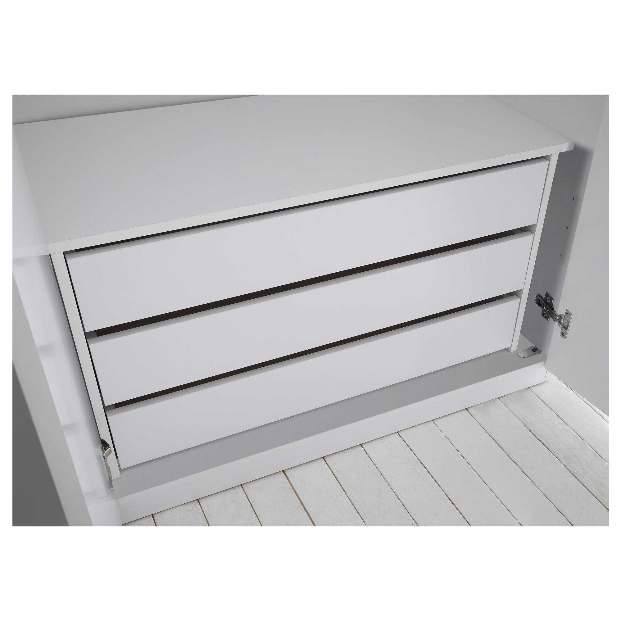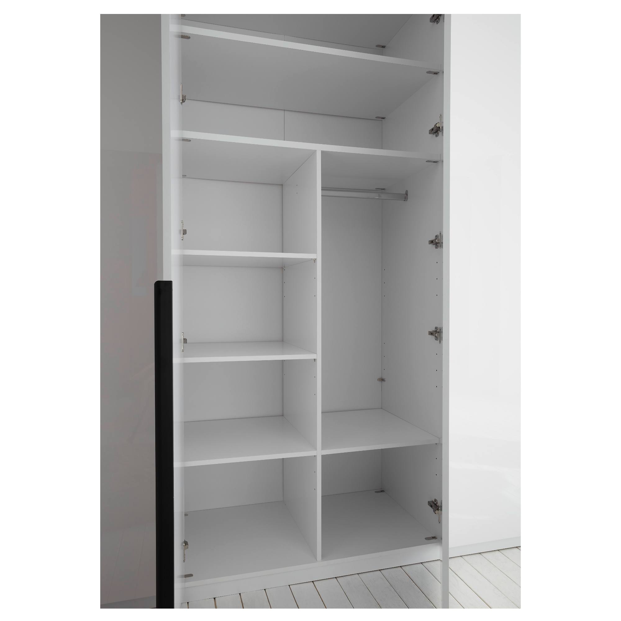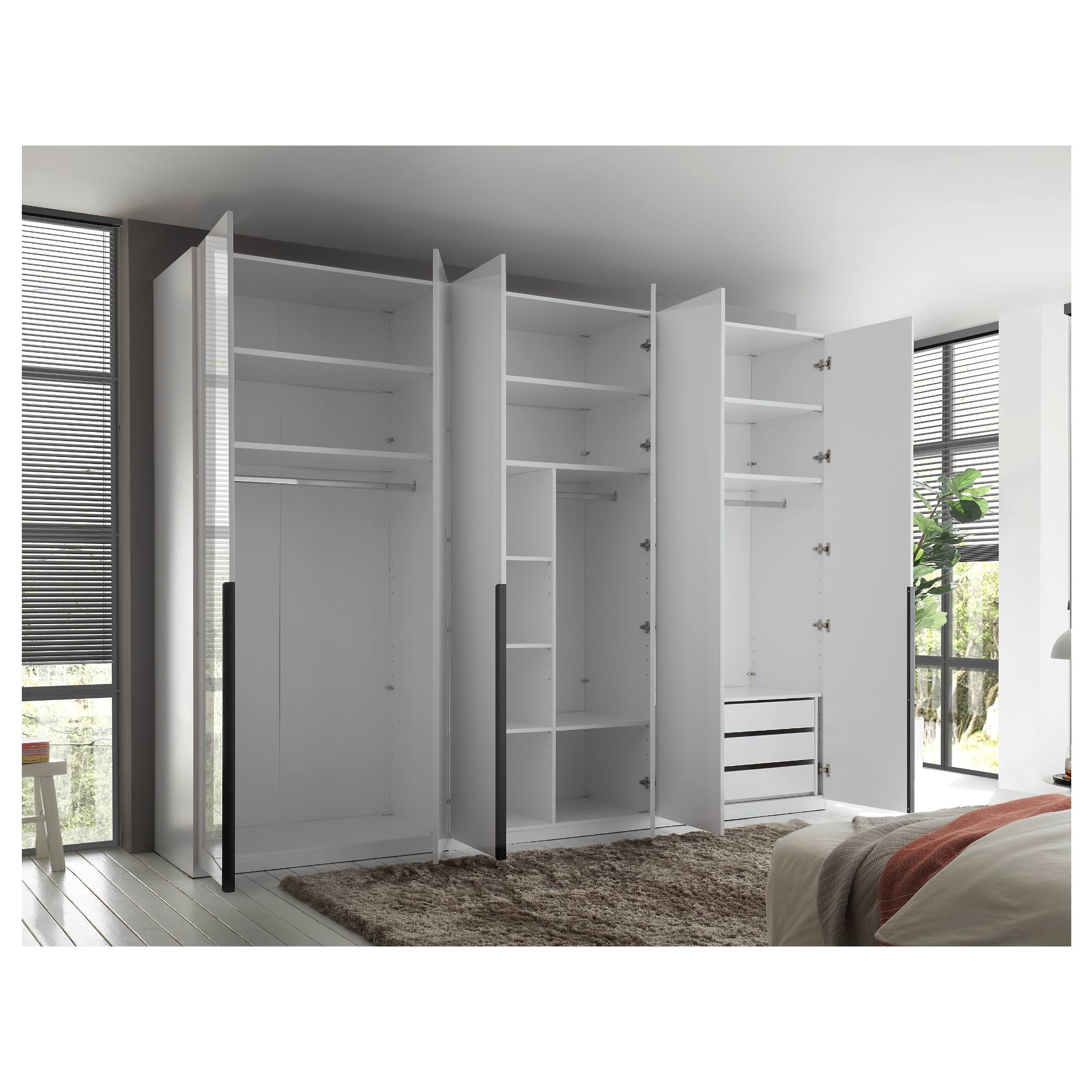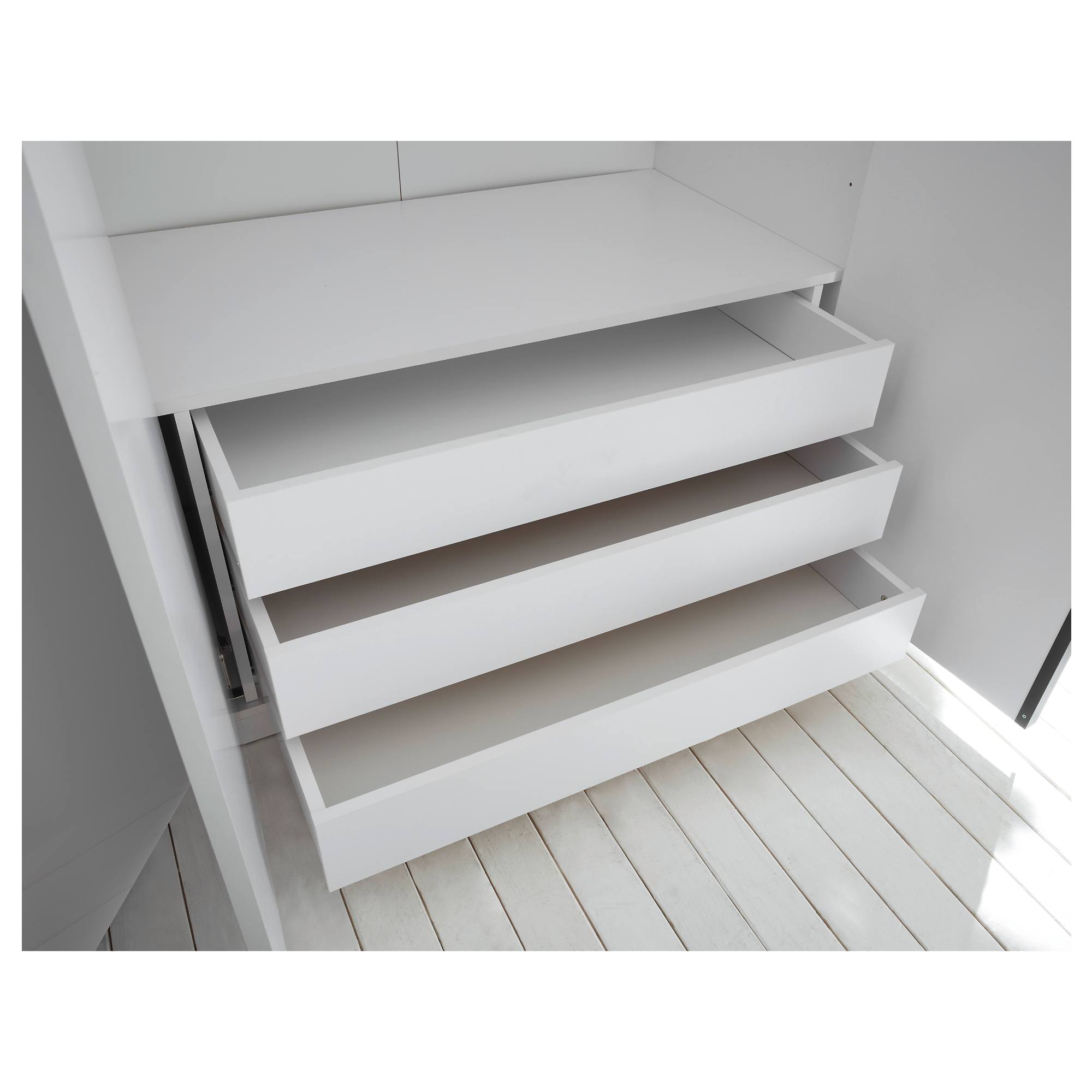 Uvnitř naleznete bohatý úložný prostor pro přehlednou organizaci vašeho oblečení. Skříň je rozdělena na 3 části. Levá strana je vybavena 2 policemi, 1 šatní tyčí a 1 zrcadlem umístěným na vnitřní straně dveří. V prostřední části naleznete 2 police v horní části, další 3 police v úzkém postranním panelu a 1 šatní tyč s další policí. Pravá strana je vybavena 2 policemi, 1 šatní tyčí a 3 zásuvkami. Vrchní police nabízejí ideální místo pro uložení lůžkovin či úložných boxů. Šatní tyče jsou perfektním pomocníkem pro zavěšení šatů, kabátů či obleků, díky nimž zabráníte pomačkání oděvů. Zásuvky lze využít pro uskladnění menších doplňků. Každá část je vybavena otočnými dveřmi s 1 úchytem. Dveře jsou vyvedeny ve vysokém lesku, který dodává skříni luxusní vzhled.