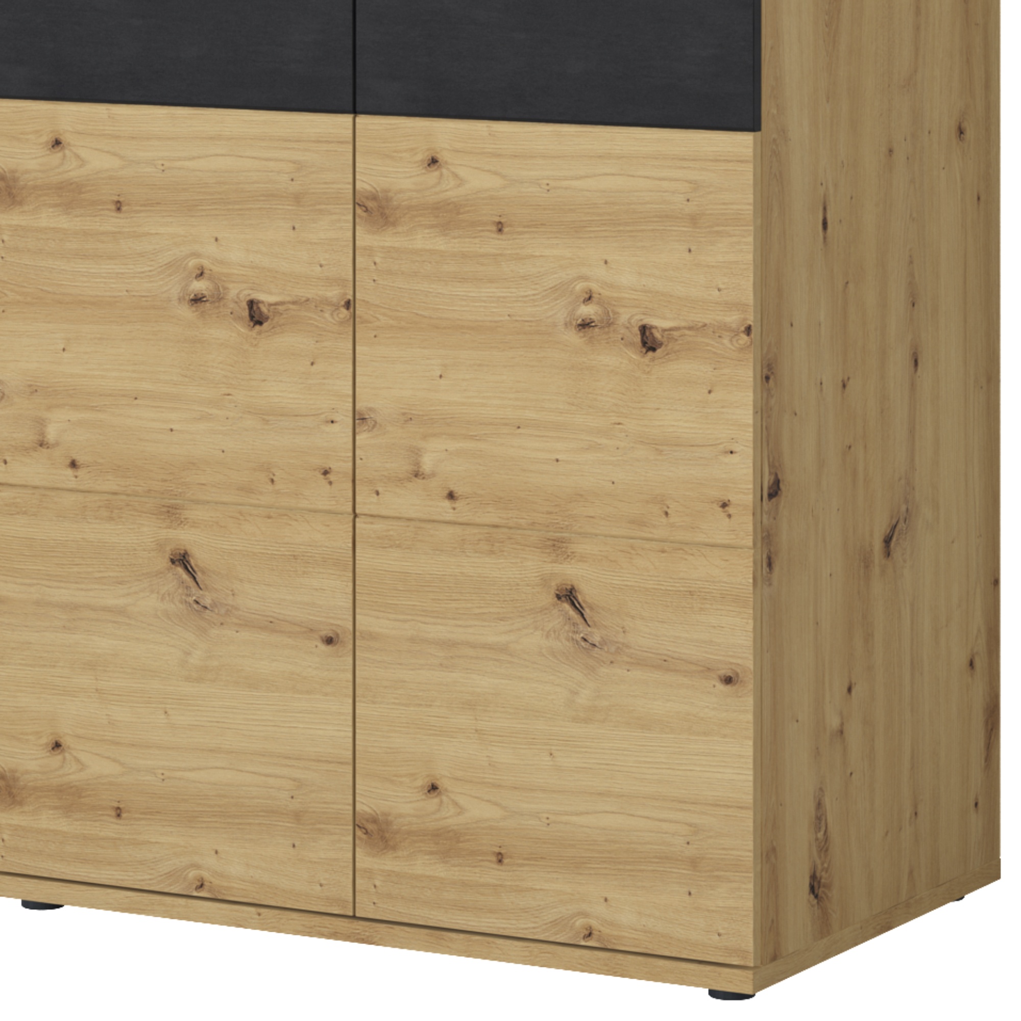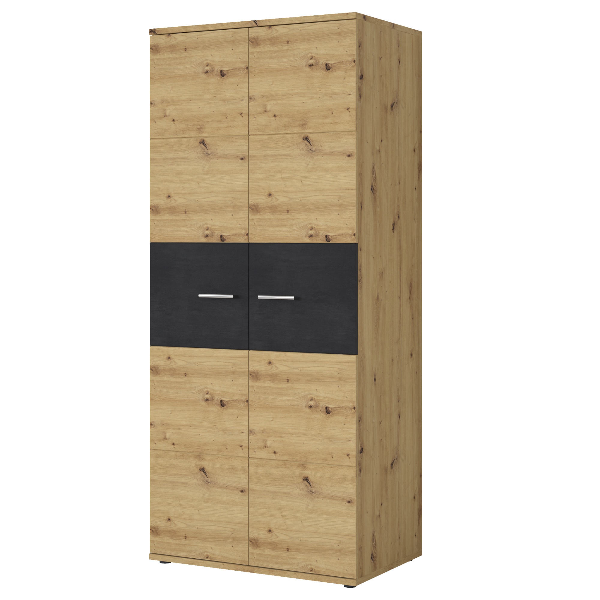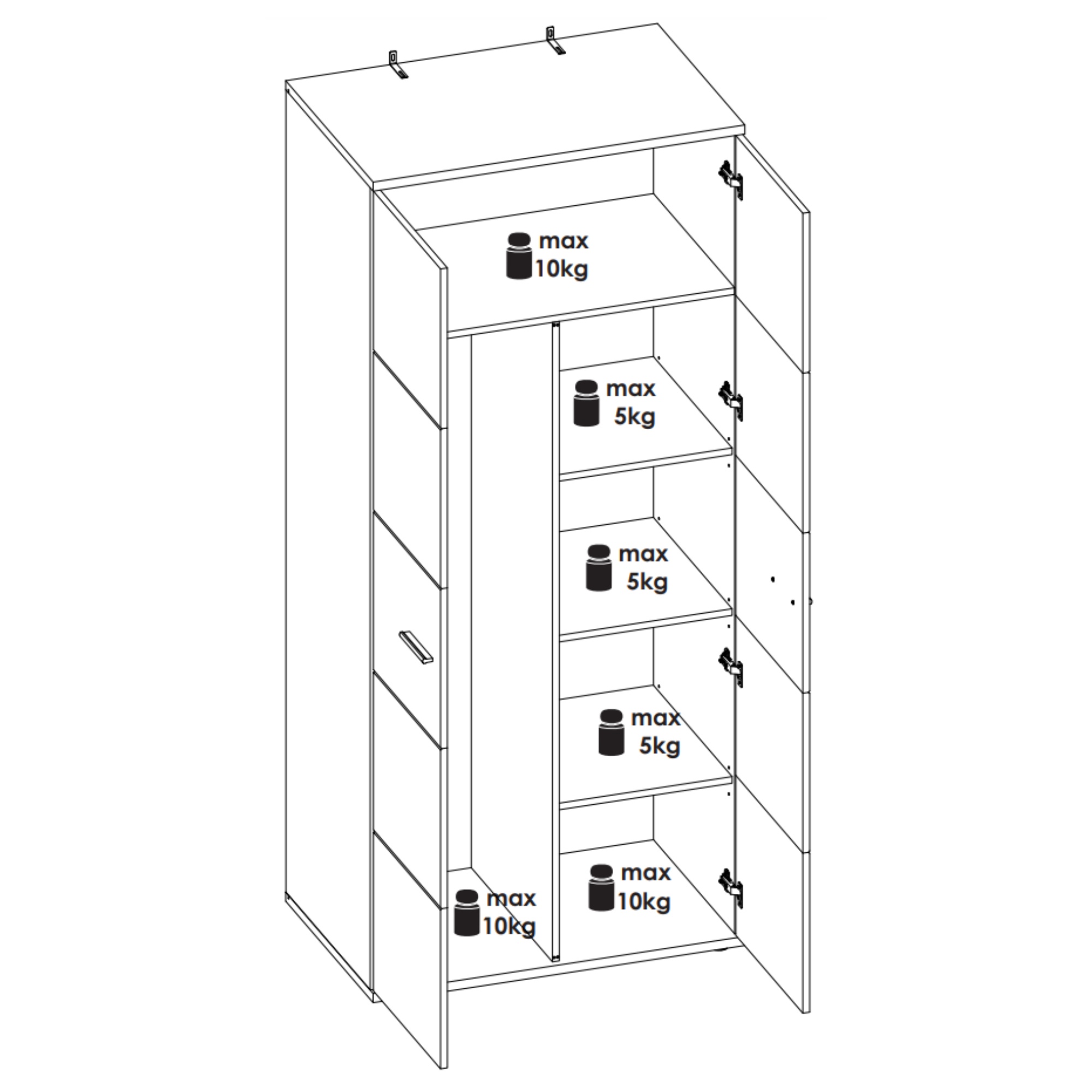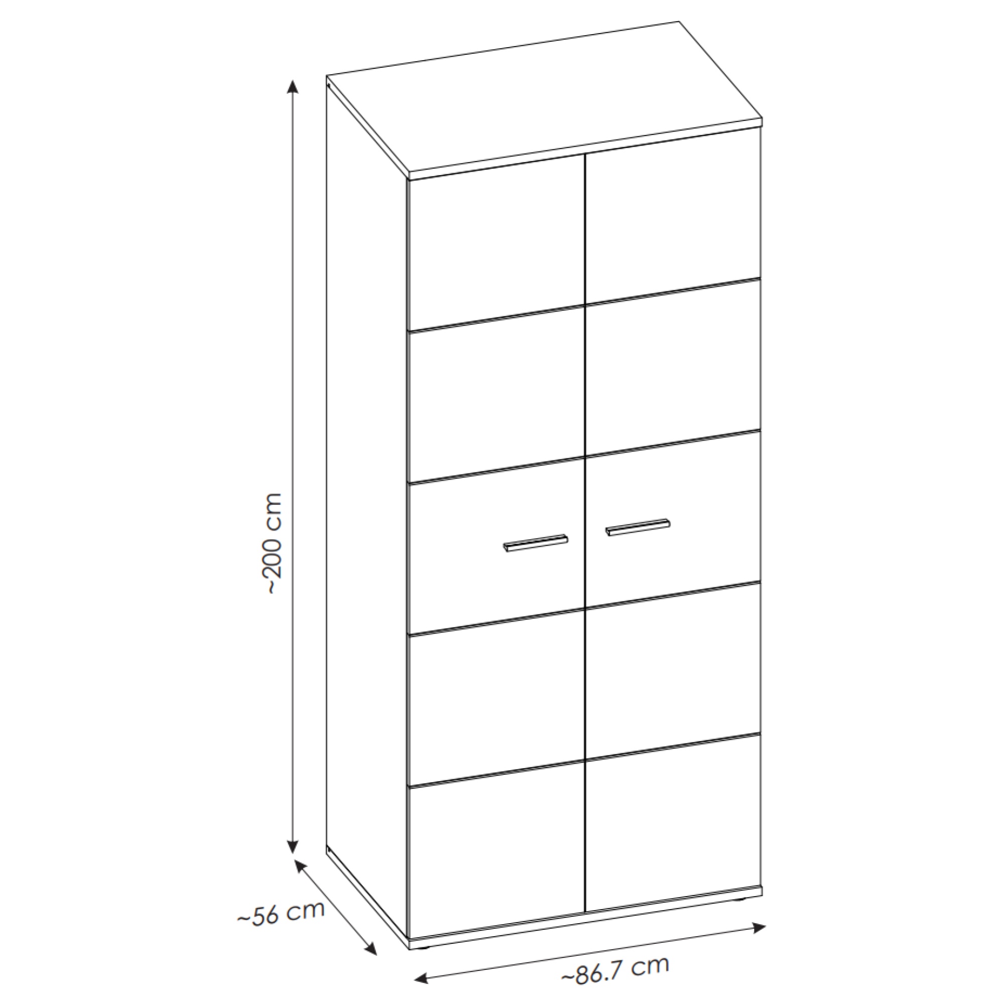 Šatní skříň NICOLAS je kus nábytku, který vám poskytne dostatečně velký úložný prostor a ještě k tomu bude ozdobou pokoje. Za párem dveří se uvnitř nachází prostor rozdělen do dvou částí. Kdy v jedné z této části můžete zavěsit ramínka s vaším oblečením na šatní tyč a v druhé části využijete celkem 3 vložené police, každá s nosností do 5 kg. V horní části se pak ještě nachází, v celé šířce skříně, police největší. Šatní skříň NICOLAS v kombinaci s dalšími elementy stejnojmenné kolekce vytvoří snadno interiér v jednotném designu.