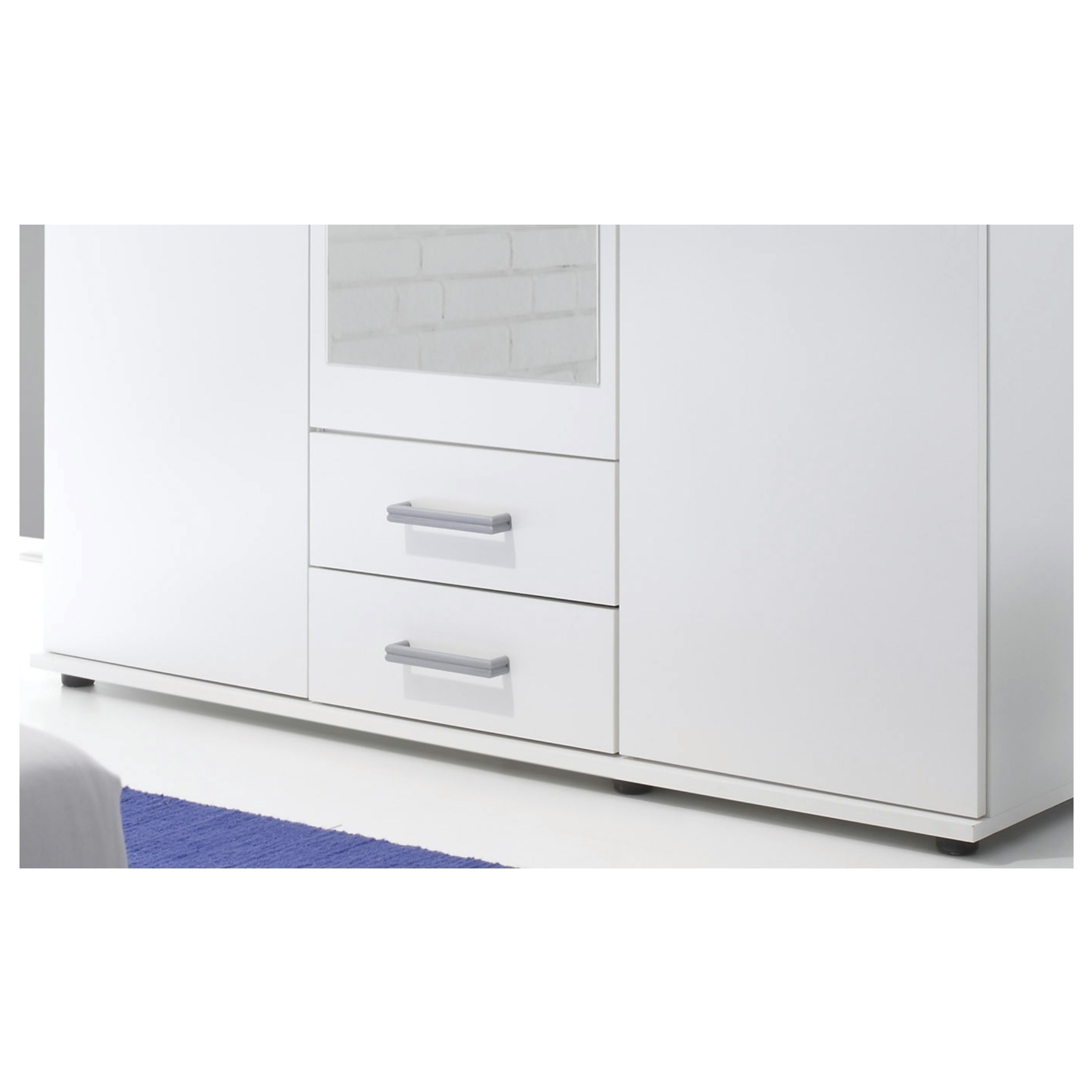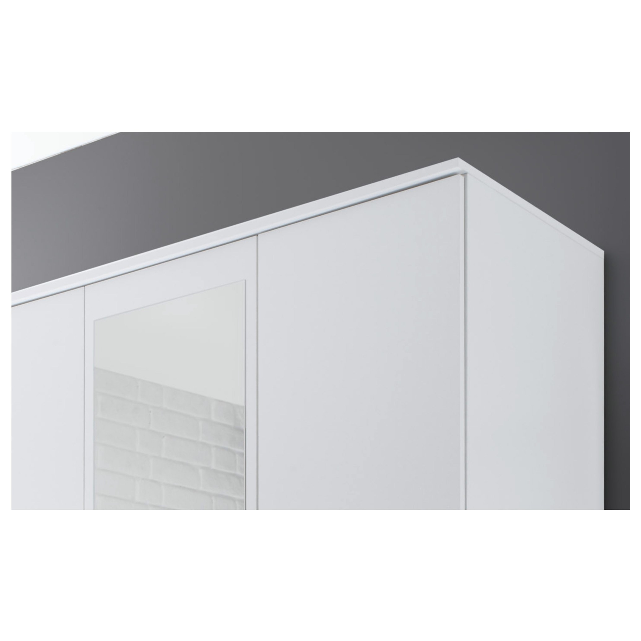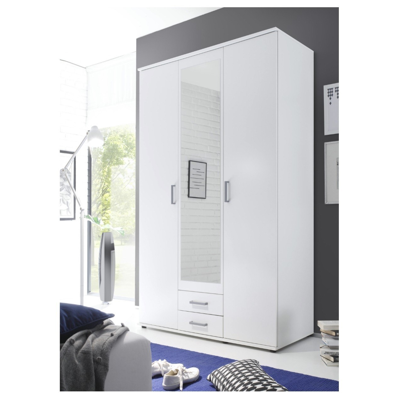 Praktická šatní skříň OTMAR v moderním designu se díky svým rozměrům hodí i do menších ložnic. Určitě oceníte zrcadlo z vnější strany dveří skříně, které se nachází přímo uprostřed a pod ním se v dolní části zároveň nachází 2 zásuvky. Úložný prostor o hloubce 53 cm je uvnitř systematicky rozčleněn – v jednom oddíle se nachází šatní tyč a nad ní vložená police, v druhém oddíle jsou vloženy celkem 3 police. Decentní úchytky usnadňují otevírání. Skříň je vyrobena z laminovaného dřevěného materiálu, který je odolný a nenáročný na údržbu.
