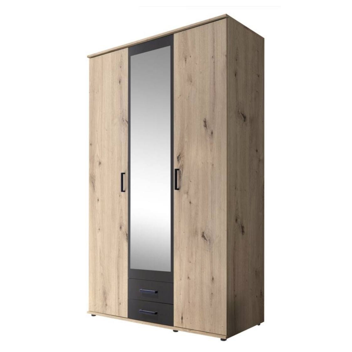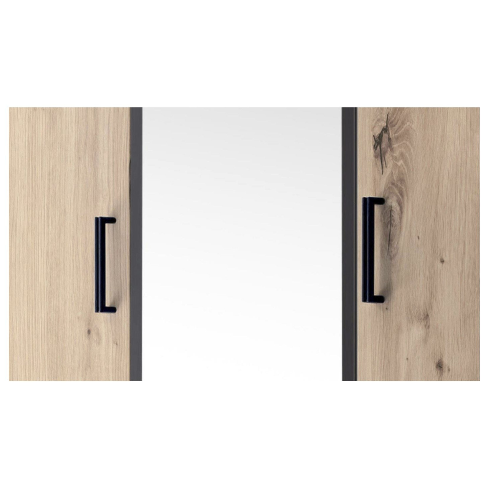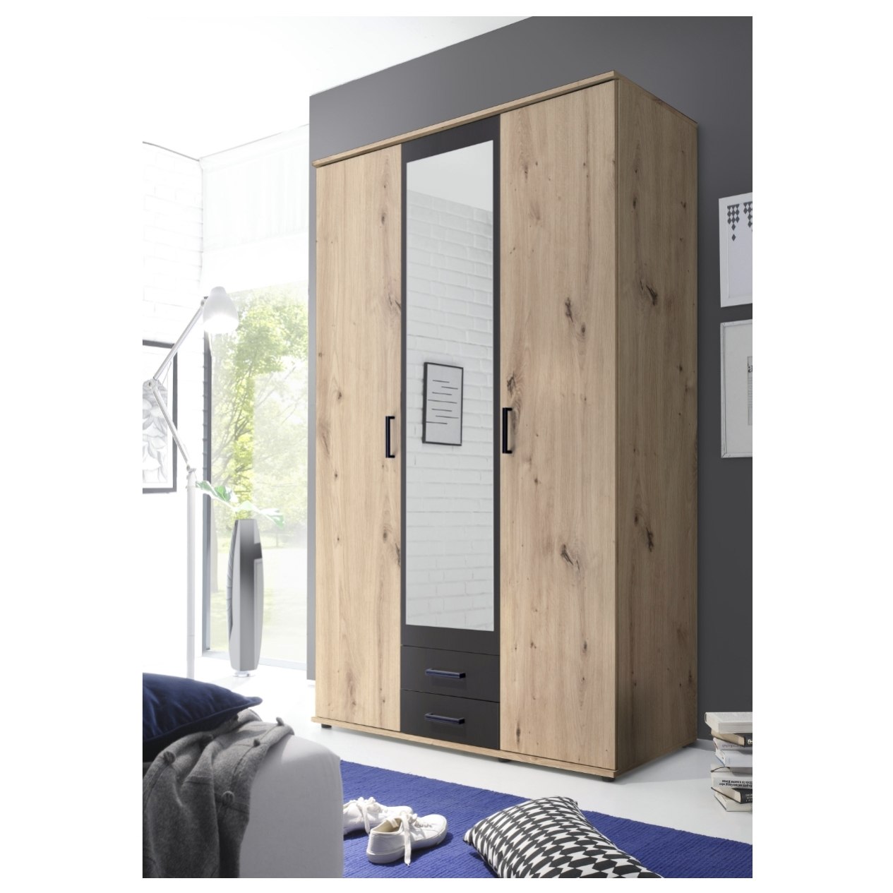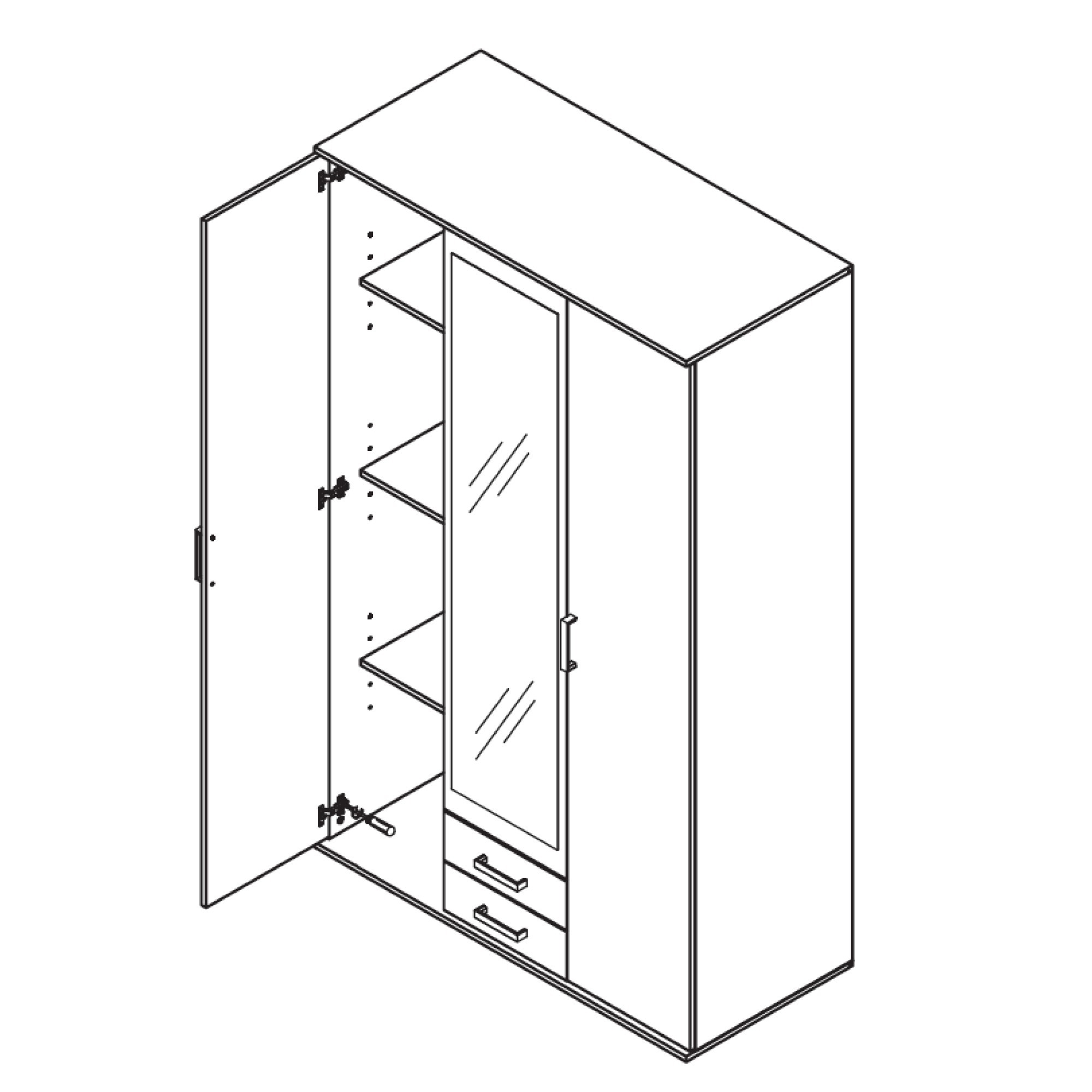 Praktická šatní skříň OTMAR v moderním designu se díky svým rozměrům hodí i do menších ložnic. Určitě oceníte zrcadlo z vnější strany dveří skříně, které se nachází přímo uprostřed a pod ním se v dolní části zároveň nachází 2 zásuvky. Úložný prostor o hloubce 53 cm je uvnitř systematicky rozčleněn – v jednom oddíle se nachází šatní tyč a nad ní vložená police, v druhém oddíle jsou vloženy celkem 3 police. Decentní úchytky usnadňují otevírání. Skříň je vyrobena z laminovaného dřevěného materiálu, který je odolný a nenáročný na údržbu.