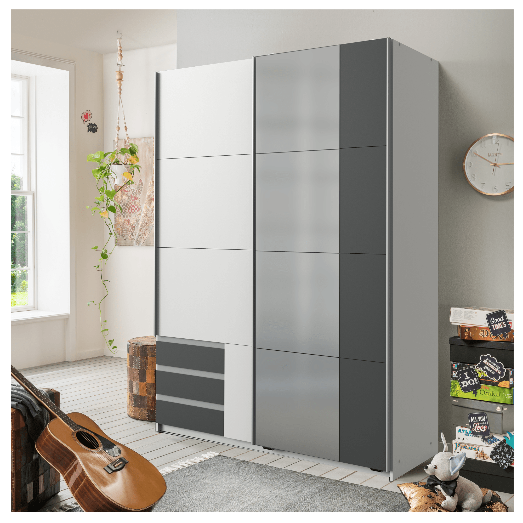 Šatní skříň disponuje dvojící posuvných dveří, které šetří cenné místo vně i uvnitř skříně. Z toho jsou jedny téměř celé vyplněny zrcadlovou plochou. Snadno si tak můžete kdykoli zkontrolovat svůj vzhled a zrcadlo zároveň prosvětlí a opticky zvětší místnost. Bohatý úložný prostor zajišťuje hned 5 vložených polic, které pojmou poskládané oblečení, ložní prádlo, doplňky i sezónní oblečení. Prostorná šatní tyč umožňuje pohodlné zavěšení mačkavých kousků, bund a kabátů. 3 praktické zásuvky jsou ideální pro uložení drobného oblečení nebo doplňků. Veškeré šatstvo bude díky této skříni vždy logicky a přehledně uspořádané.