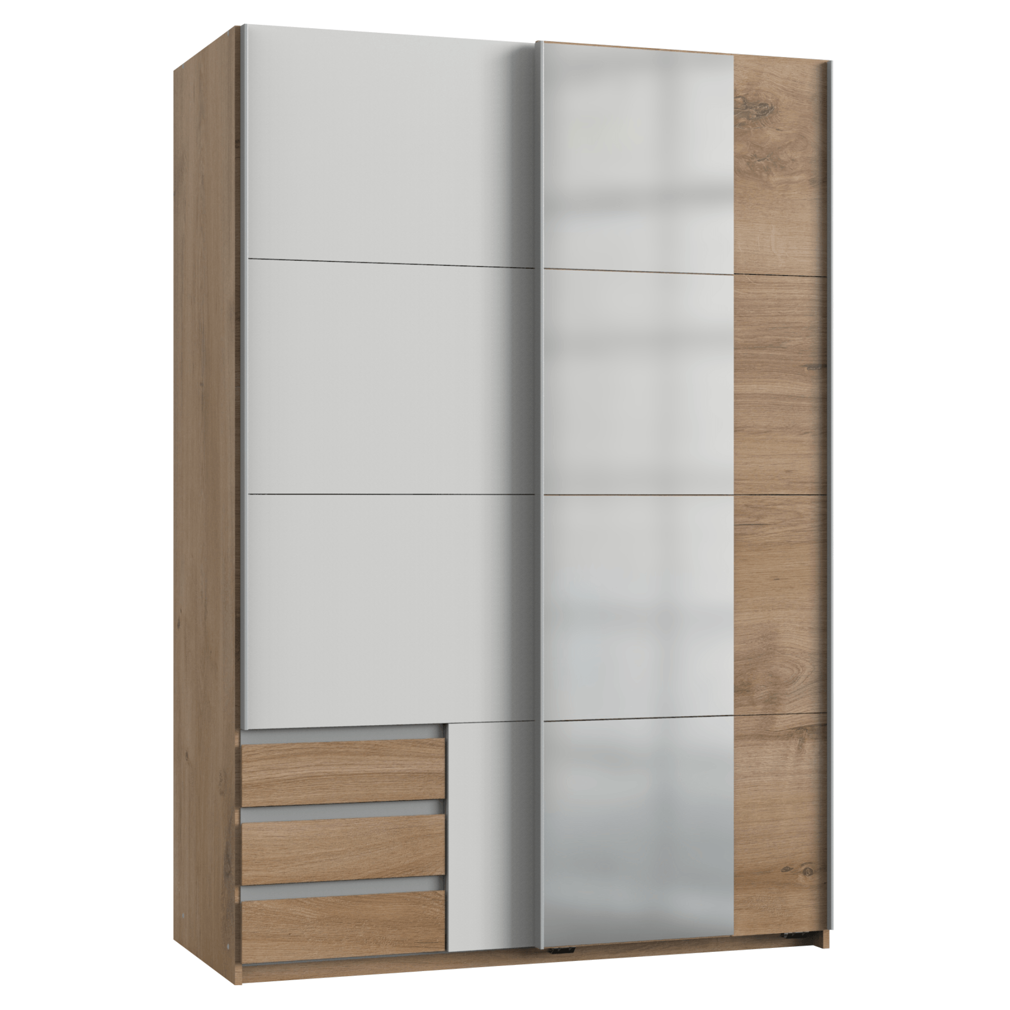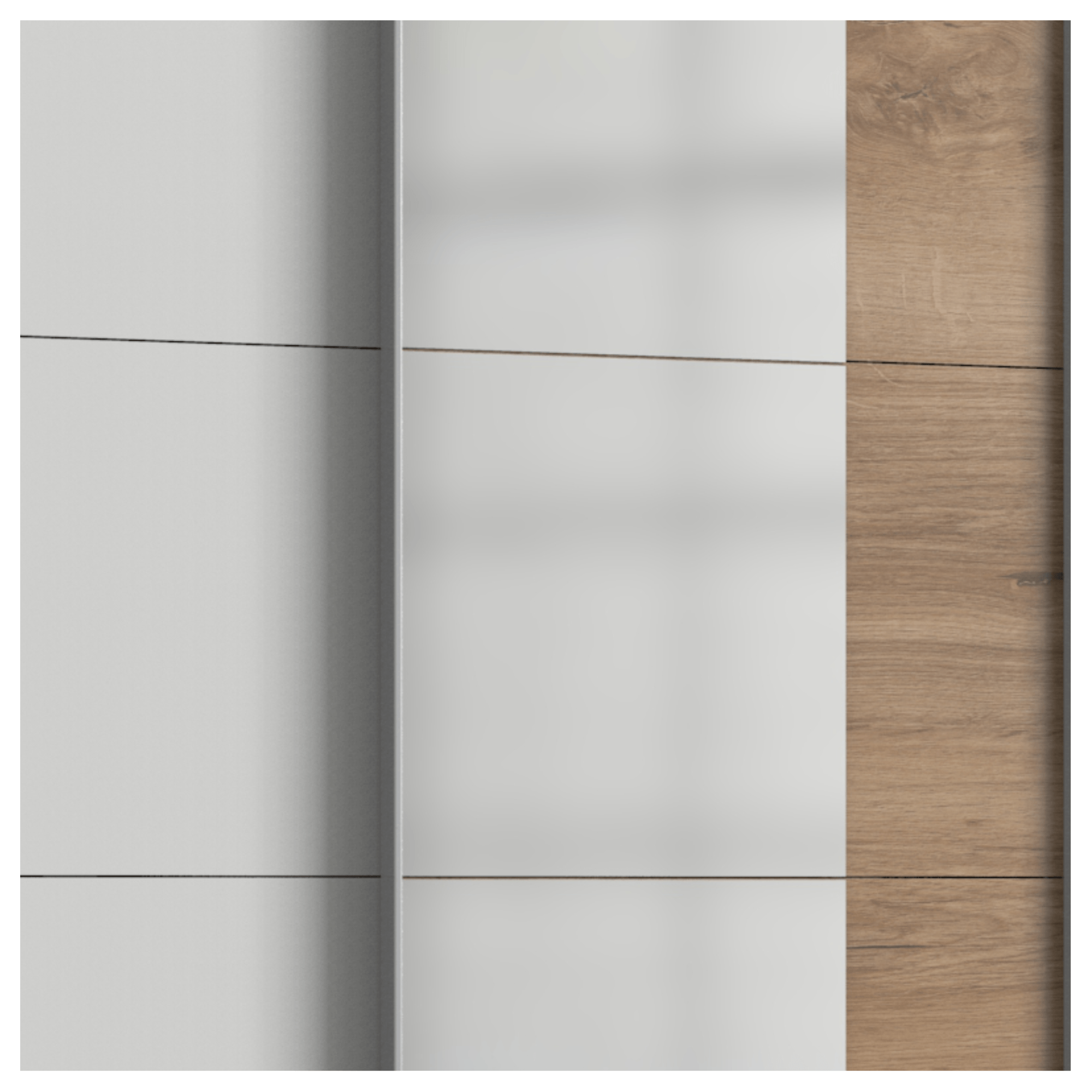 Šatní skříň disponuje dvojící posuvných dveří, které šetří cenné místo vně i uvnitř skříně. Z toho jsou jedny téměř celé vyplněny zrcadlovou plochou. Snadno si tak můžete kdykoli zkontrolovat svůj vzhled a zrcadlo zároveň prosvětlí a opticky zvětší místnost. Bohatý úložný prostor zajišťuje hned 5 vložených polic, které pojmou poskládané oblečení, ložní prádlo, doplňky i sezónní oblečení. Prostorná šatní tyč umožňuje pohodlné zavěšení mačkavých kousků, bund a kabátů. 3 praktické zásuvky jsou ideální pro uložení drobného oblečení nebo doplňků. Veškeré šatstvo bude díky této skříni vždy logicky a přehledně uspořádané.
