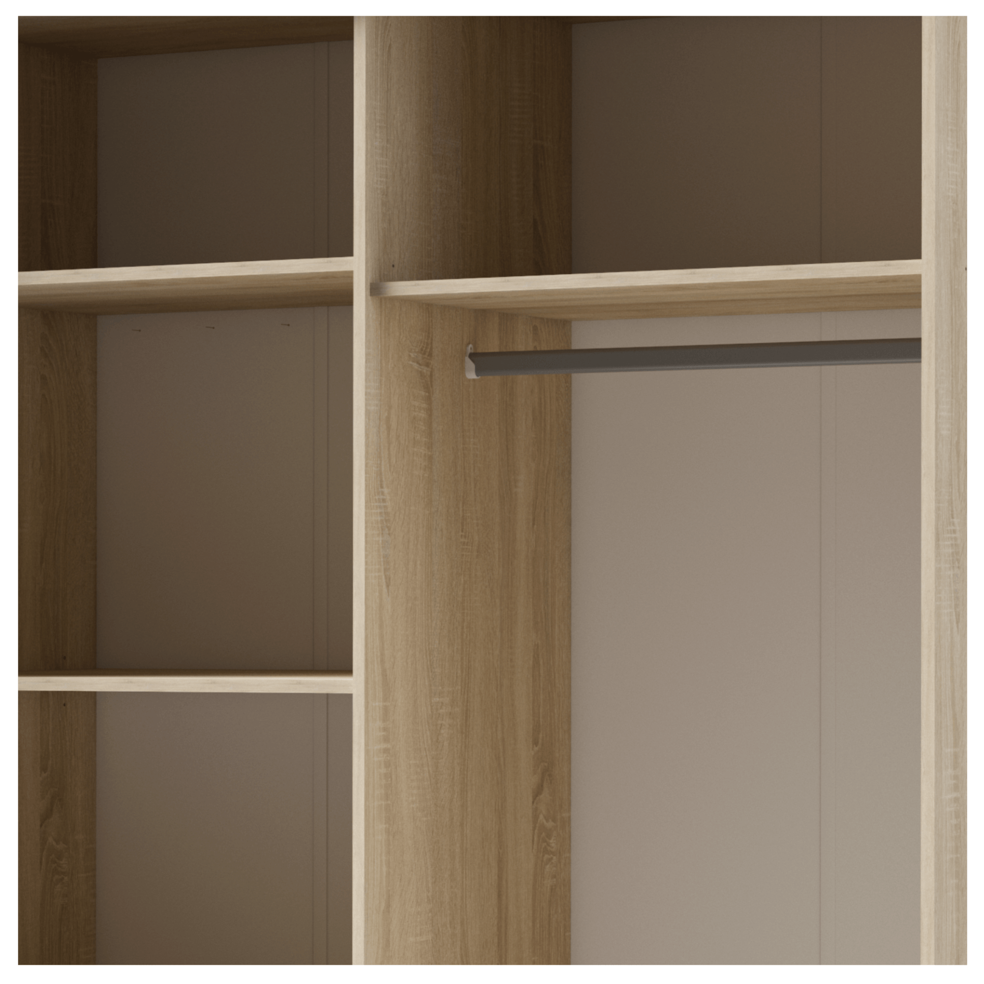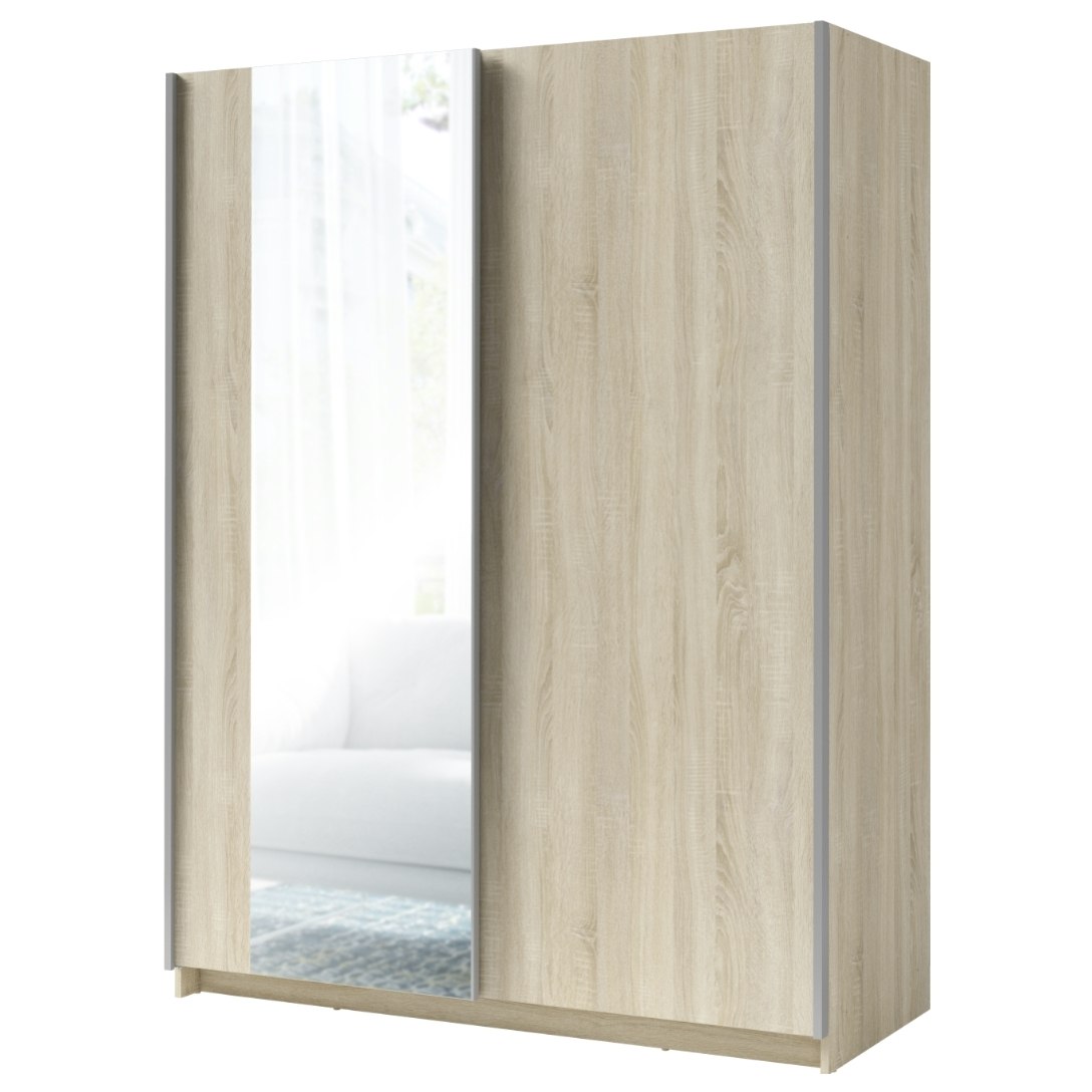 Vnitřní úložný prostor je prakticky rozvržen na 2 rozdílné poloviny. Pravá strana obsahuje šatní tyč vhodnou pro zavěšení bund, kabátů nebo mačkavých kousků oblečení. Nad ní se ještě v horní části nachází vložená police, která je ideální pro uložení ložního textilu nebo mimosezonního oblečení. V levé polovině jistě oceníte 3 vložené police, které nabízí dostatek místa pro poskládané šatstvo či doplňky. Skříň uzavírají posuvné dveře zajišťující pohodlnou manipulaci i v menším prostoru. Jedny dveře obsahují zrcadlo, které opticky zvětší a prosvětlí místnost a zároveň vám umožňuje si kdykoliv zkontrolovat svůj vzhled. Skříň je vyrobena z laminovaného dřevěného materiálu, který není náročný na údržbu.