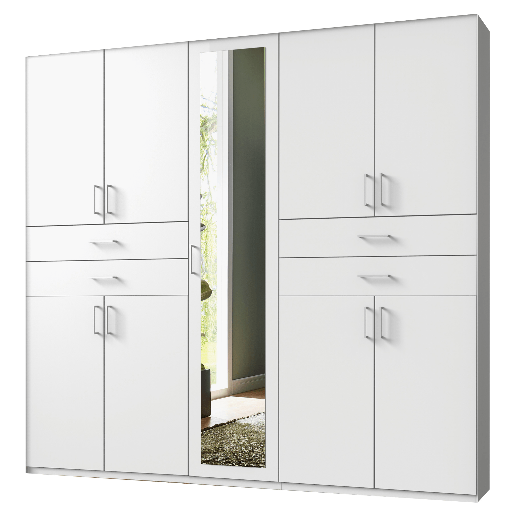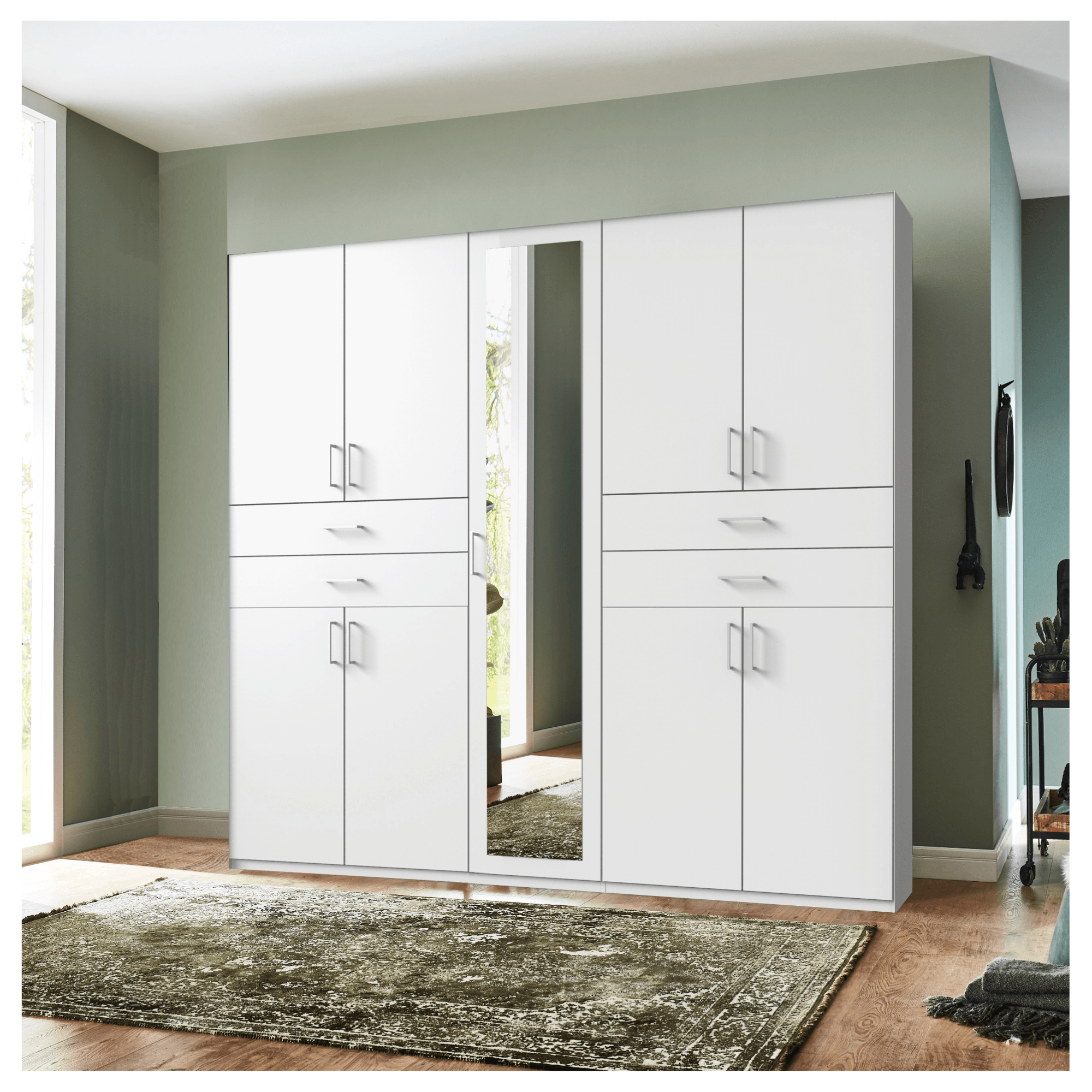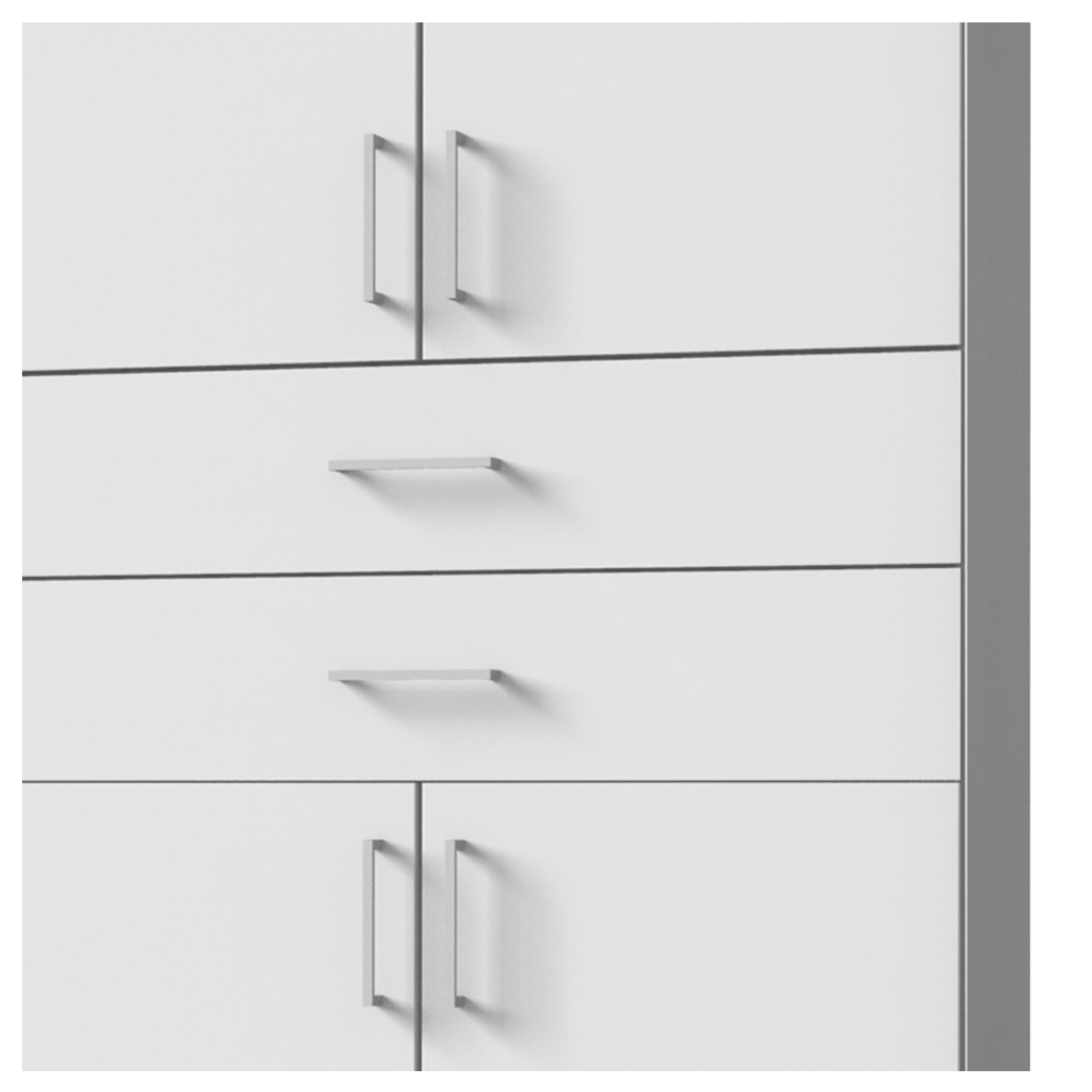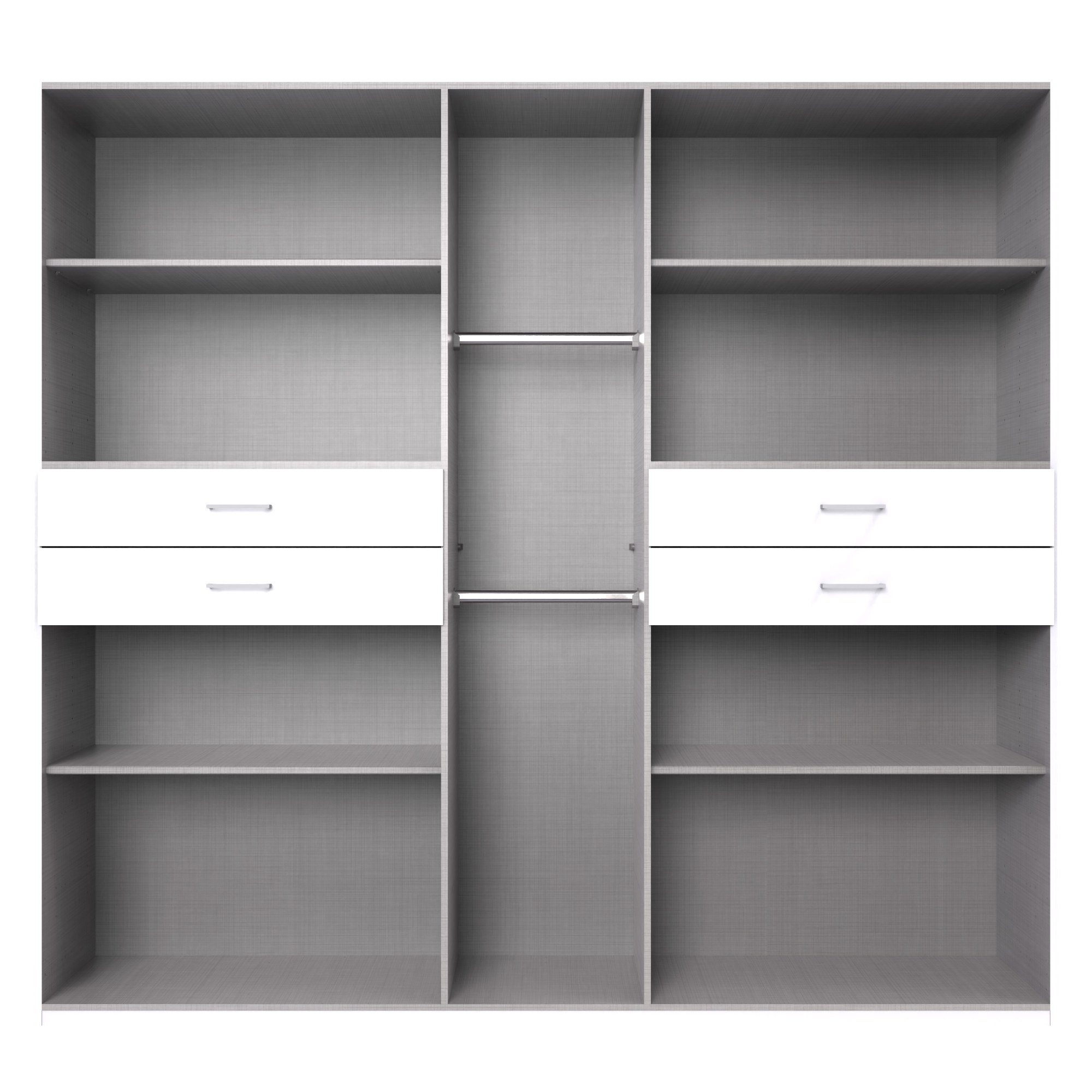 Skříň uzavírá 9 otočných dveří, které umožňují maximální využití vnitřního prostoru. 1 dveře jsou vyplněny zrcadlem, ve kterém si můžete kdykoliv zkontrolovat svůj vzhled. Za každým párem dveří se nachází 1 prostorná vložená police, která prakticky předěluje prostor. Za zrcadlovými dveřmi se ukrývají 2 šatní tyče. Umístění ve 2 řadách umožňuje zavěšení více kusů oblečení. Skříň dále obsahuje 4 praktické zásuvky na drobnější šatstvo či doplňky. Všechny přední plochy jsou osazeny výraznými úchyty v barvě kovu, které usnadní každodenní manipulaci.