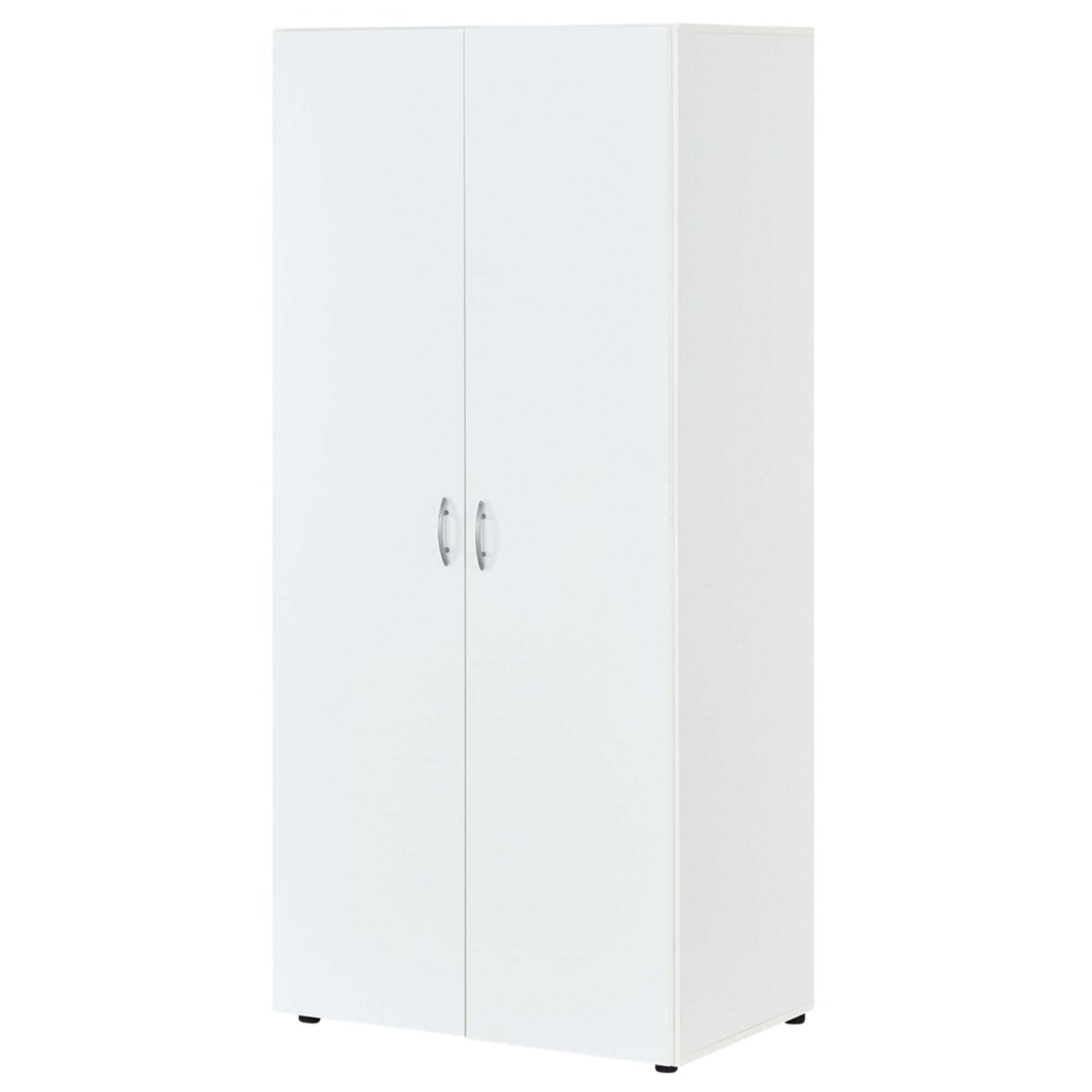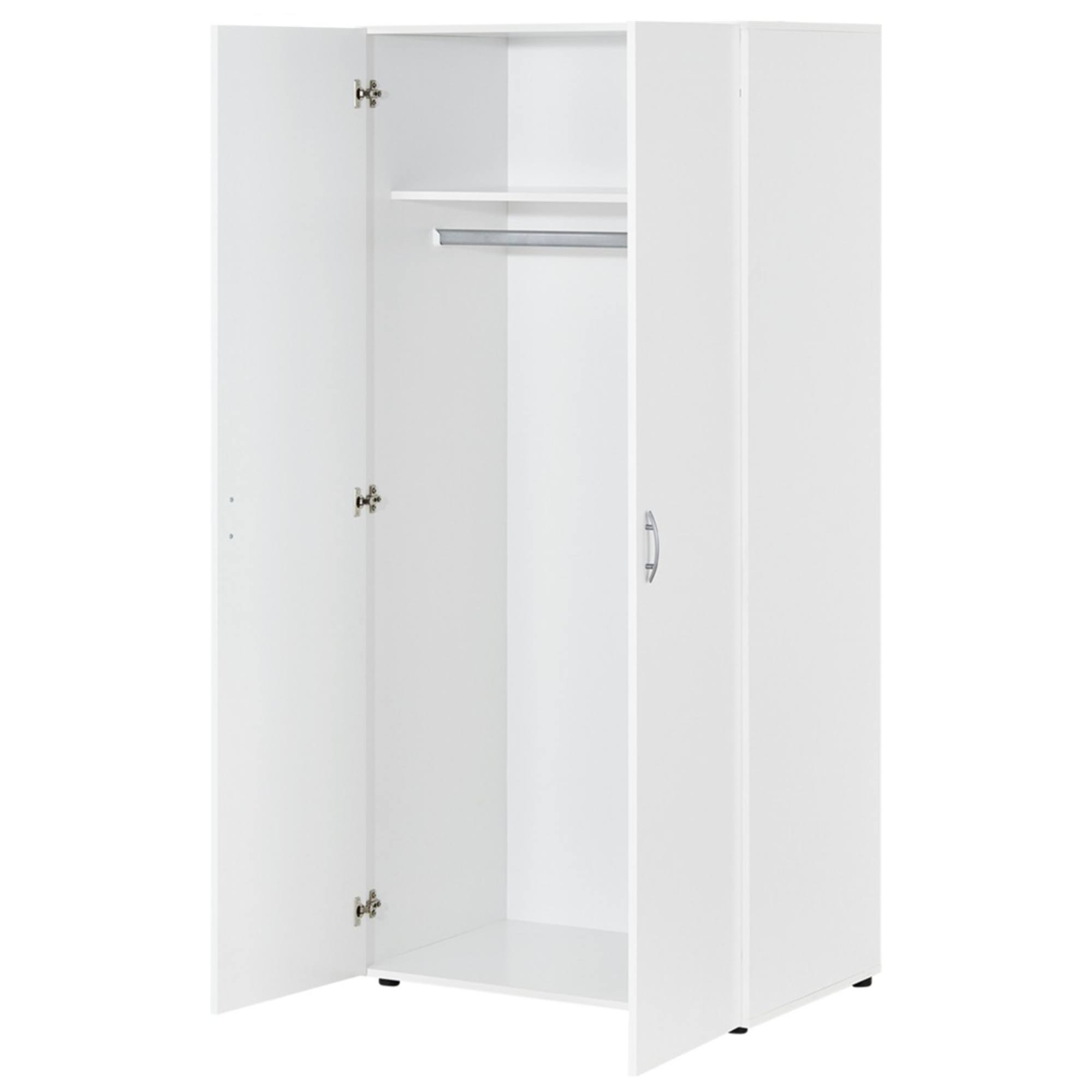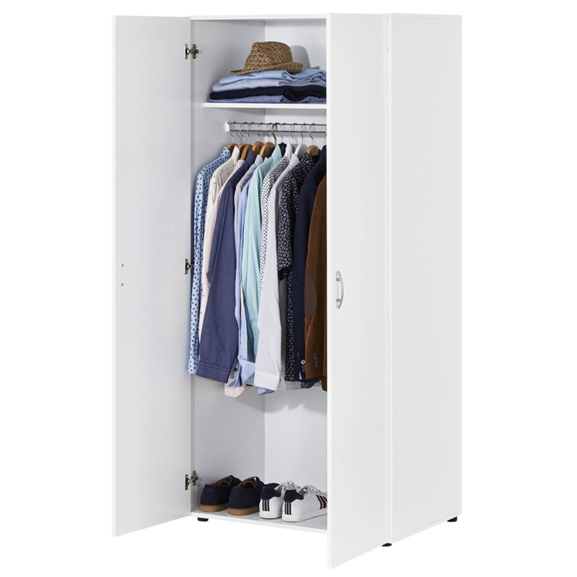Šatní skříň má 2 otočné dveře, za nimiž se nachází vnitřní vybavení sestaveno z 1 šatní tyče a 1 vložené police. Decentní plastové úchytky usnadňují otevírání jednotlivých částí skříně. Skříň je vyrobena z laminovaného dřevěného materiálu, který je odolný a nenáročný na údržbu.