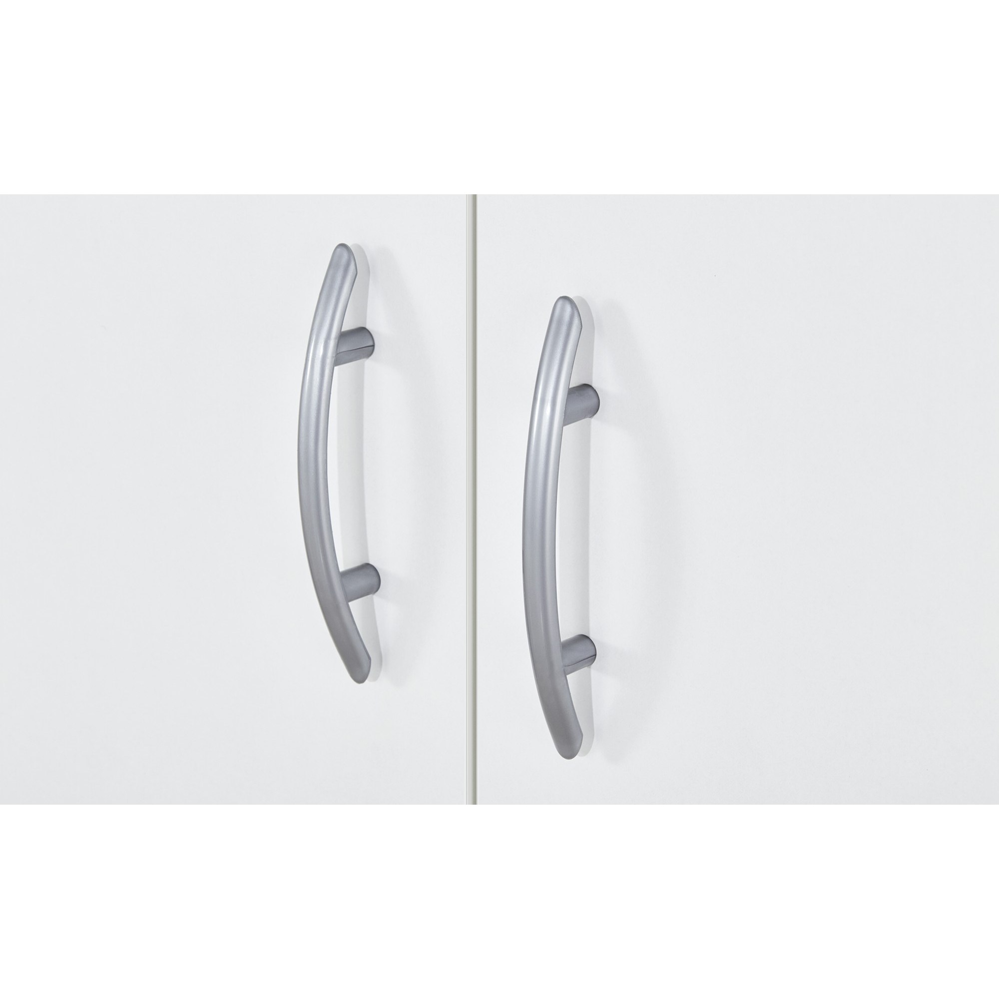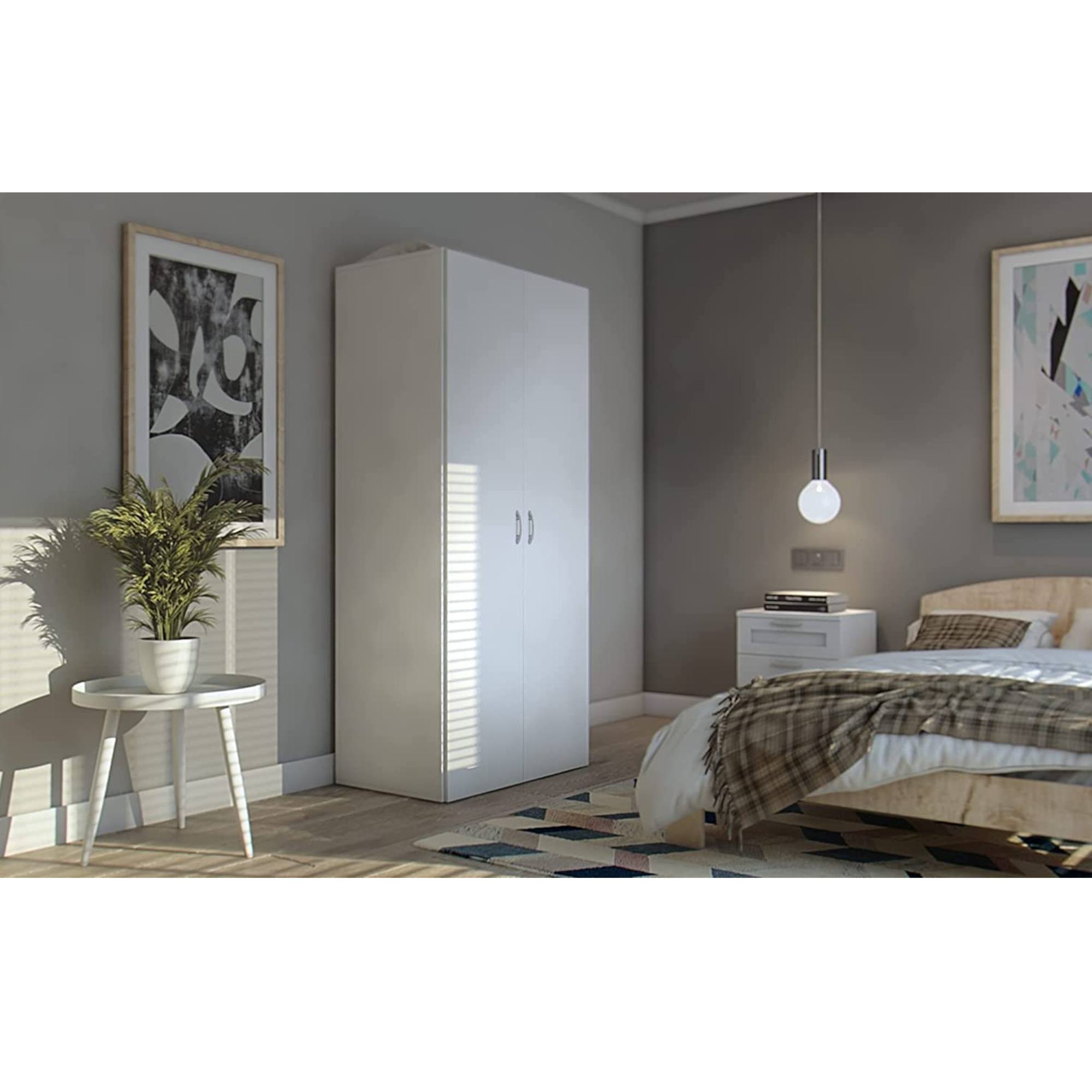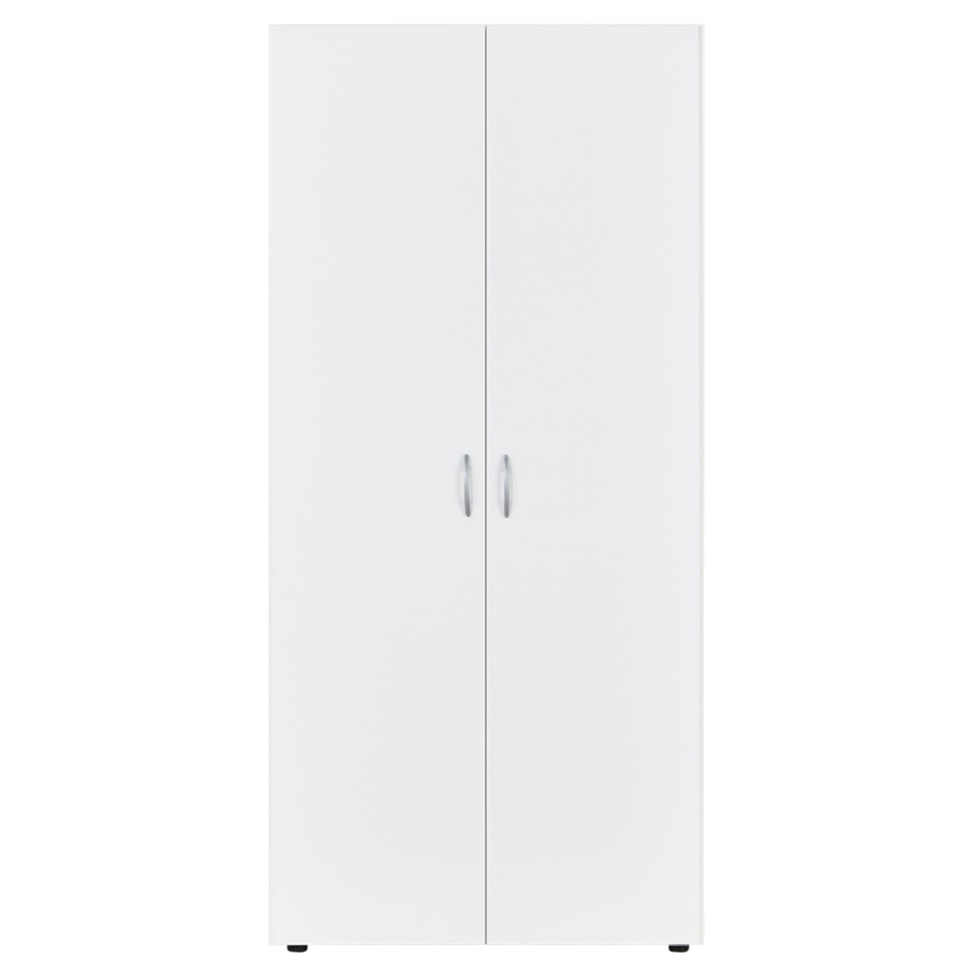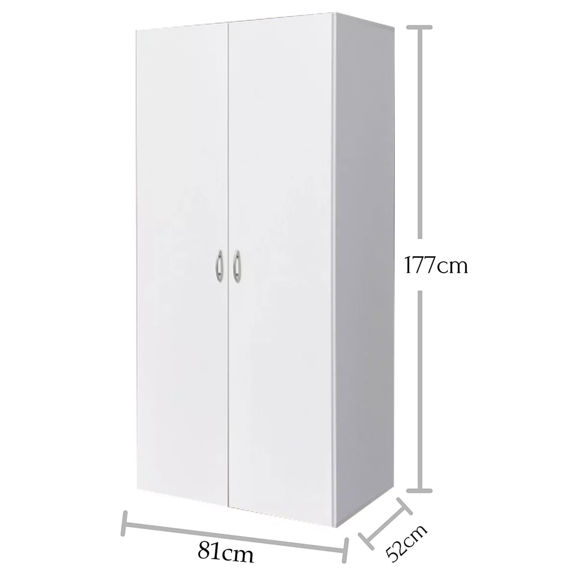 Šatní skříň má 2 otočné dveře, za nimiž se nachází vnitřní vybavení sestaveno z 1 šatní tyče a 1 vložené police. Decentní plastové úchytky usnadňují otevírání jednotlivých částí skříně. Skříň je vyrobena z laminovaného dřevěného materiálu, který je odolný a nenáročný na údržbu.