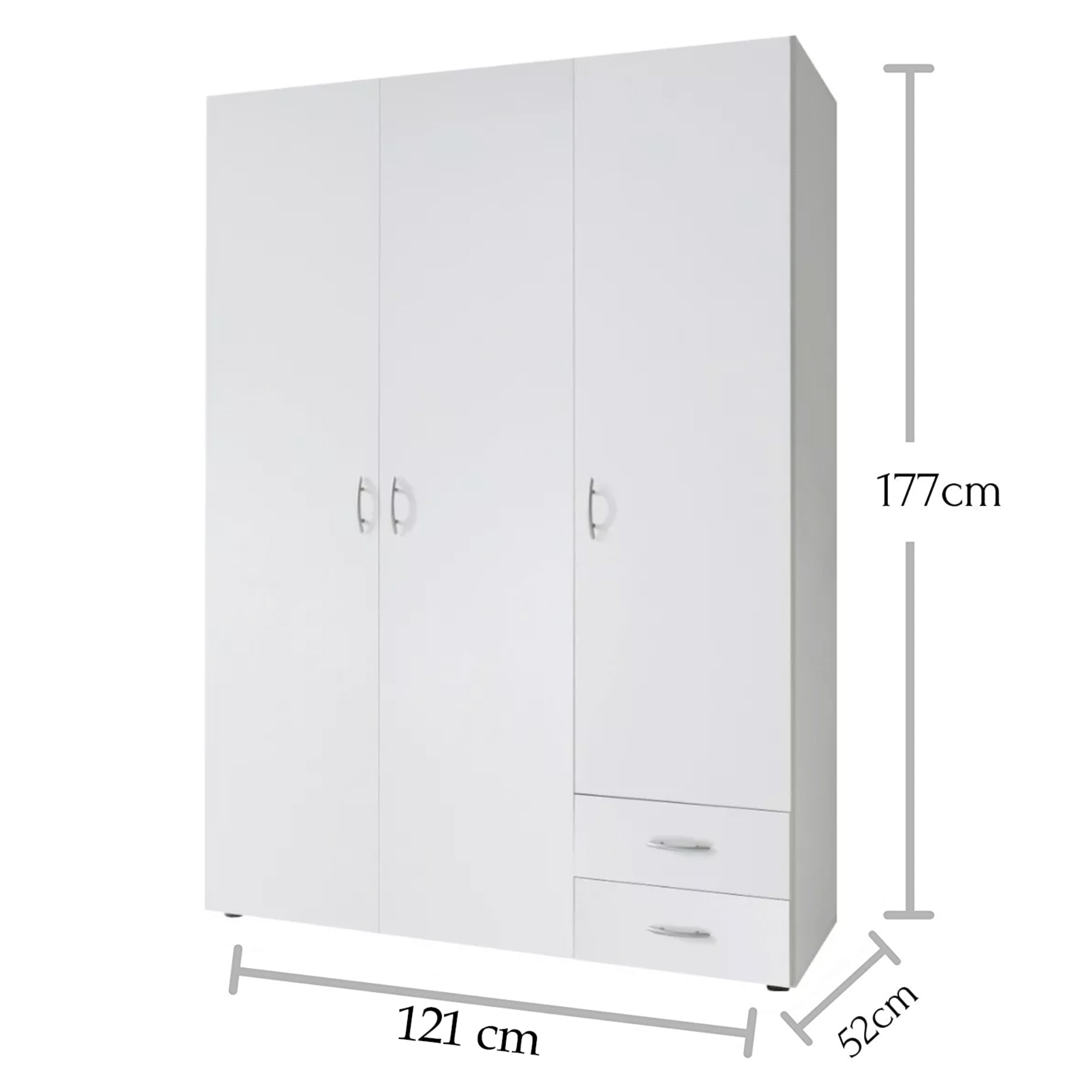 Třídveřovou šatní skříň SEBA 3 snadno zkombinujete se zbytkem interiéru díky jednobarevnému a nadčasovému provedení. Díky svým rozměrům se hodí i do menších místností. Za párem dveří, orientovanými v levé části skříně, se nachází šatní tyč a nad ní vložená police. Za samostatnými dvířky naleznete úložný prostor, který je rozdělen 2 vloženými policemi a v dolní části se nachází ještě dvě zásuvky. Decentní úchytky usnadňují otevírání. Skříň je vyrobena z laminovaného dřevěného materiálu, který je odolný a snadný na údržbu.