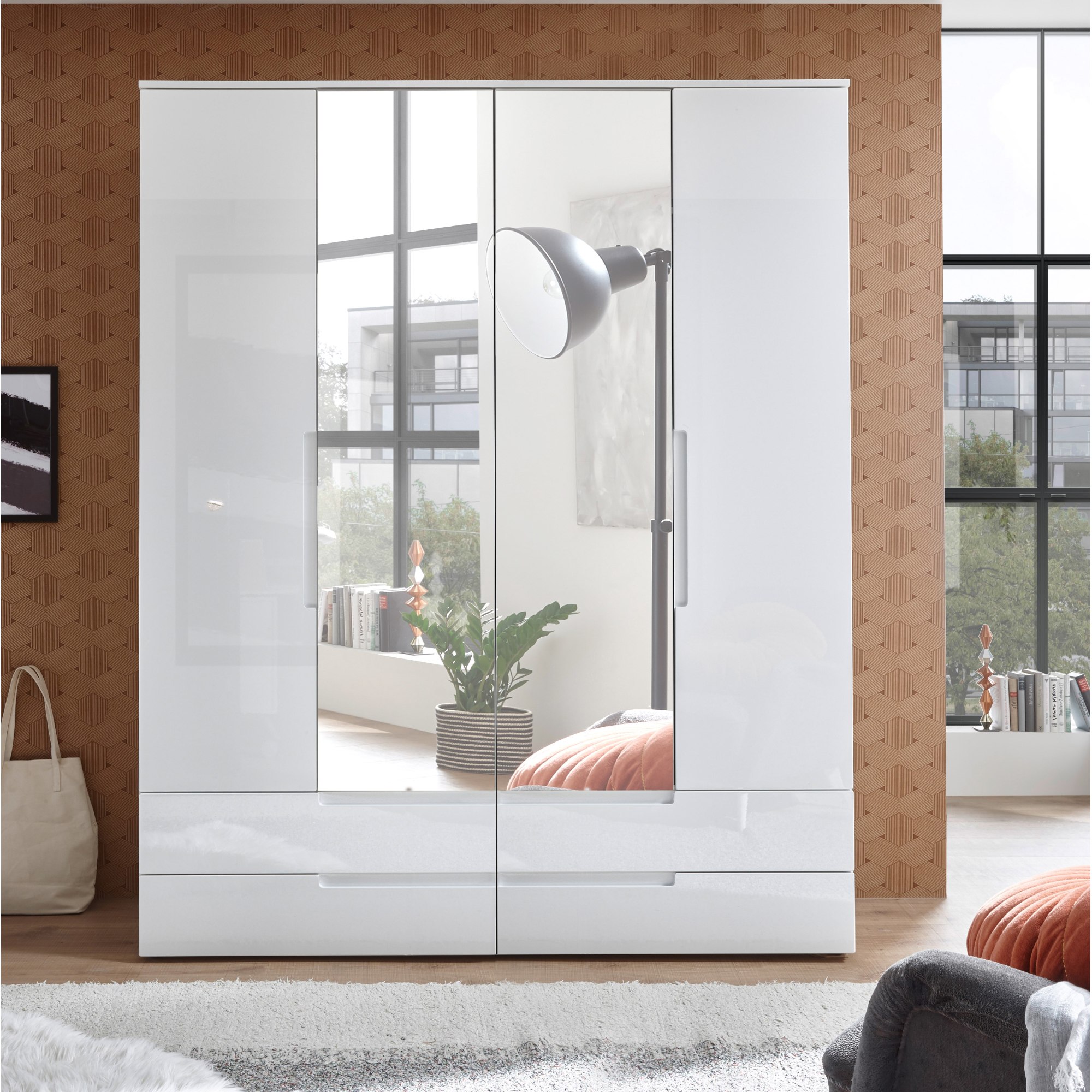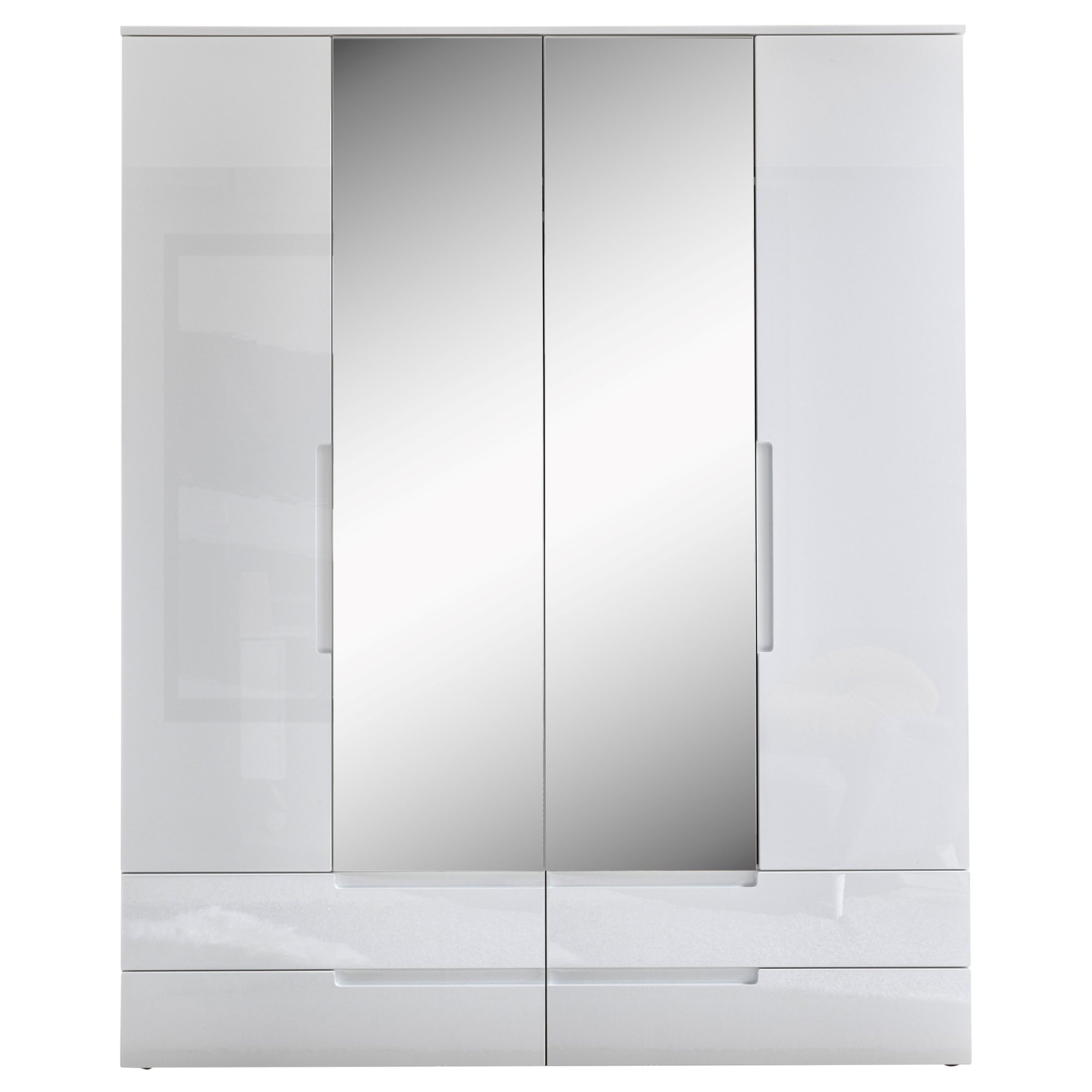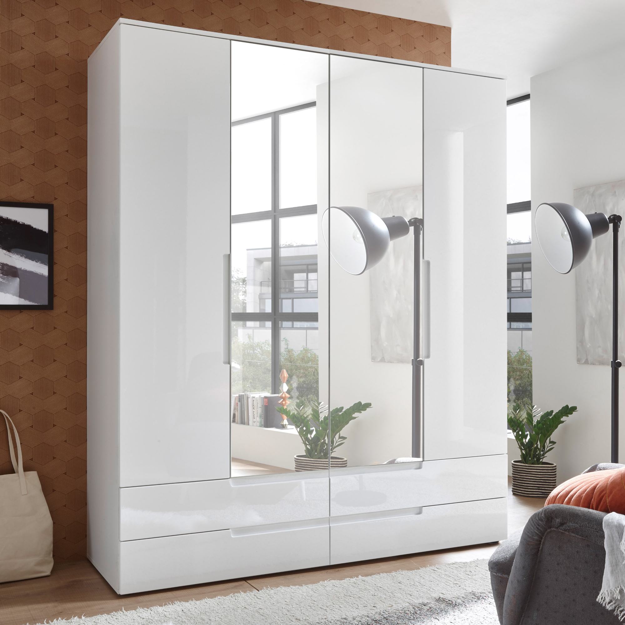 Šatní skříň má 4 otočné dveře, z nichž jedny jsou vybaveny zrcadlem. Pod zrcadlem se nachází čtyři zásuvky, které představují praktický úložný prostor. Vnitřní vybavení skříně je systematicky rozděleno a poskytne dostatek prostoru pro všechno vaše oblečení a další předměty. Díky elegantnímu provedení úchytek se vám skříň bude snadno otevírat. Šatní skříň je vyrobená z fóliovaného dřevěného materiálu, který je odolný a nenáročný na údržbu.