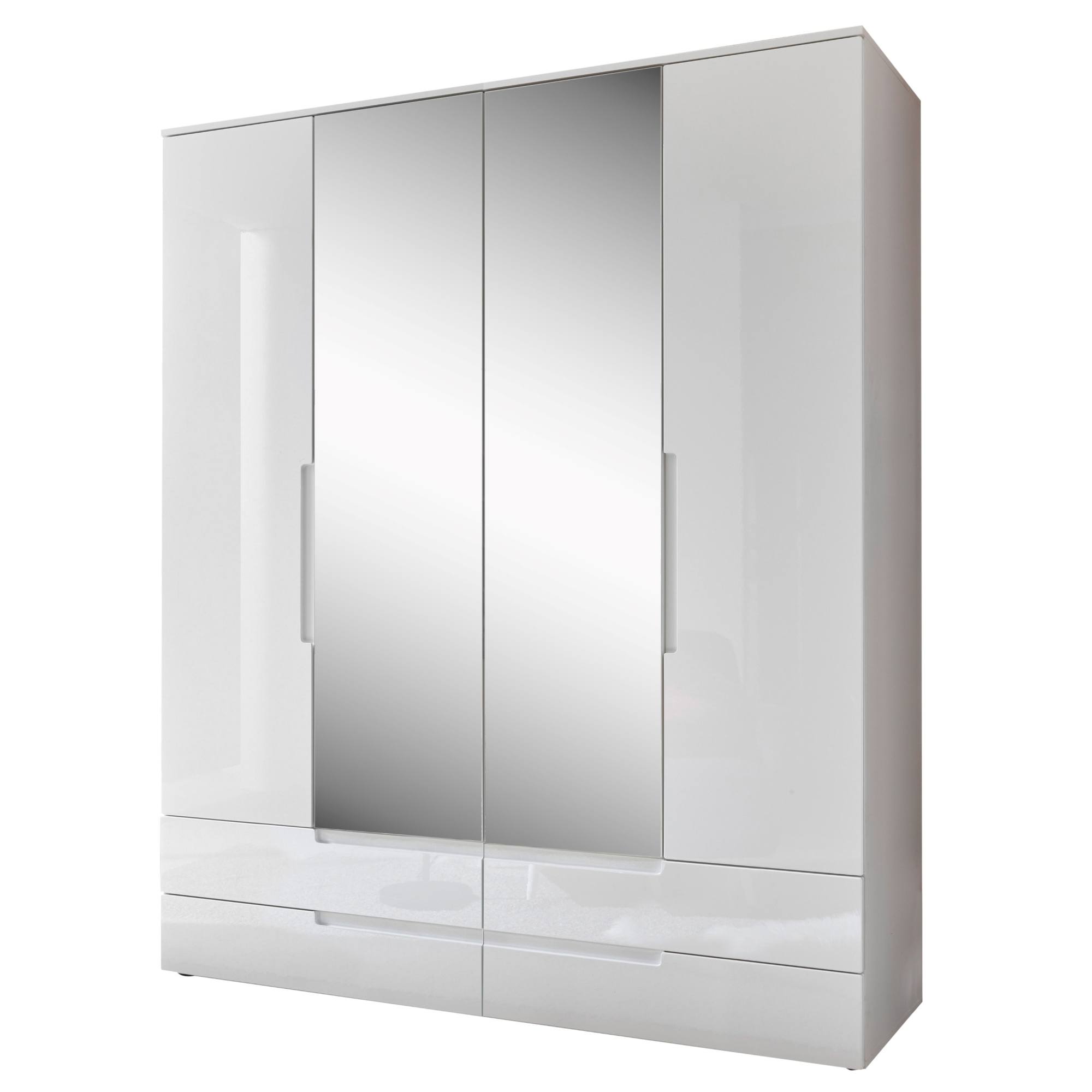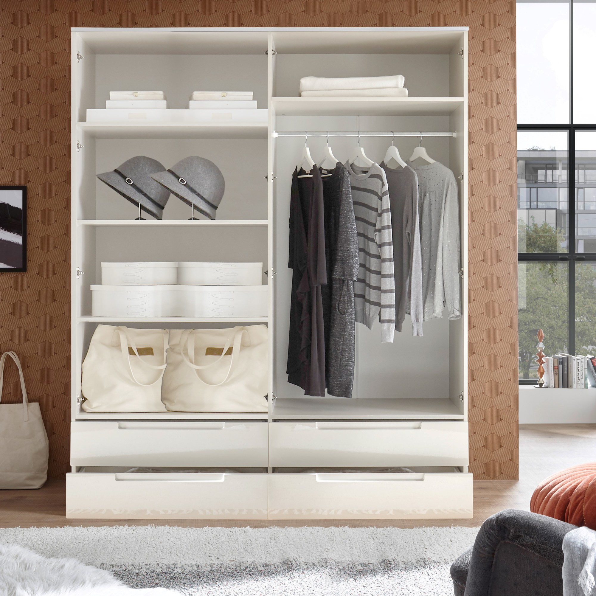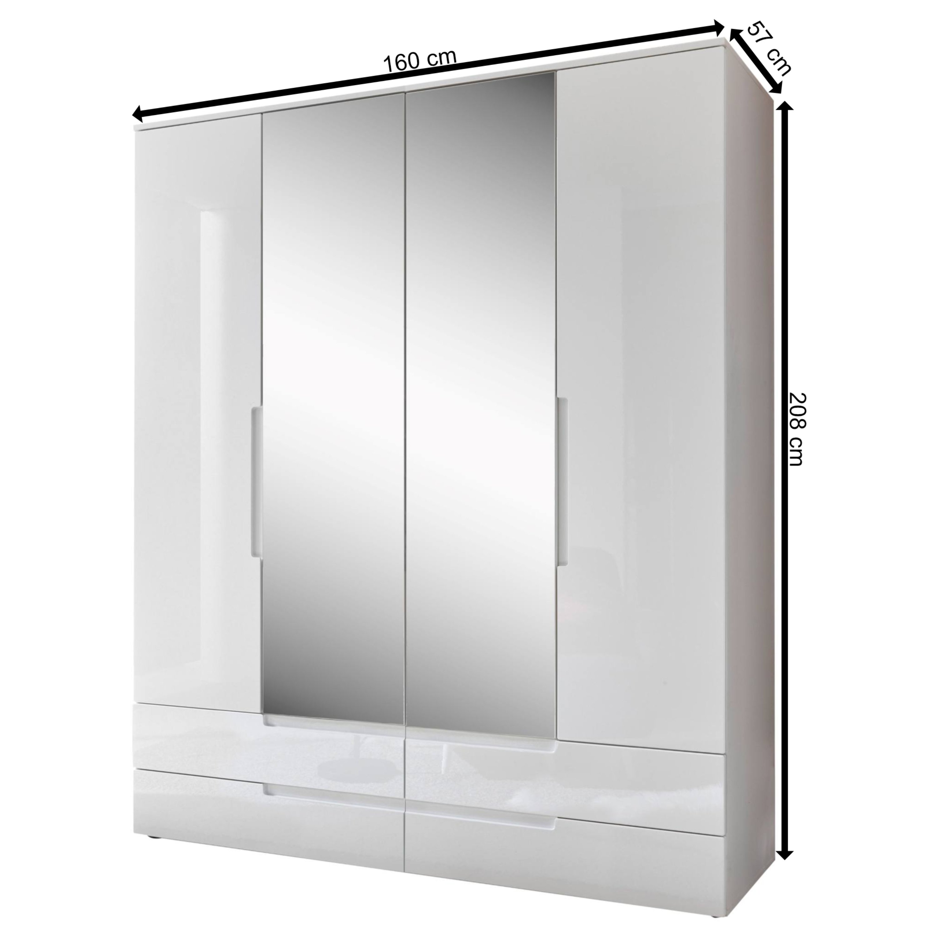 Šatní skříň má 4 otočné dveře, z nichž jedny jsou vybaveny zrcadlem. Pod zrcadlem se nachází čtyři zásuvky, které představují praktický úložný prostor. Vnitřní vybavení skříně je systematicky rozděleno a poskytne dostatek prostoru pro všechno vaše oblečení a další předměty. Díky elegantnímu provedení úchytek se vám skříň bude snadno otevírat. Šatní skříň je vyrobená z fóliovaného dřevěného materiálu, který je odolný a nenáročný na údržbu.