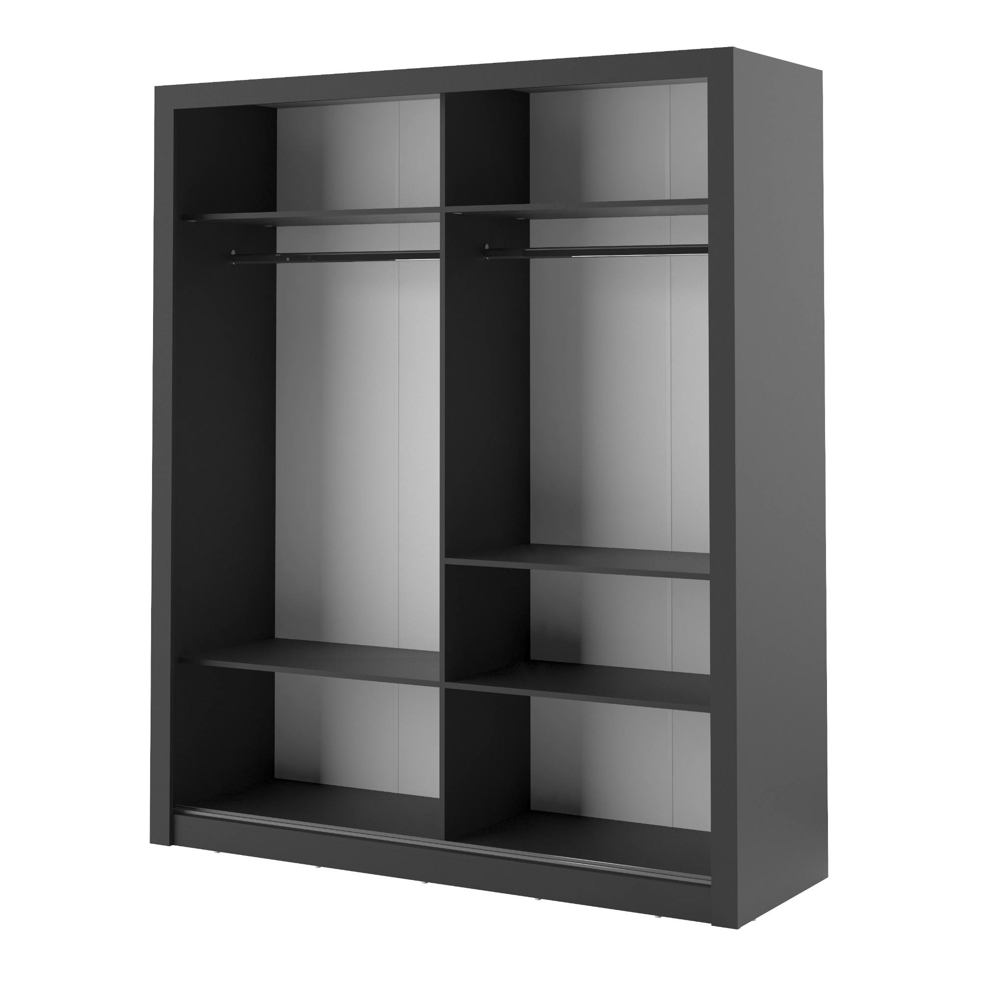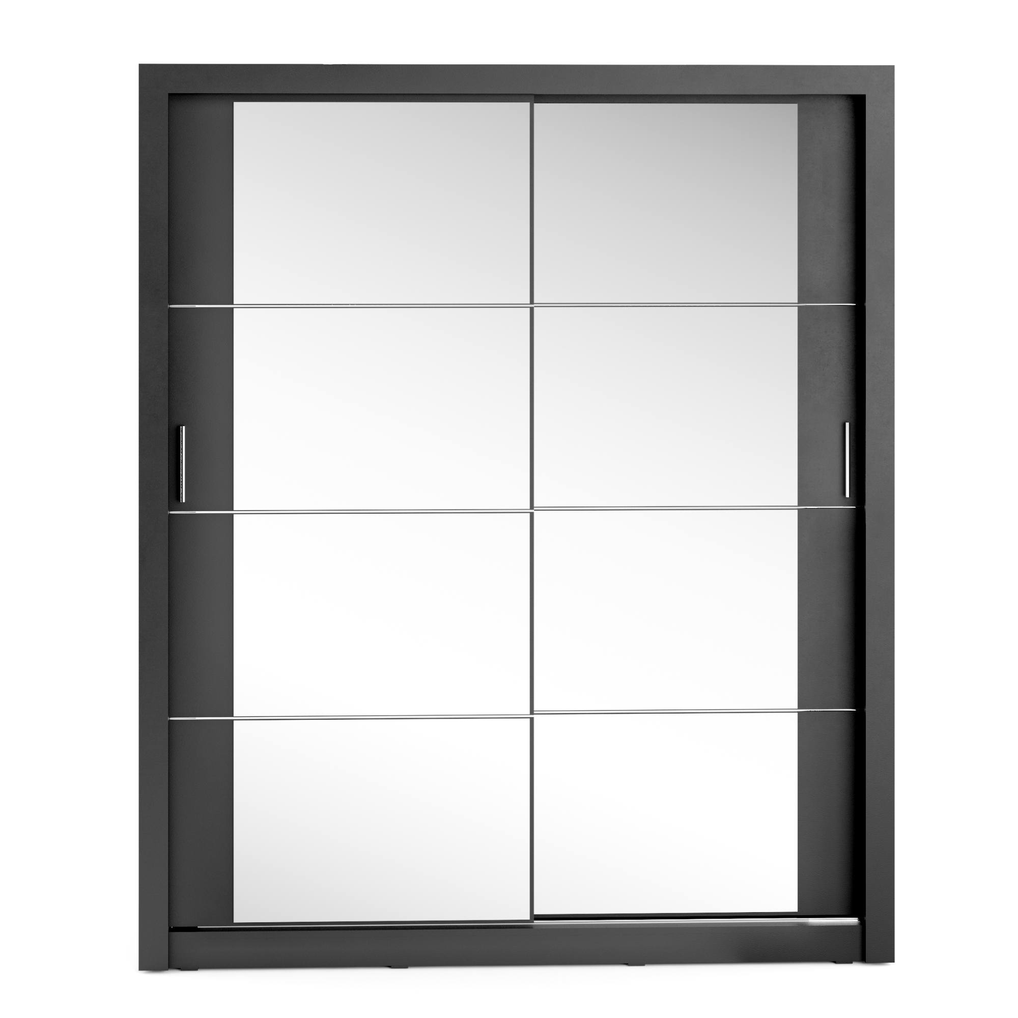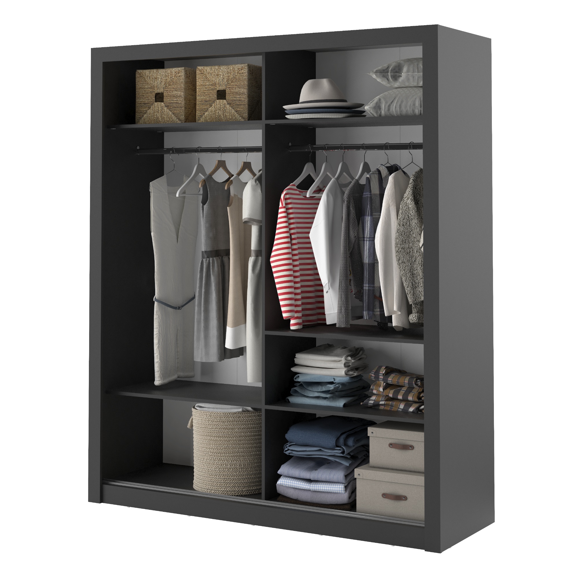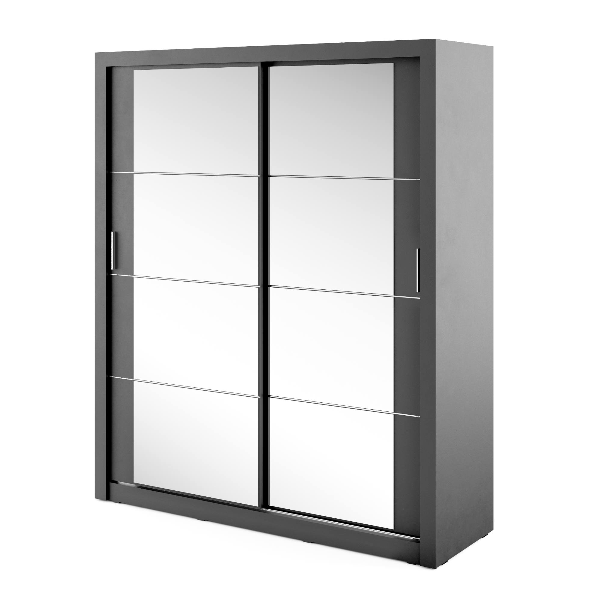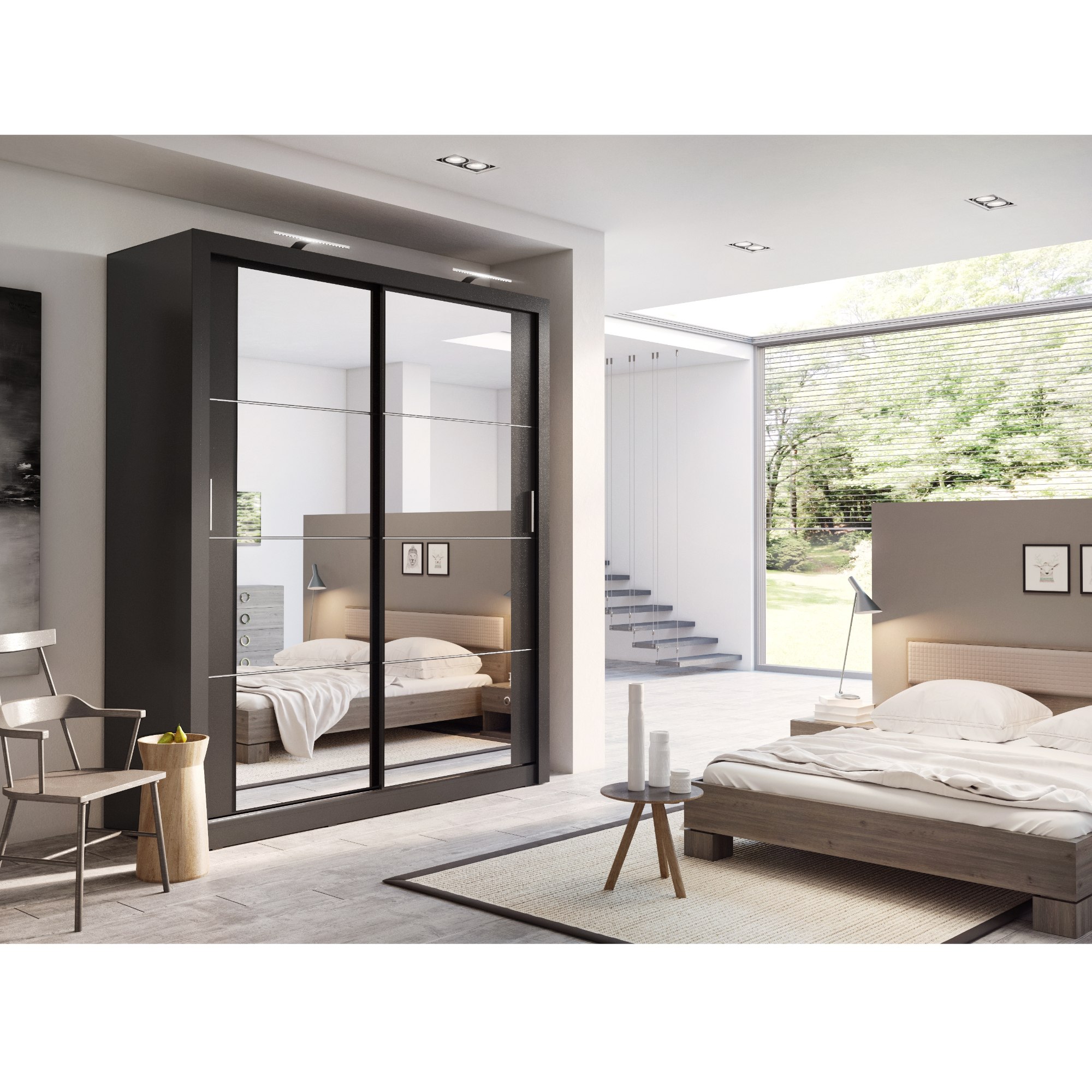 Šatní skříň disponuje dvojící zrcadlových posuvných dveří, díky čemuž napomohou k doladění vašeho outfitu a zároveň ušetří místo při otevírání. Bohatý úložný prostor pak zajišťuje pět polic a dvě šatní tyče. Veškeré oblečení tak bude vždy logicky a přehledně uspořádané. Skříň je vyrobena z laminovaného dřevěného materiálu, který se vyznačuje snadnou udržovatelností i dlouhou životností.