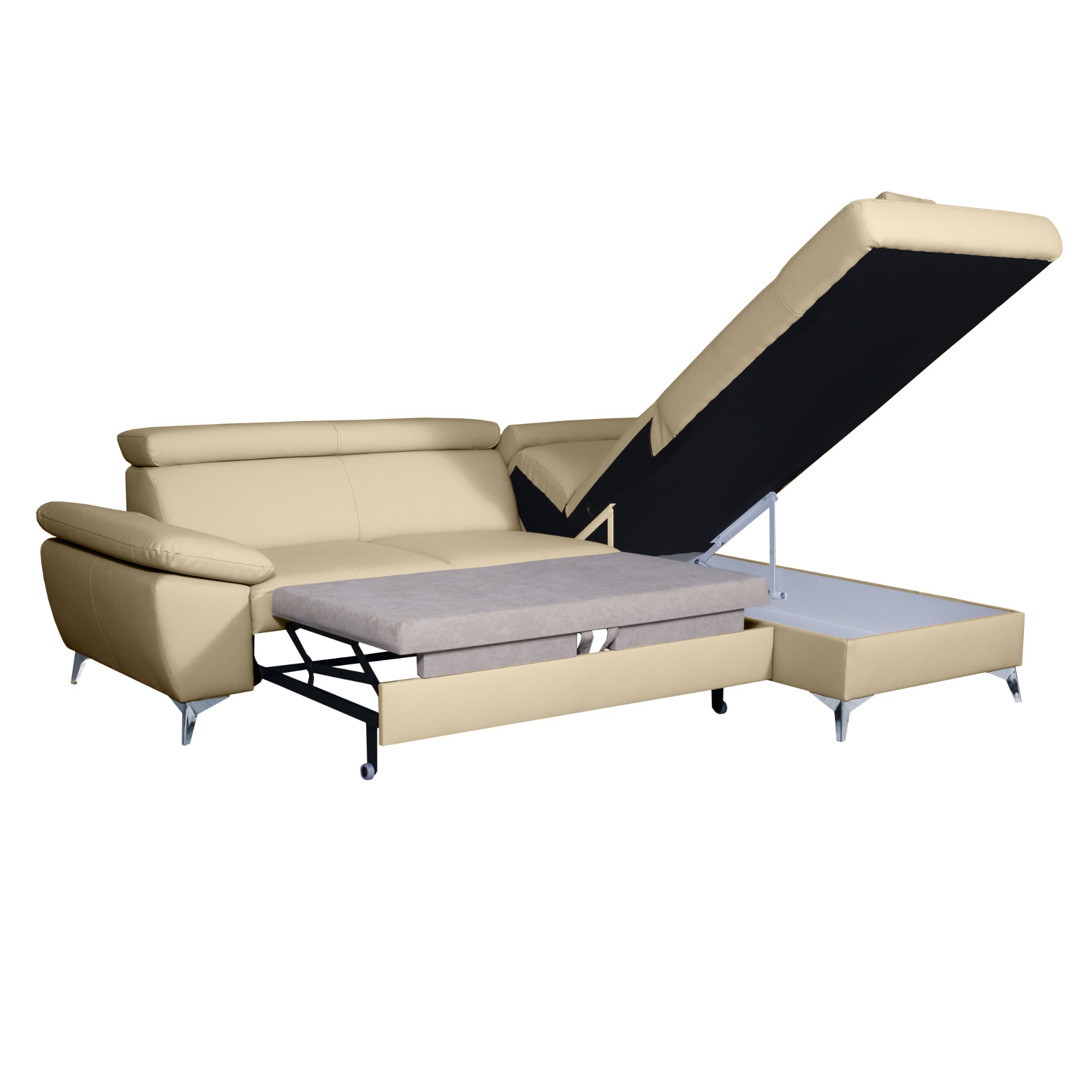 Konstrukce z masivního dřeva disponuje vlnovým odpružením na sedáku a elastickými popruhy v oblasti zádové opěrky. Maximální komfort je dosažen použitím vysoce kvalitní studené pěny. Souprava je pak potažená na dotek příjemnou kůží. Už tak nadstandartní pohodlí je ještě navýšeno o nastavitelné opěrky na lokty a hlavu. Souprava rovněž nabízí funkci rozložení na lůžko pro příležitostné přespání, které je potaženo hebkým mikrovláknem. Doplněna je navíc o praktický úložný prostor na lůžkoviny. Stabilitu celé soupravy pak zajišťují kovové pochromované nohy.