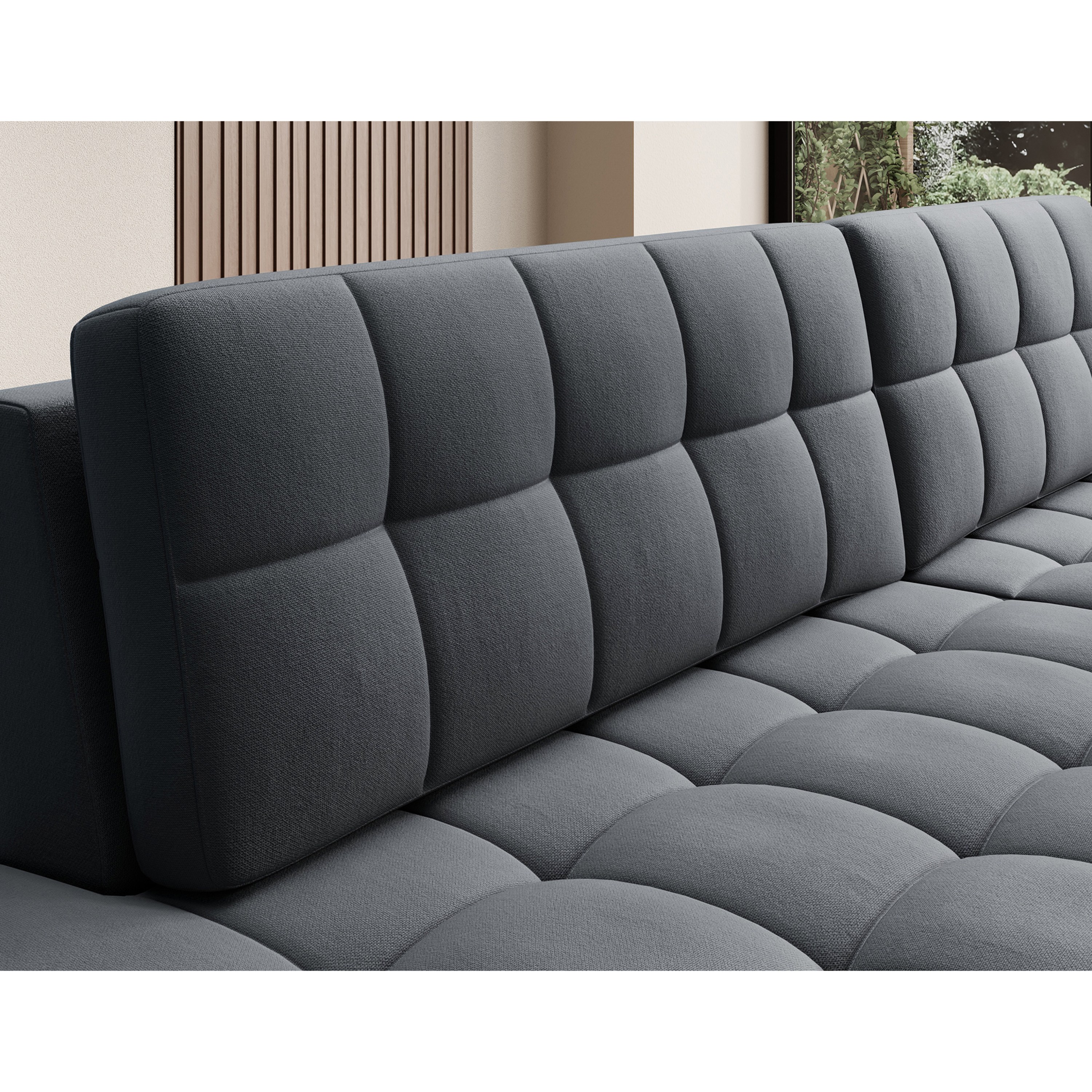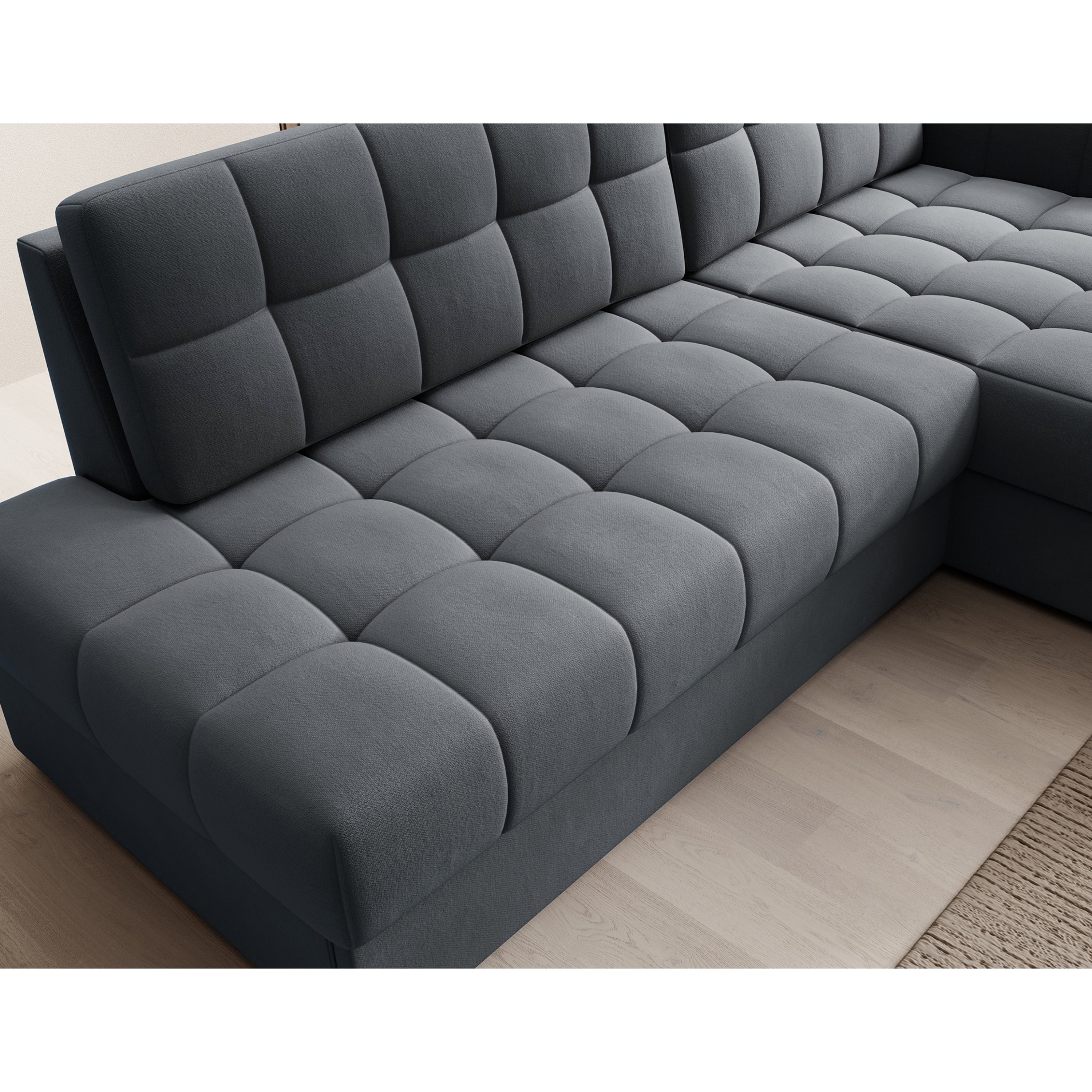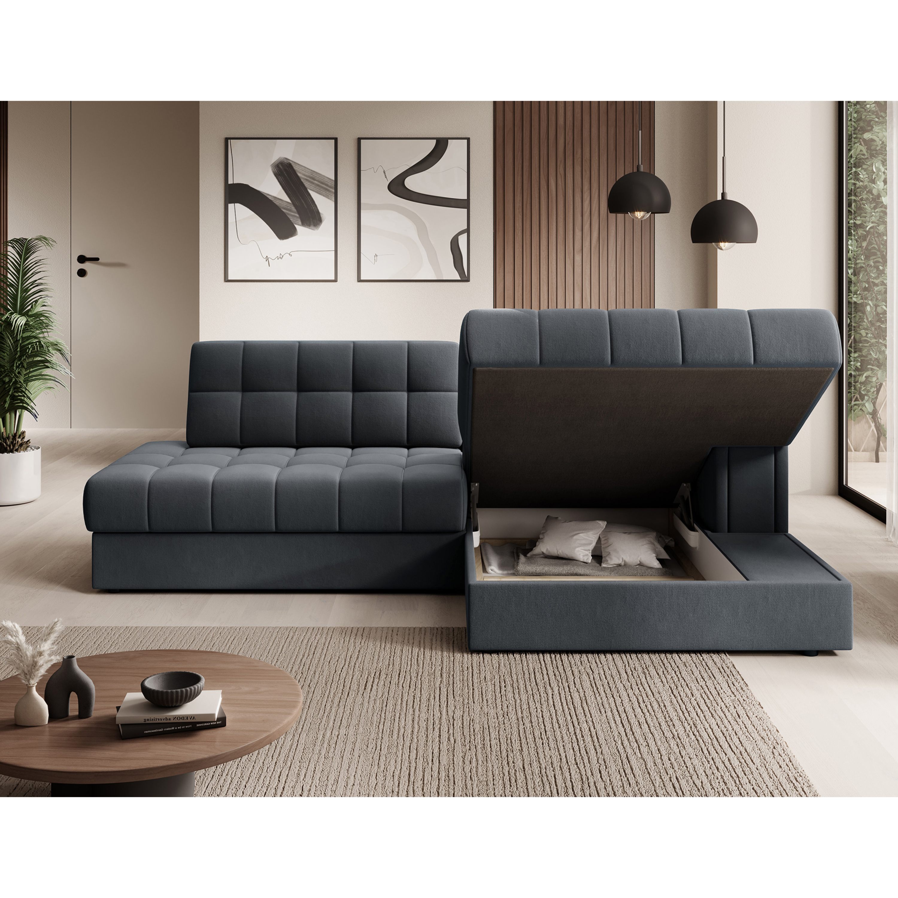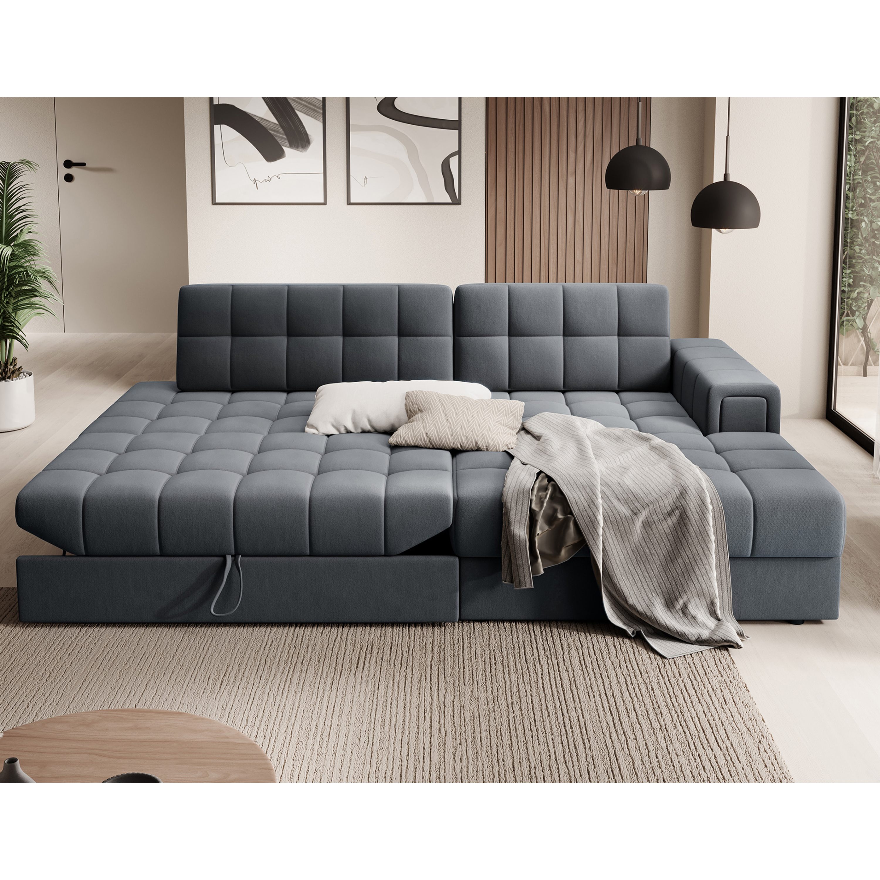 Pěnové jádro, atraktivní prošívání a potah z hladké tkaniny podtrhují ladnost a krásné tvary sedací soupravy. Sedací souprava má také potažená záda, takže může stát volně v prostoru. Lze ji v případě potřeby rozložit na lůžko k občasnému přespání. Integrovaný úložný prostor si hravě poradí s lůžkovinami.