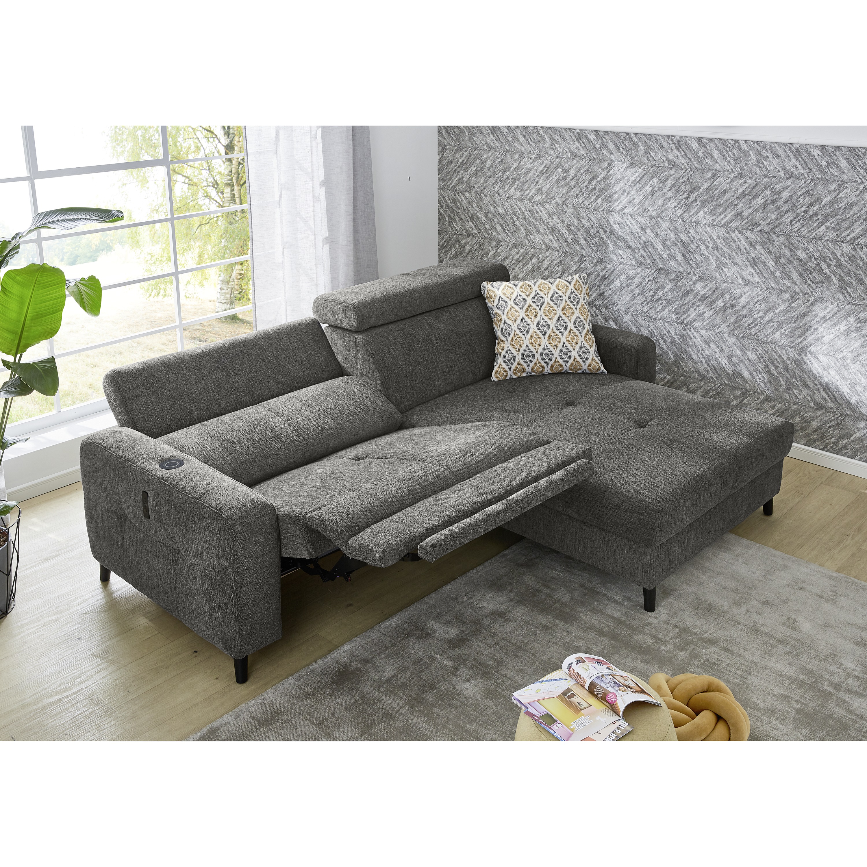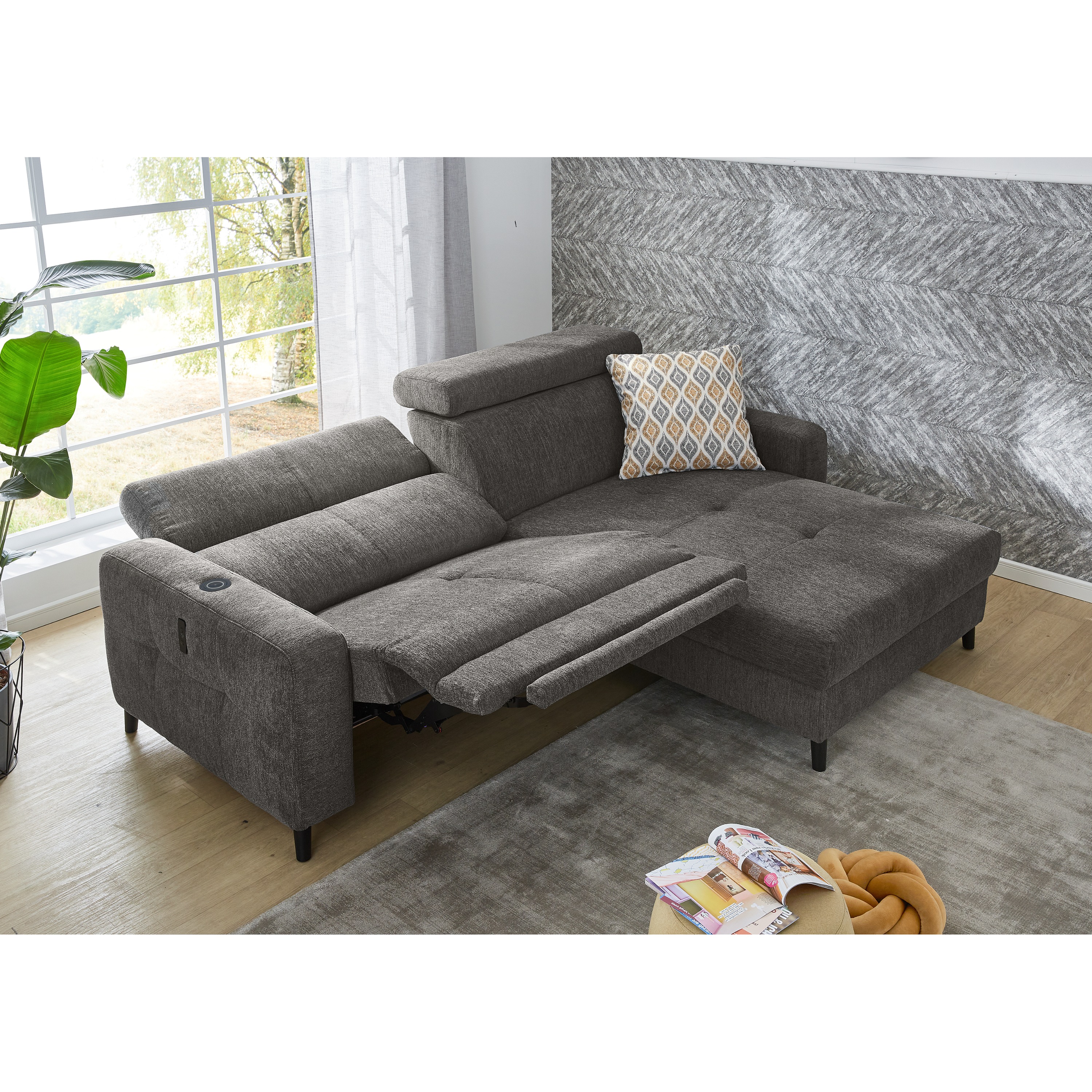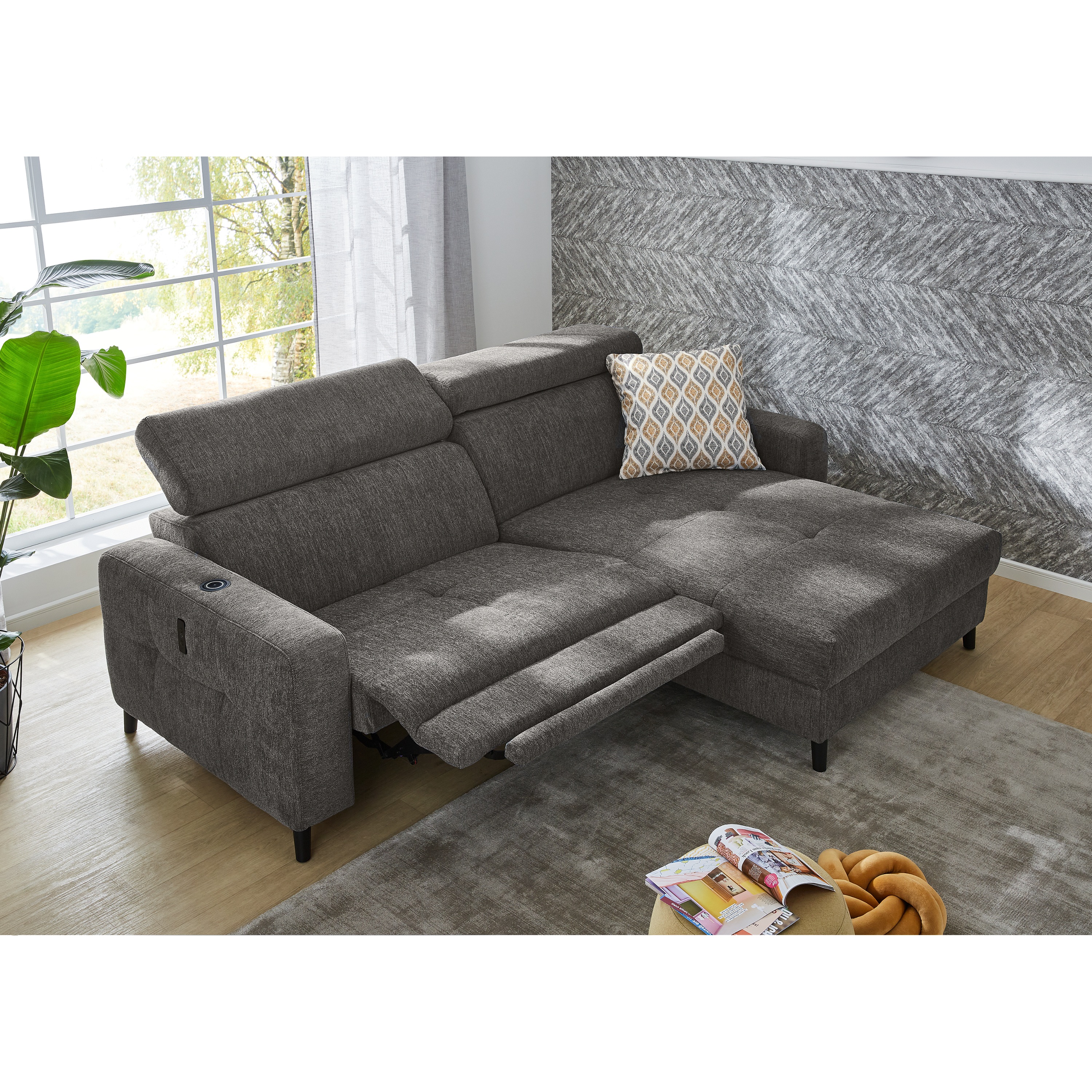 Sedací souprava nabízí komfortní sezení pro 3 osoby s výplní z polyuretanové pěny v kombinaci s vlnovým odpružením. Pro dosažení maximálního pohodlí sedačka umožňuje elektrické nastavení hloubky sedu a je vybavena také polohovatelnými opěrkami hlavy. Další doplňující funkce jako USB rozhraní a indukční nabíječka vytváří ze sedačky ultramoderní nábytek.