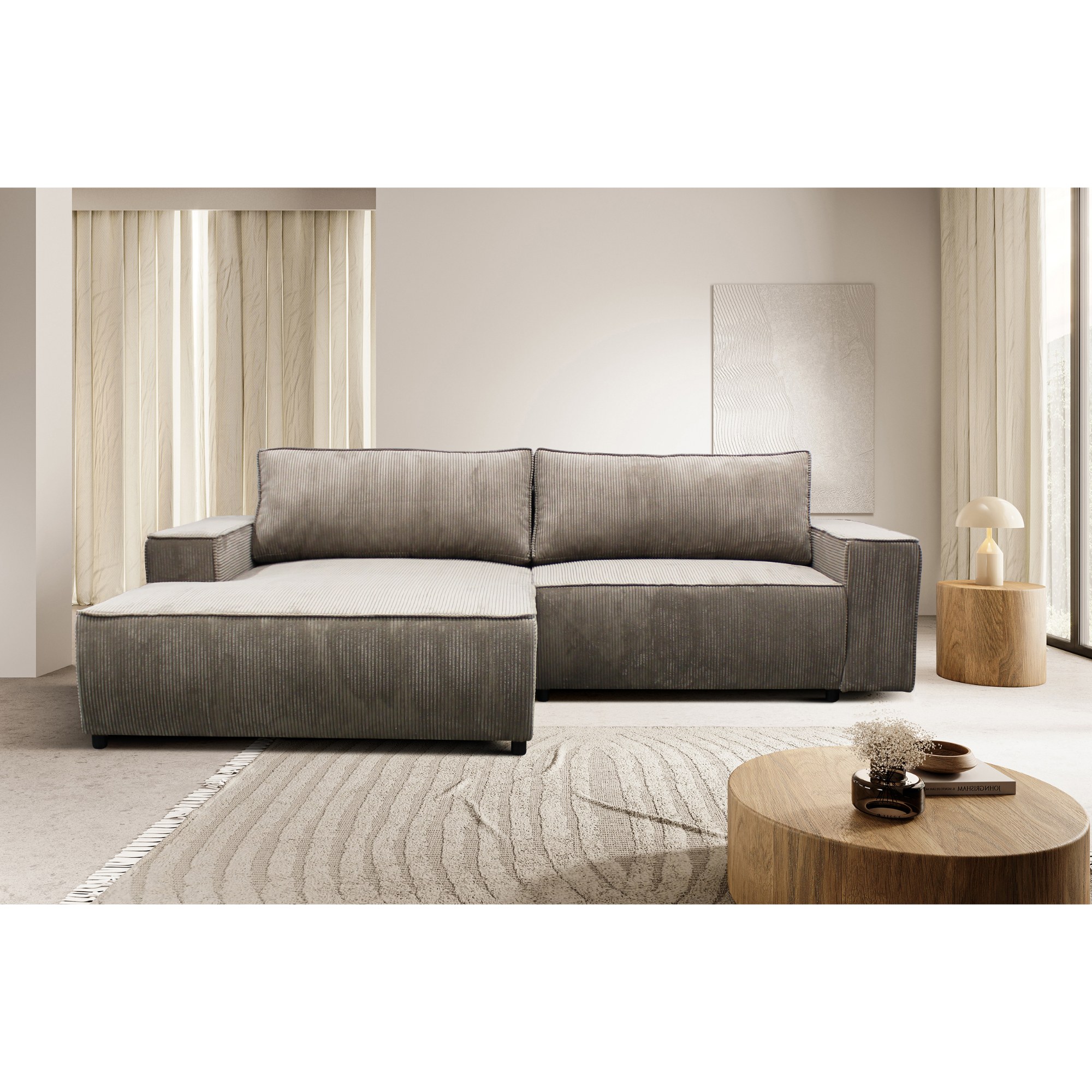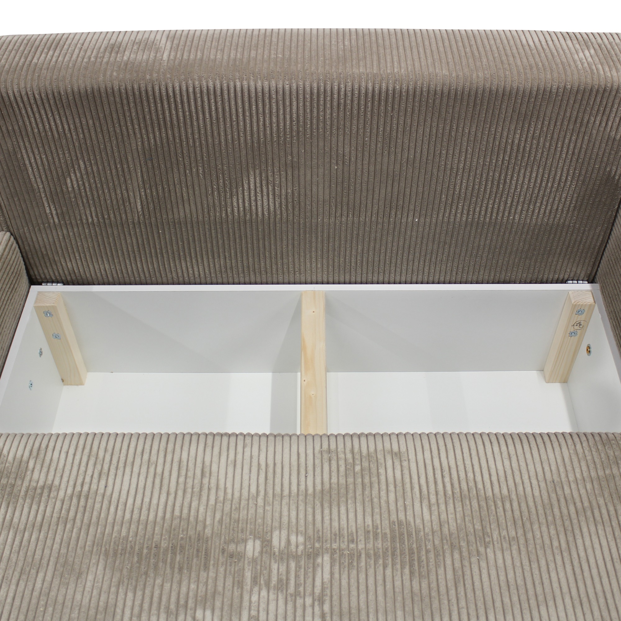 Sedačka je vybavena zádovými polštáři, které poskytují dodatečnou oporu pro záda a poskytují pohodlné místo k odpočinku. Díky svému manšestrovému vzhledu dělá sedačku útulnějším. Další výhodou této rohové sedačky je integrovaný úložný prostor na lůžkoviny. V případě potřeby můžete sedačku během chvilky proměnit na lůžko k občasnému přespání.
