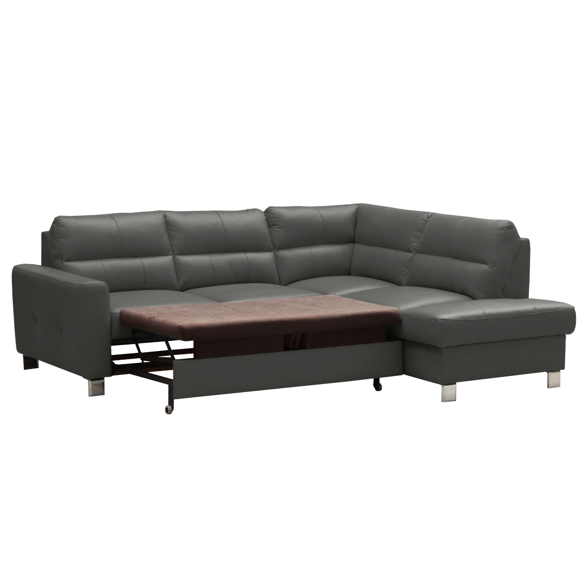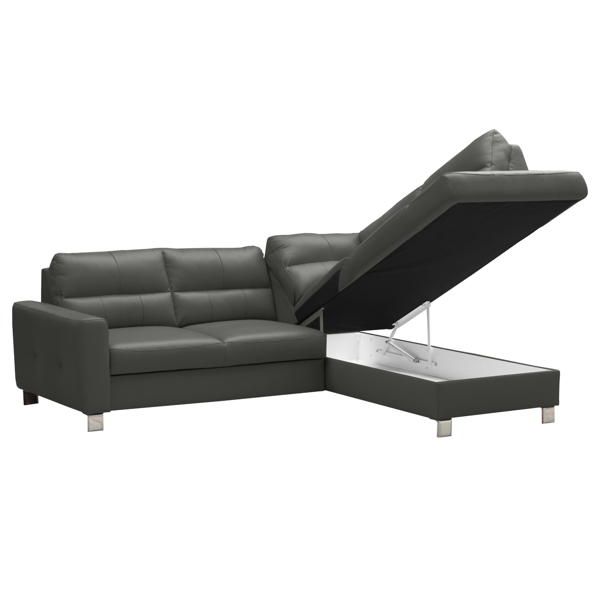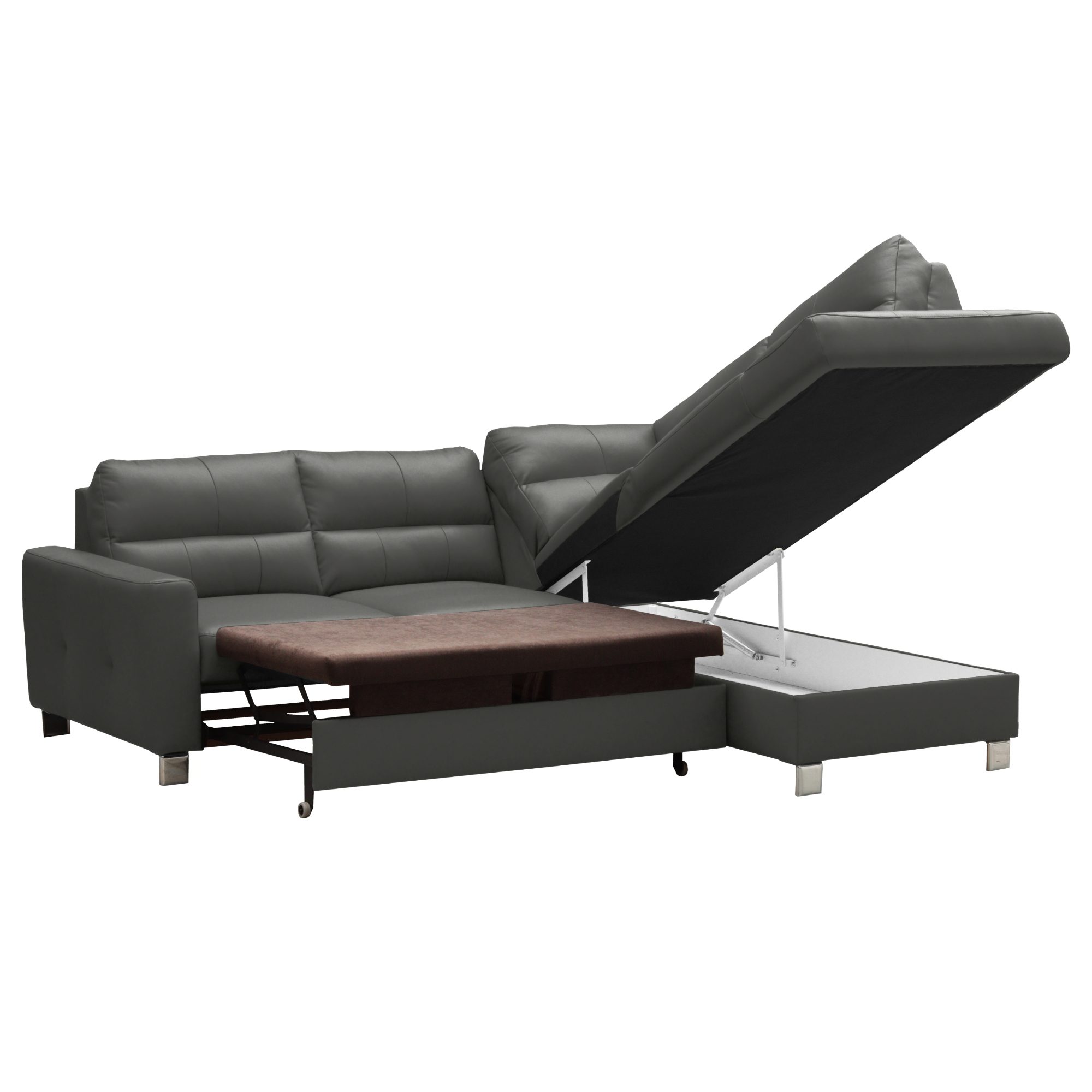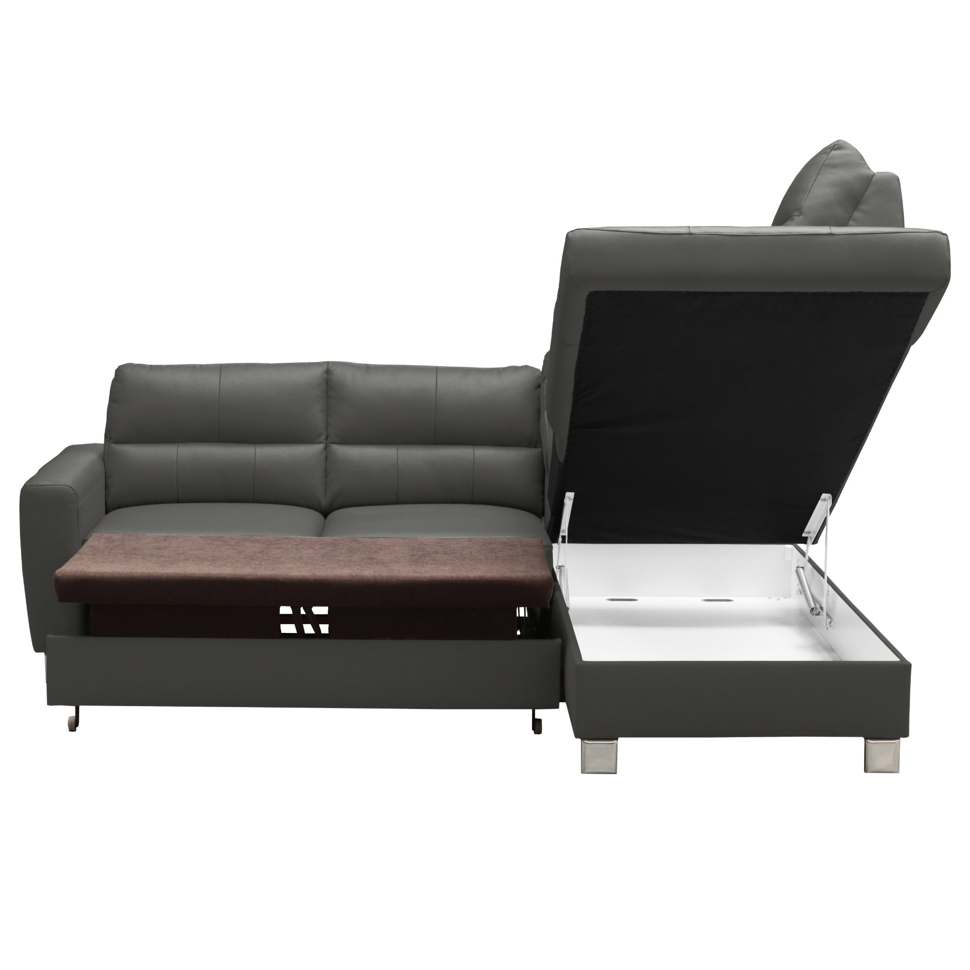 Konstrukce z masivního dřeva disponuje vlnovým odpružením na sedáku a elastickými popruhy v oblasti zádové opěrky. Maximální komfort je dosažen použitím vysoce kvalitní studené pěny. Souprava je pak potažená na dotek příjemnou kůží. Postačí pár jednoduchých kroků a sedačku proměníte na lůžko pro občasné přespání. Integrovaný úložný prostor zase poskytne místo pro lůžkoviny. Díky pochromovaným nožkám působí sedačka lehce, a navíc se pod ní snadno bude udržovat pořádek.