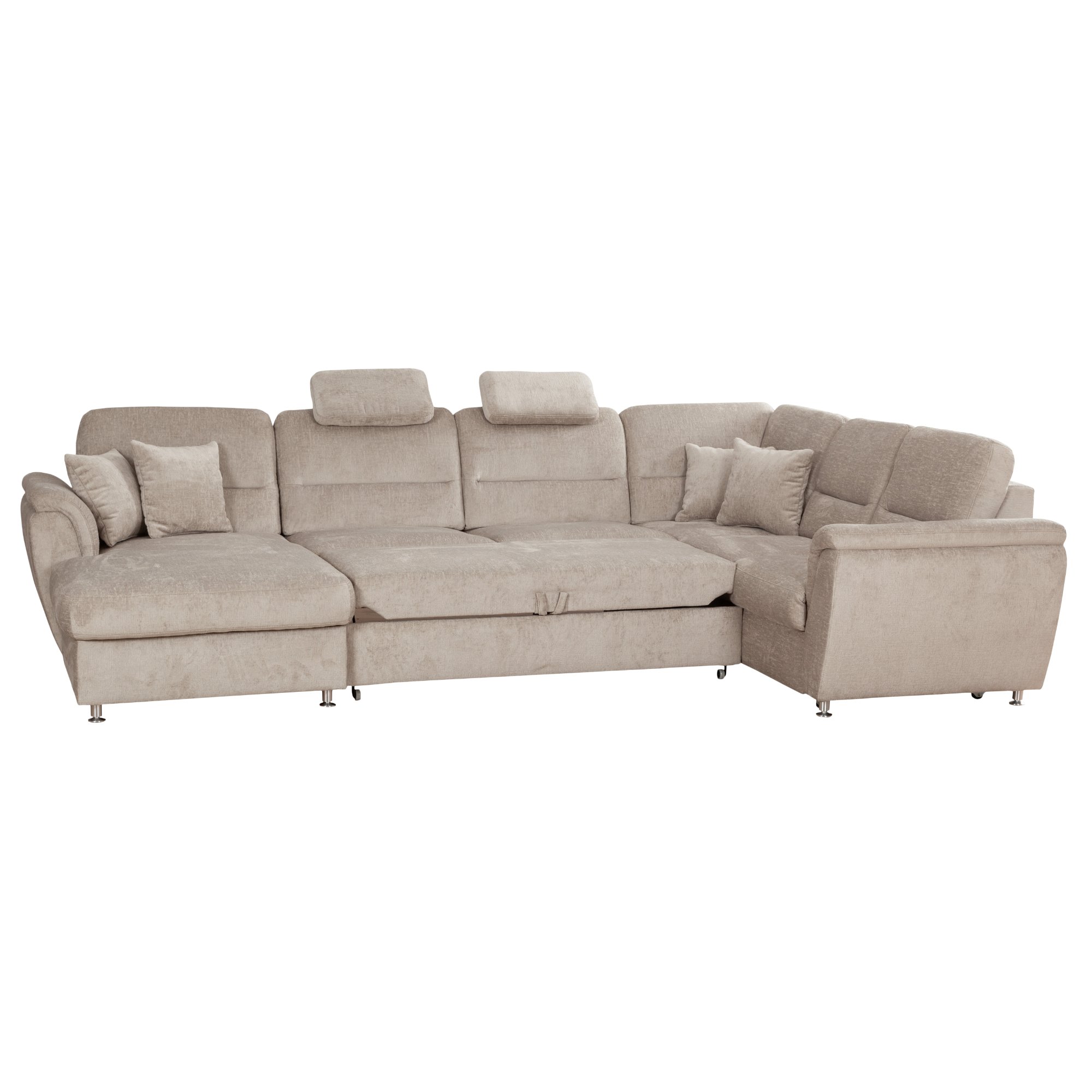 Sedačku lze v případě potřeby rozložit na lůžko, které se dá využít k občasnému přespání. Funkční konstrukce obsahuje i skryté úložné prostory se snadným přístupem, kam uschováte nepoužívané lůžkoviny. Potřebnou stabilitu potom zajišťují kovové nohy v barvě kovu. Celočalouněné provedení vám umožňuje sedací soupravu umístit i volně do prostoru.