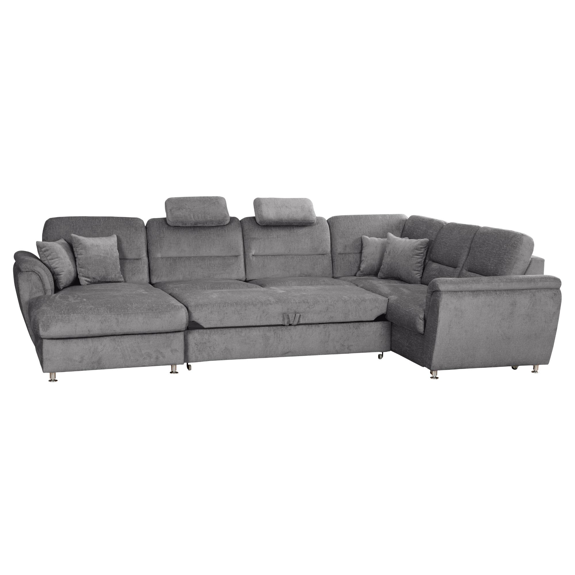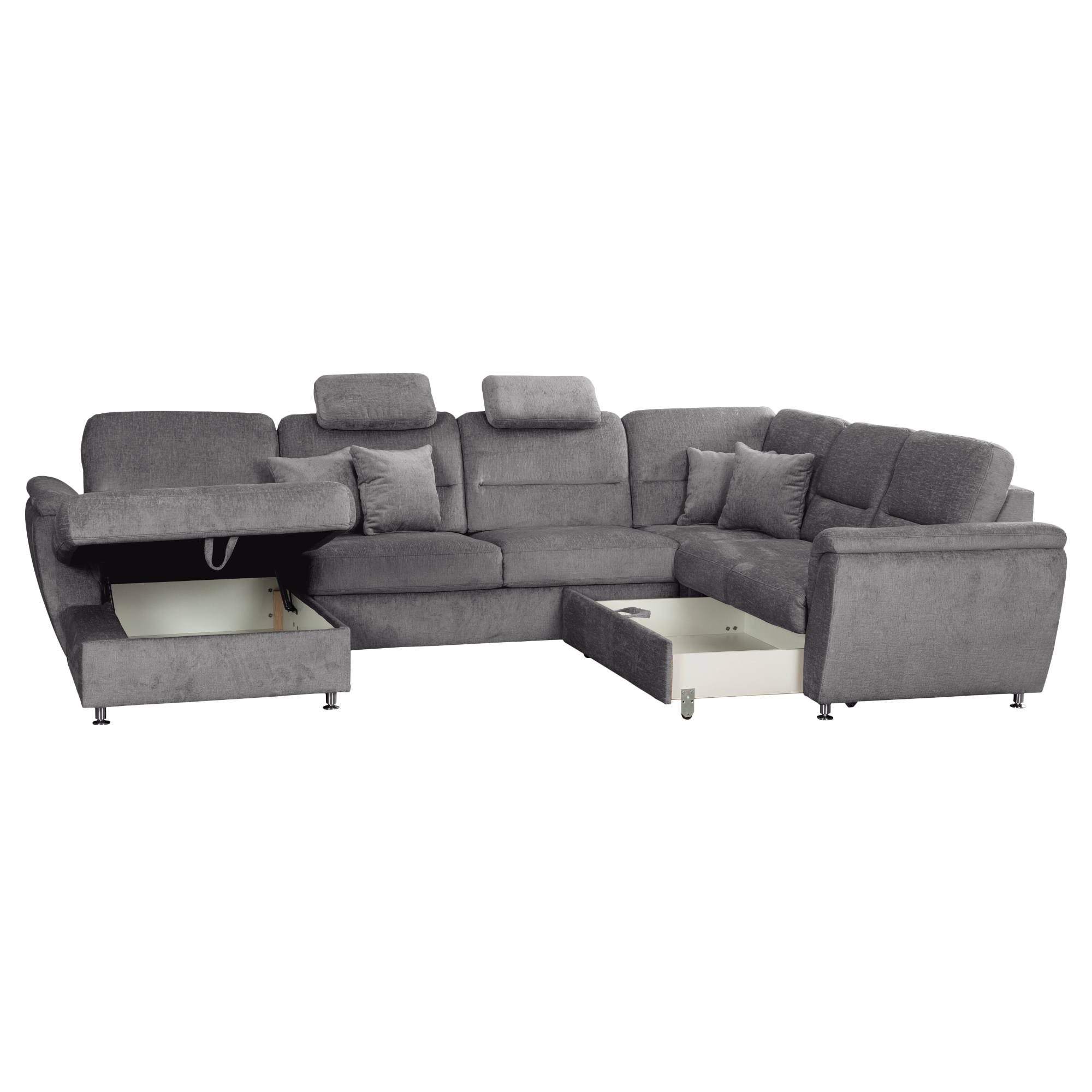 Sedačku lze v případě potřeby rozložit na lůžko, které se dá využít k občasnému přespání. Funkční konstrukce obsahuje i skryté úložné prostory se snadným přístupem, kam uschováte nepoužívané lůžkoviny. Potřebnou stabilitu potom zajišťují kovové nohy v barvě kovu. Celočalouněné provedení vám umožňuje sedací soupravu umístit i volně do prostoru.