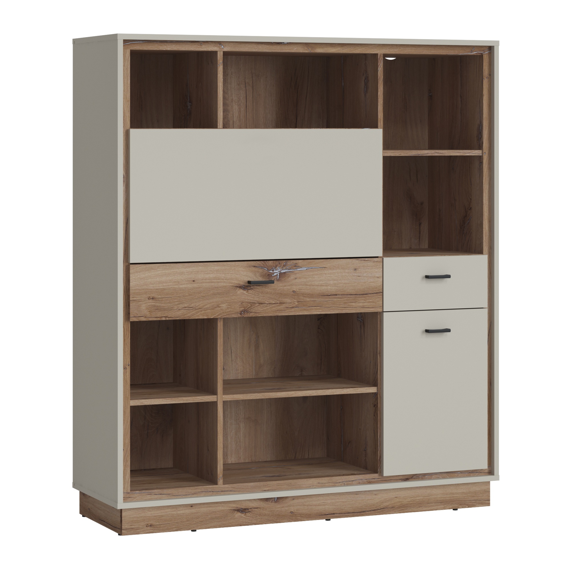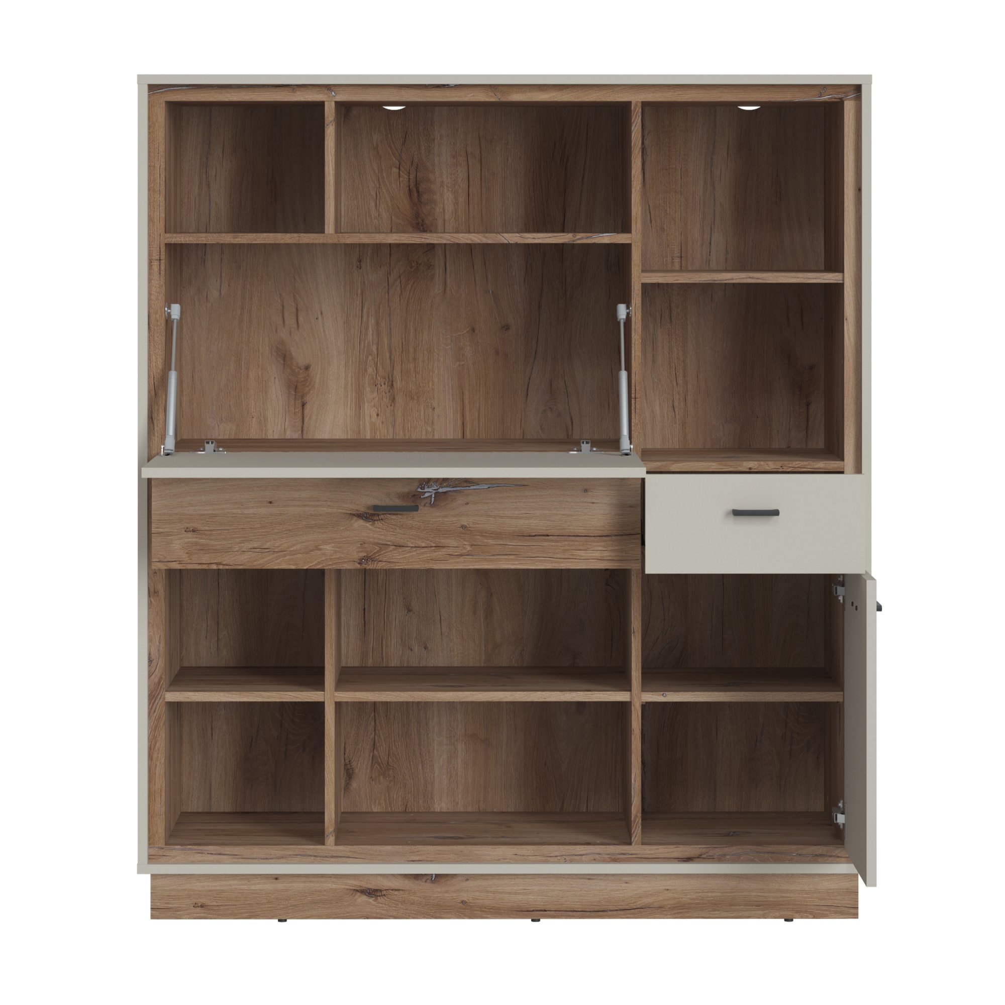 Vyroben je z laminovaného dřevěného materiálu, pro který je typická snadná udržovatelnost i dlouhá životnost. Design podtrhuje barevné sladění šedé s dekorem dubu tmavého. Okraje nábytku jsou hraněny ABS hranami, které eliminují riziko mechanického poškození. Bohatý úložný prostor je členěný do několika otevřených oblastí různých velikostí. Dále disponuje prostorem krytým dvířky a dvěma zásuvkami. Manipulaci navíc usnadňují černé kovové úchyty a tiché dovírání softclose.