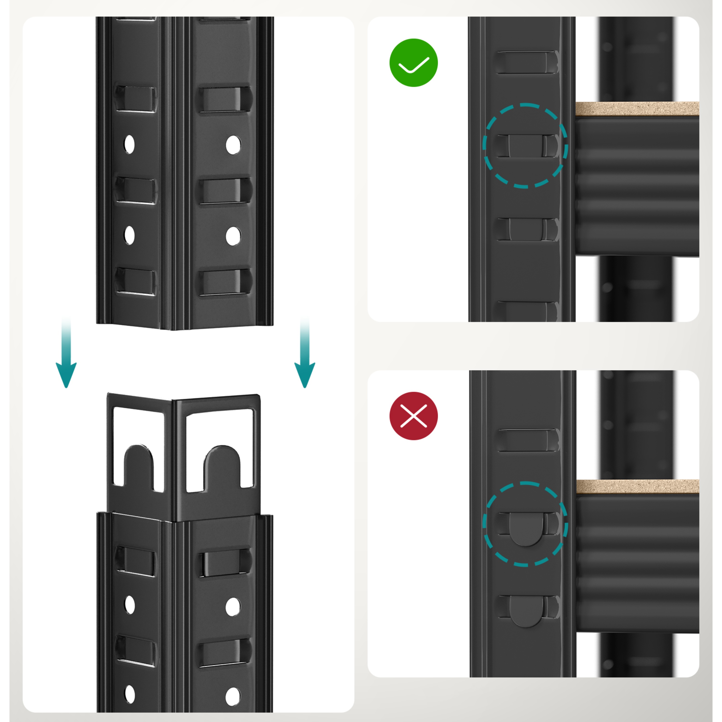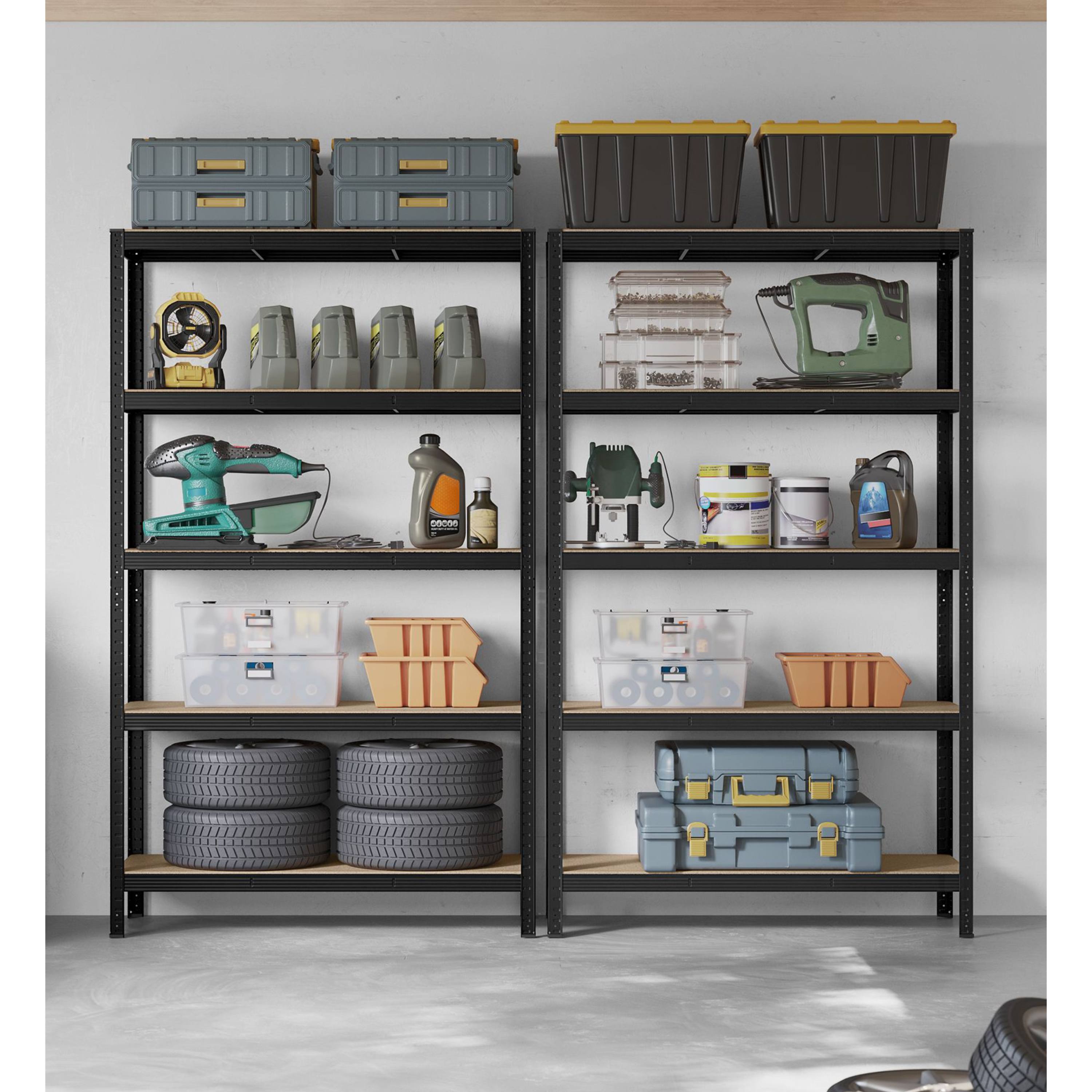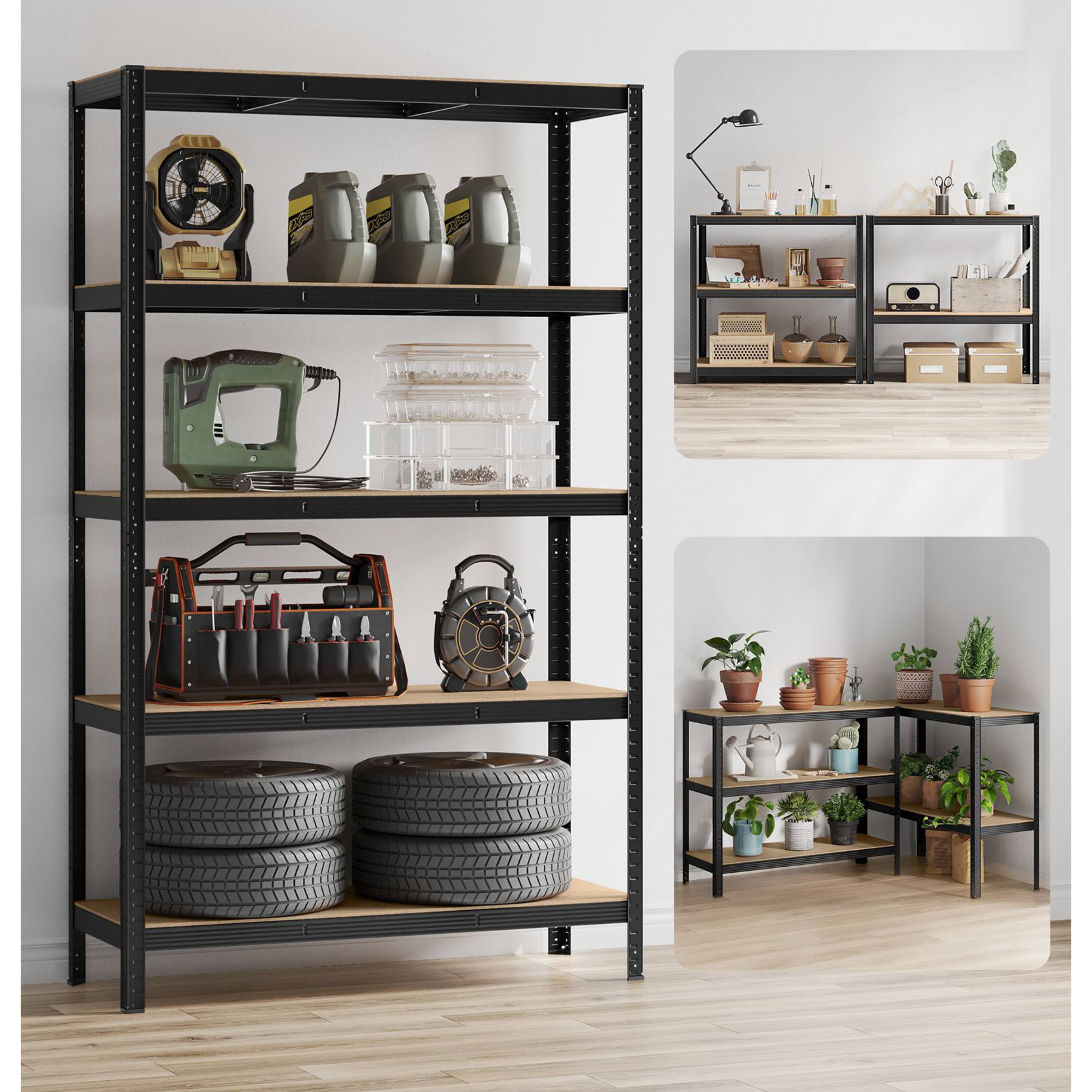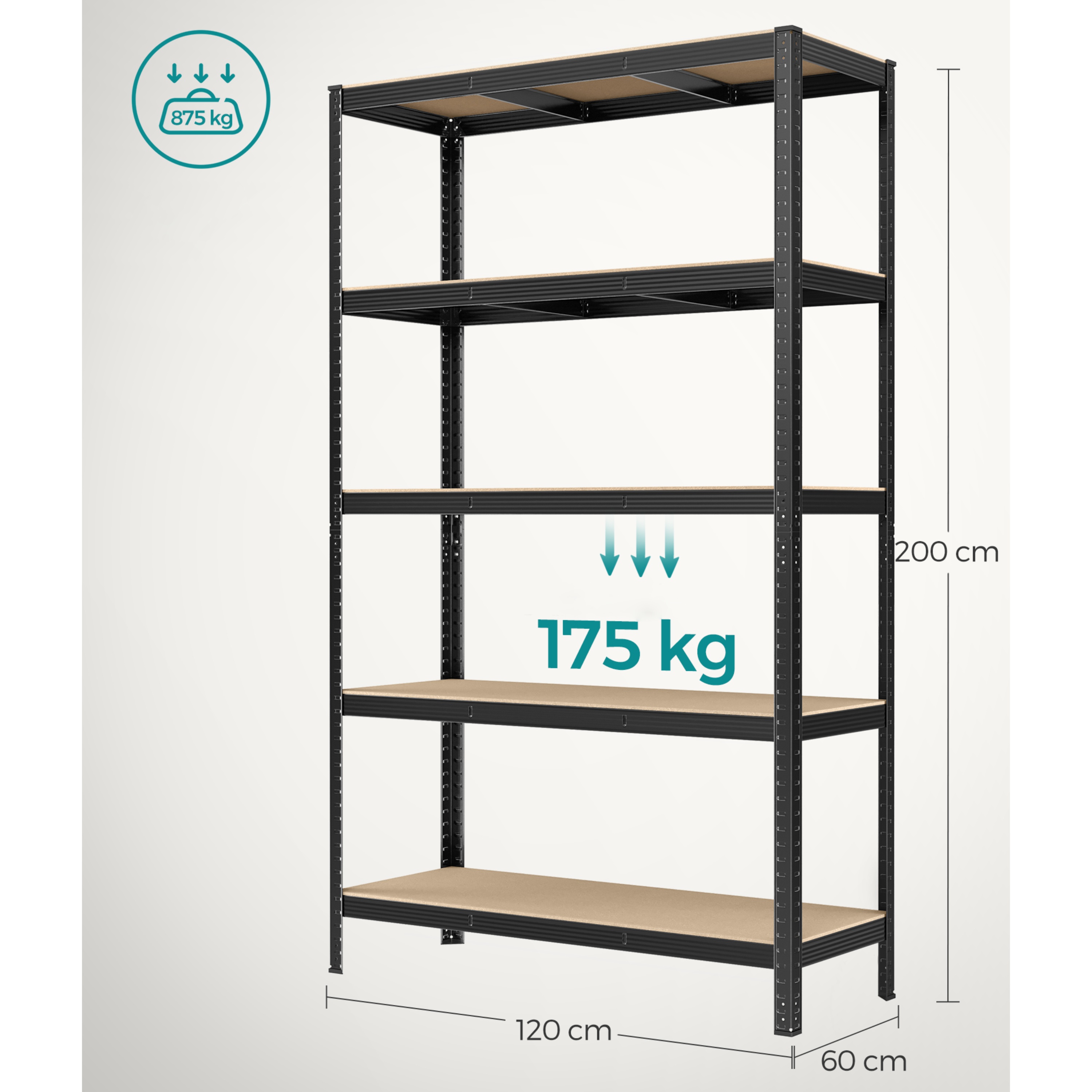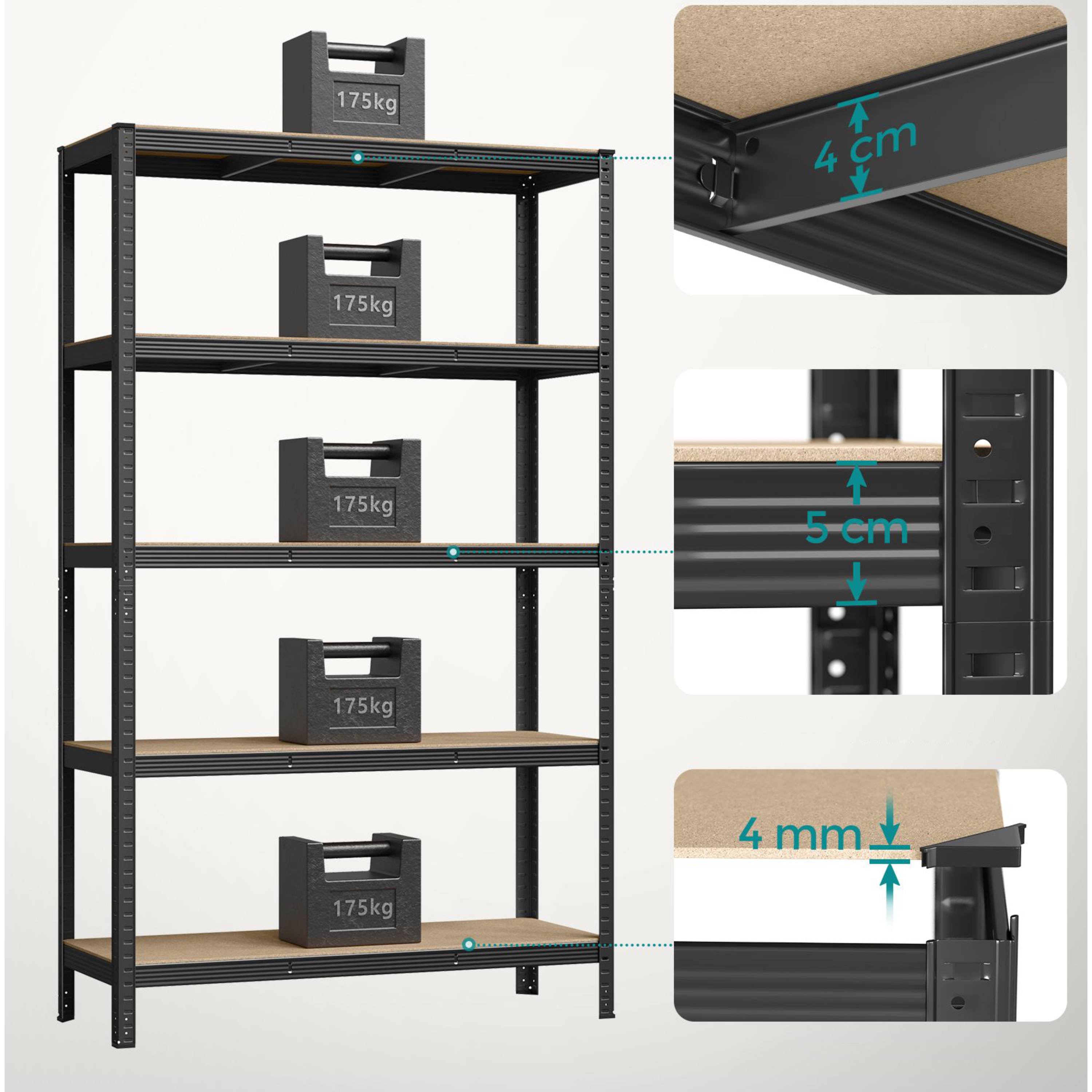 Zesílený rám je vyroben z kvalitní oceli a jednotlivé police jsou vyhotoveny z dřevovláknité desky. Příčky pod každou policí jim dodávají potřebnou oporu. Každá police má nosnost až 175 kg. Nemusíte se tedy obávat uložení předmětů s vyšší váhou. Regál disponuje také ochranou proti převrácení a nehrozí tak nebezpečí úrazu. Police jsou volitelně nastavitelné a regál můžete rozložit na dva menší samostatné kusy.