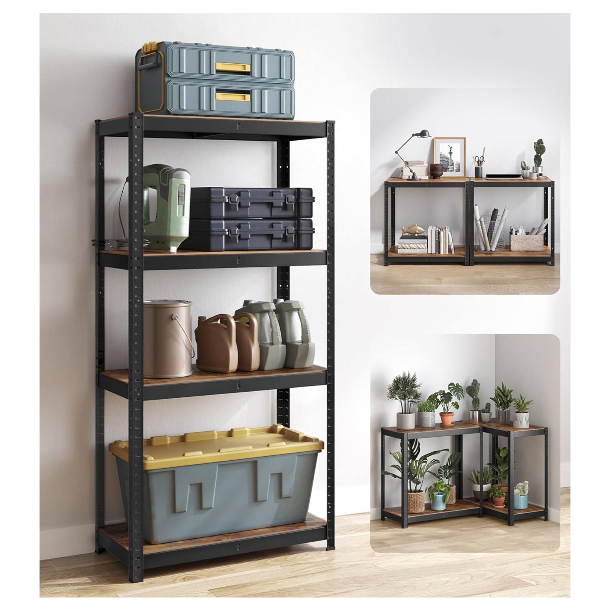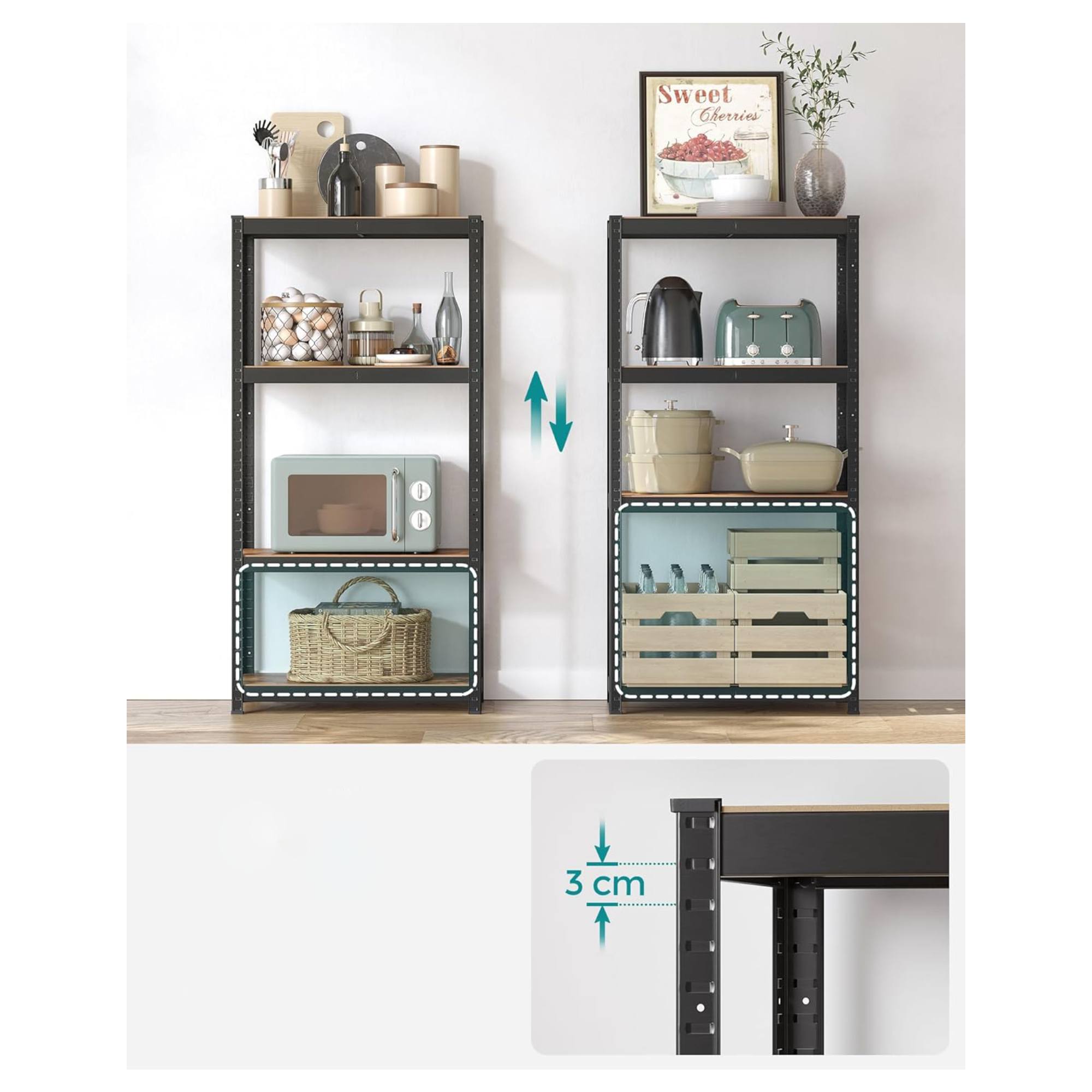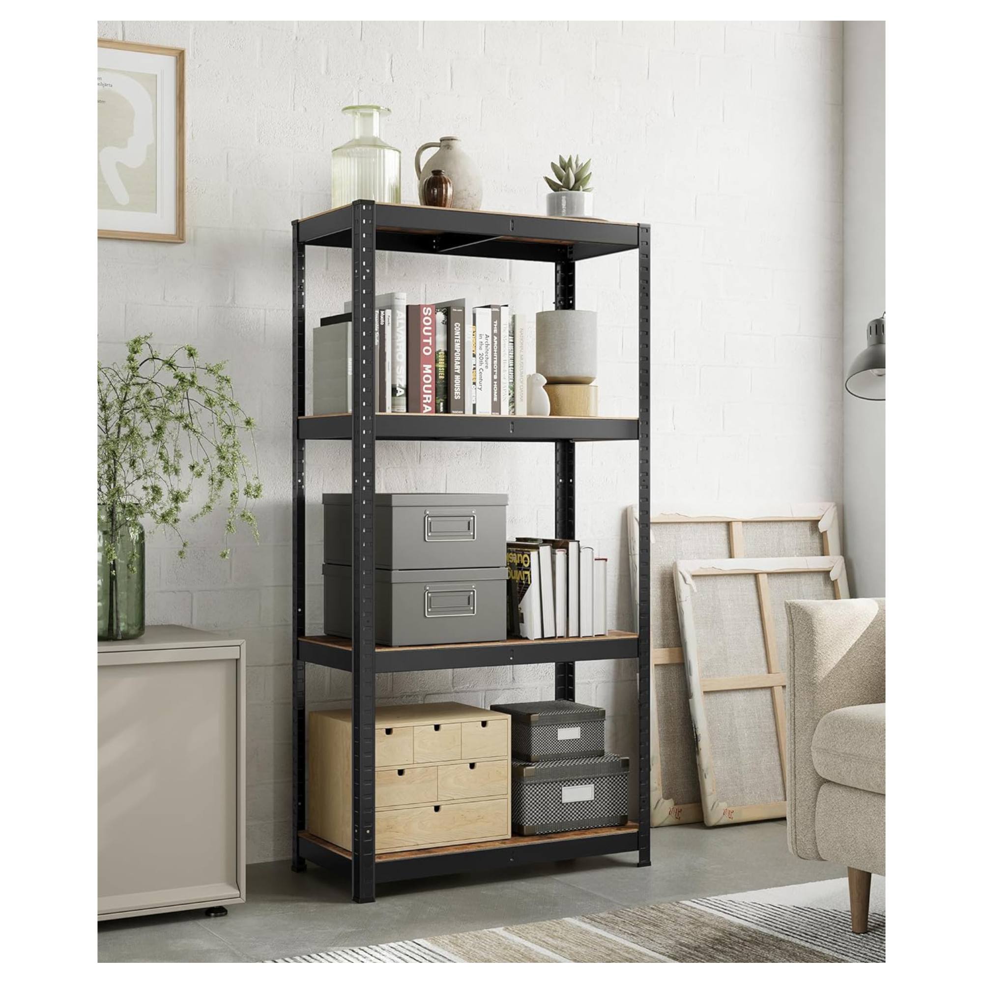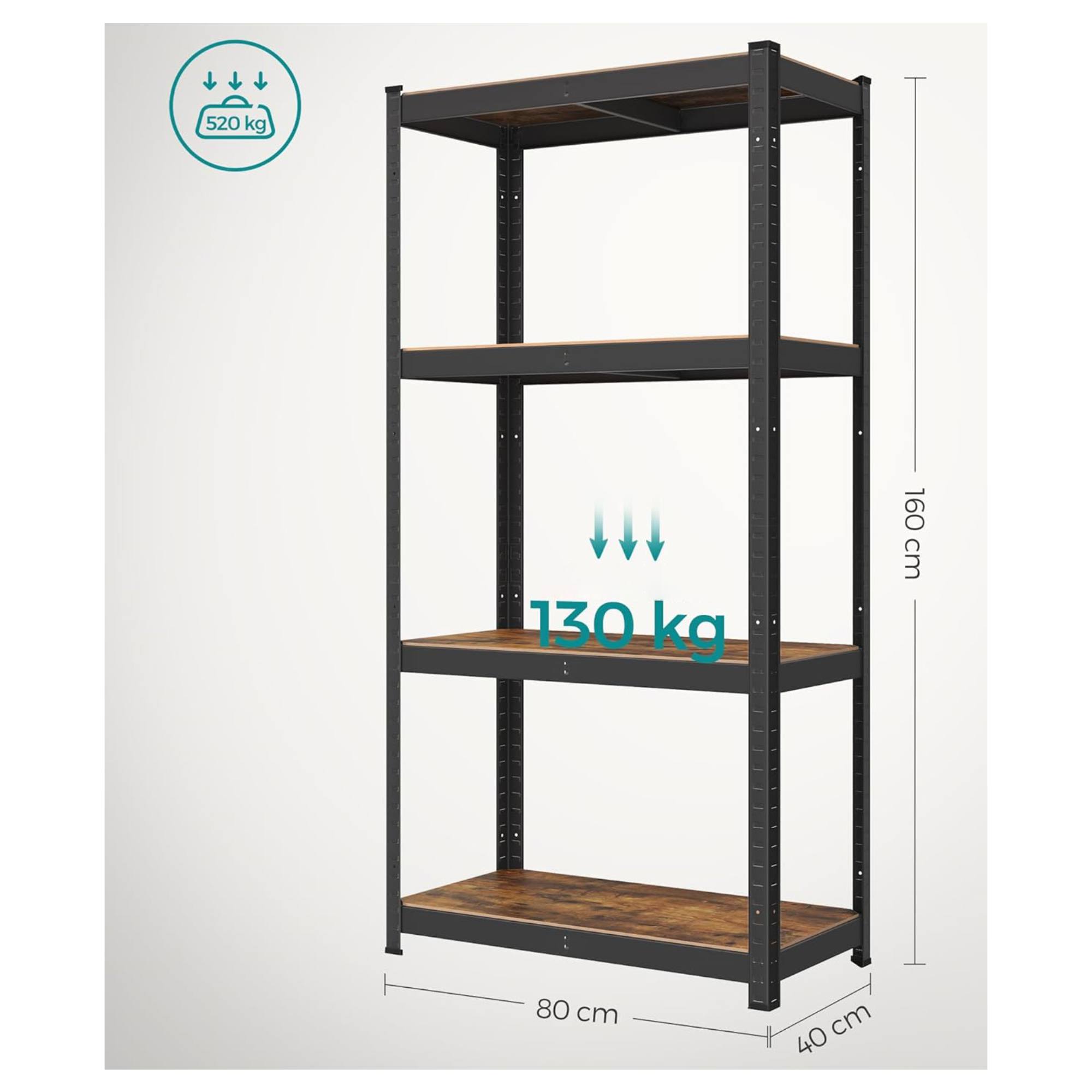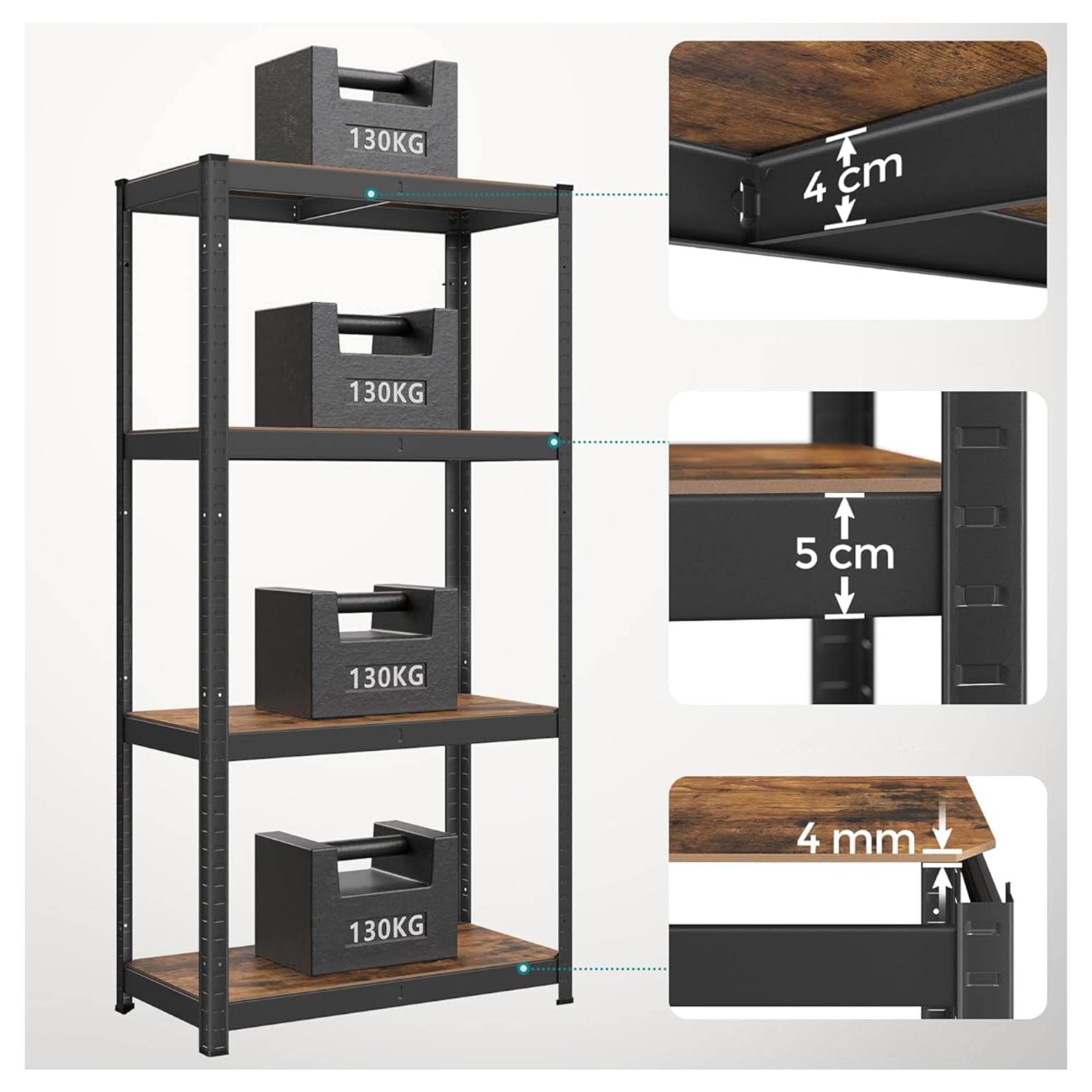 Má pevnou ocelovou konstrukci, kterou doplňují 4 police z dřevovláknité MDF desky. Každá police má nosnost 130 kg a je zesílena příčnou tyčí, která zajistí bezpečné uložení i těžších předmětů. Všechny police jsou nastavitelné po 3 cm, poskytují tedy snadné přizpůsobení vašim potřebám. Praktické provedení umožňuje také rozdělení na 2 samostatné části.