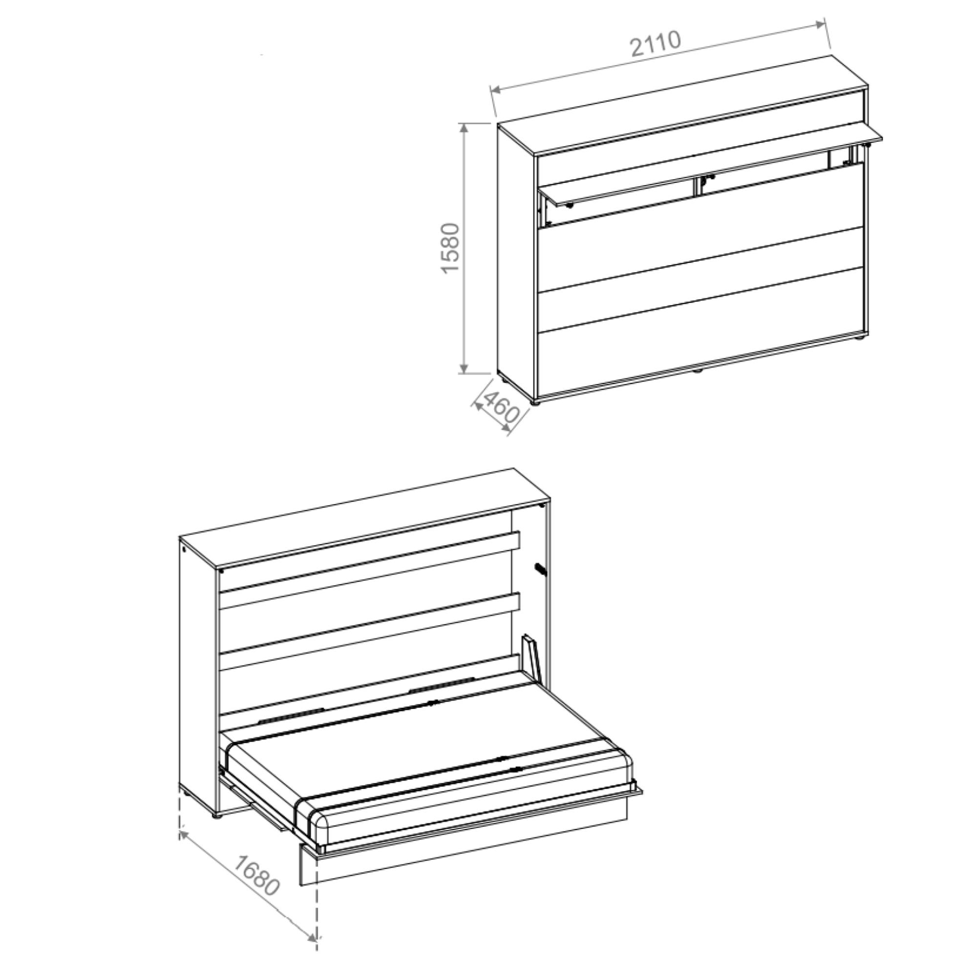 Funkční propojení postele s úložnými prostory v jednoduchém designu lehce zkombinujete s jakýmkoliv interiérem. Výklopná postel v horizontální poloze je včetně roštů. Matraci si určitě vyberete z naší široké nabídky matrací, aby bylo vaše lůžko kompletní. Matraci vybírejte do výšky 21 cm tak, aby vám šla postel bez problémů složit. Součástí balení jsou úchyty na zeď a bezpečnostní mechanismus s pneumatickými zvedáky proti samovolnému otevření a převržení postele. Sklápěcí postel nelze připevnit ke stěně ze sádrokartonu. Správné připevnění postele ke stěně je klíčové, přistupujte tedy k montáži zodpovědně dle montážního plánu. Postel je navíc vybavena praktickými popruhy do kterých snadno zapnete lůžkoviny a peřina i polštář zmizí společně s postelí. Nepotřebujete tak žádný další úložný prostor.