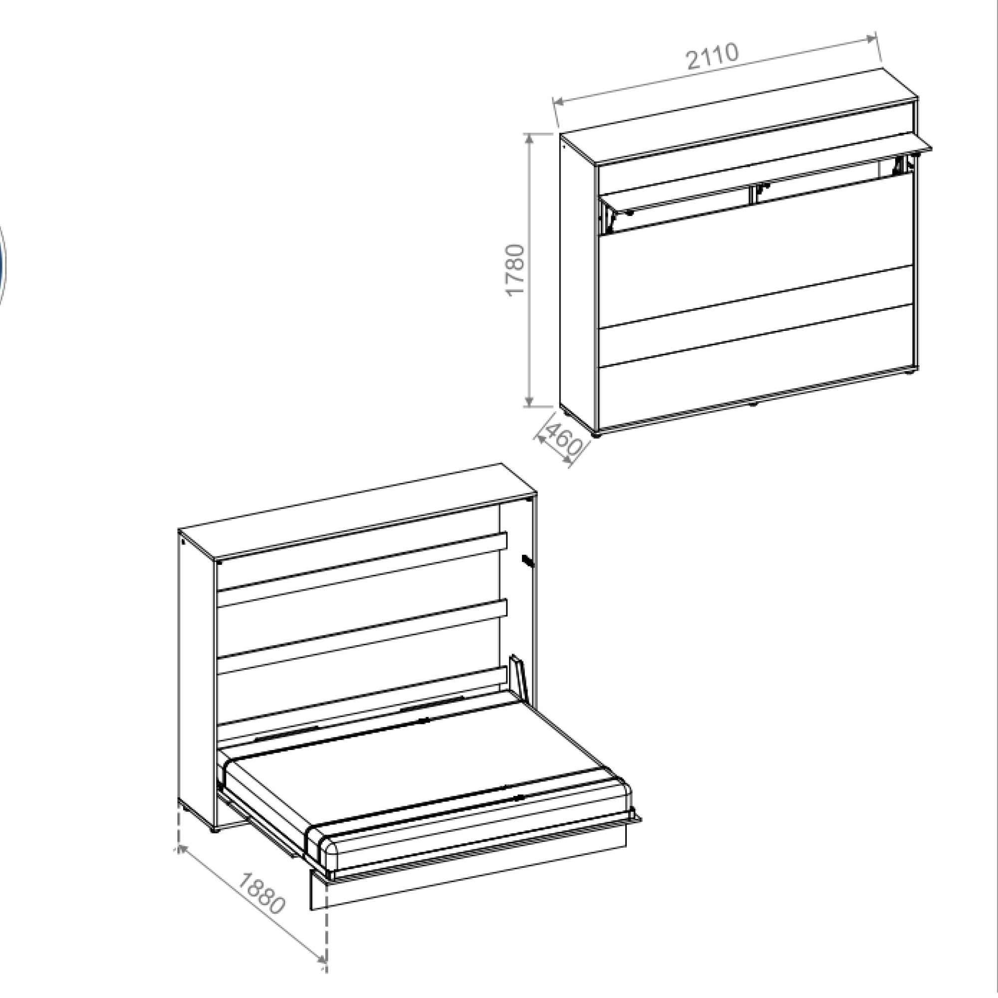 Funkční propojení postele s úložnými prostory v jednoduchém designu lehce zkombinujete s jakýmkoliv interiérem. Výklopná postel v horizontální poloze je včetně roštů. Matraci si určitě vyberete z naší široké nabídky matrací, aby bylo vaše lůžko kompletní. Matraci vybírejte do výšky 21 cm tak, aby vám šla postel bez problémů složit. Součástí balení jsou úchyty na zeď a bezpečnostní mechanismus s pneumatickými zvedáky proti samovolnému otevření a převržení postele. Sklápěcí postel nelze připevnit ke stěně ze sádrokartonu. Správné připevnění postele ke stěně je klíčové, přistupujte tedy k montáži zodpovědně dle montážního plánu. Postel je navíc vybavena praktickými popruhy do kterých snadno zapnete lůžkoviny a peřina i polštář zmizí společně s postelí. Nepotřebujete tak žádný další úložný prostor.