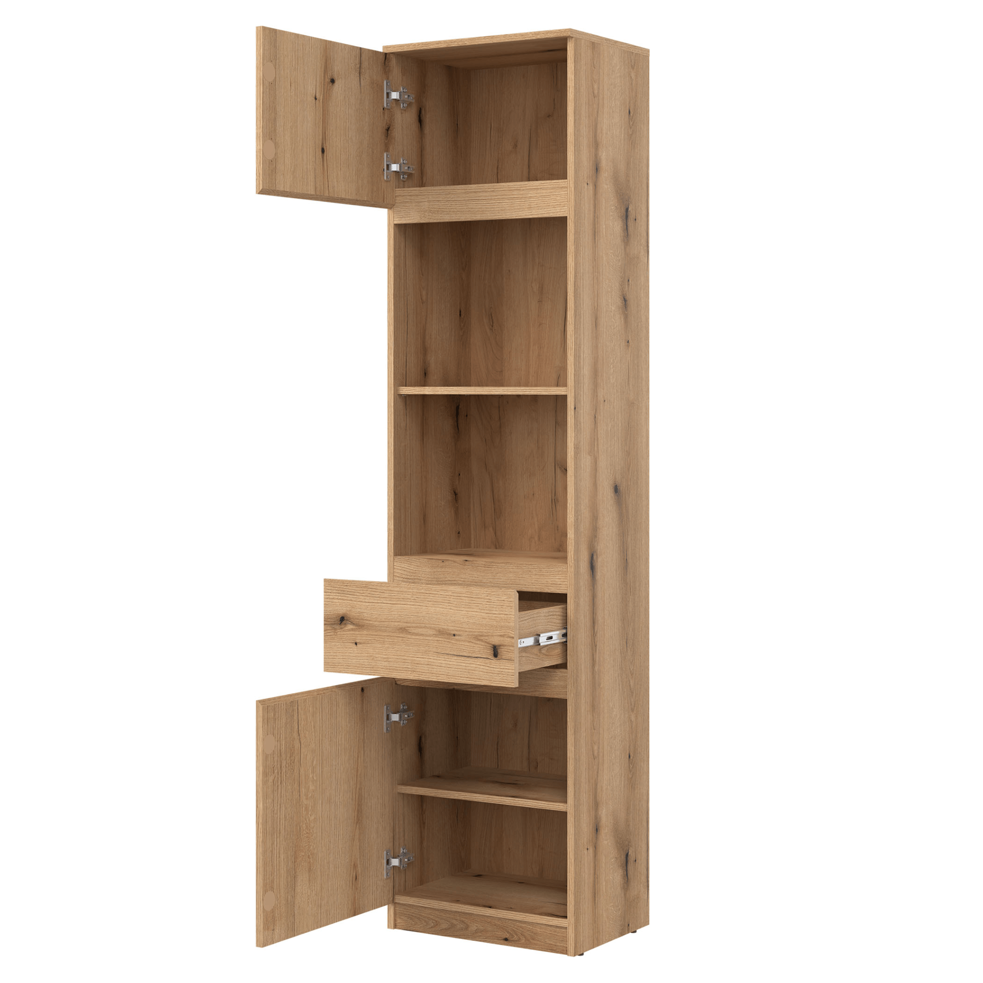 Skříň ERNIE RM08 díky svému nadčasovému stylu zapadne téměř do jakéhokoli stylu obývacího pokoje či pracovny. Částečně uzavíratelná skříň nabízí bohatý úložný prostor ve formě 2 vložených polic a 1 praktické zásuvky. Spodní a horní část je uzavíratelná pomocí 2 otočných dveří, u kterých se během montáže můžete rozhodnout zda se budou otevírat na levou či na pravou stranu. Vyrobena je z laminovaného dřevěného materiálu, pro který je typická snadná udržovatelnost. Bezúchytové provedení přidává na čistém vzhledu.