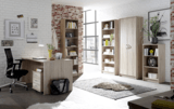 Skříň má 2 otočné dveře, za nimiž se nachází vnitřní vybavení, které je sestaveno z 4 vložených polic. Decentní úchytky usnadňují otevírání otočných dveří. Skříň je vyrobena z laminovaného dřevěného materiálu, který je odolný a nenáročný na údržbu.