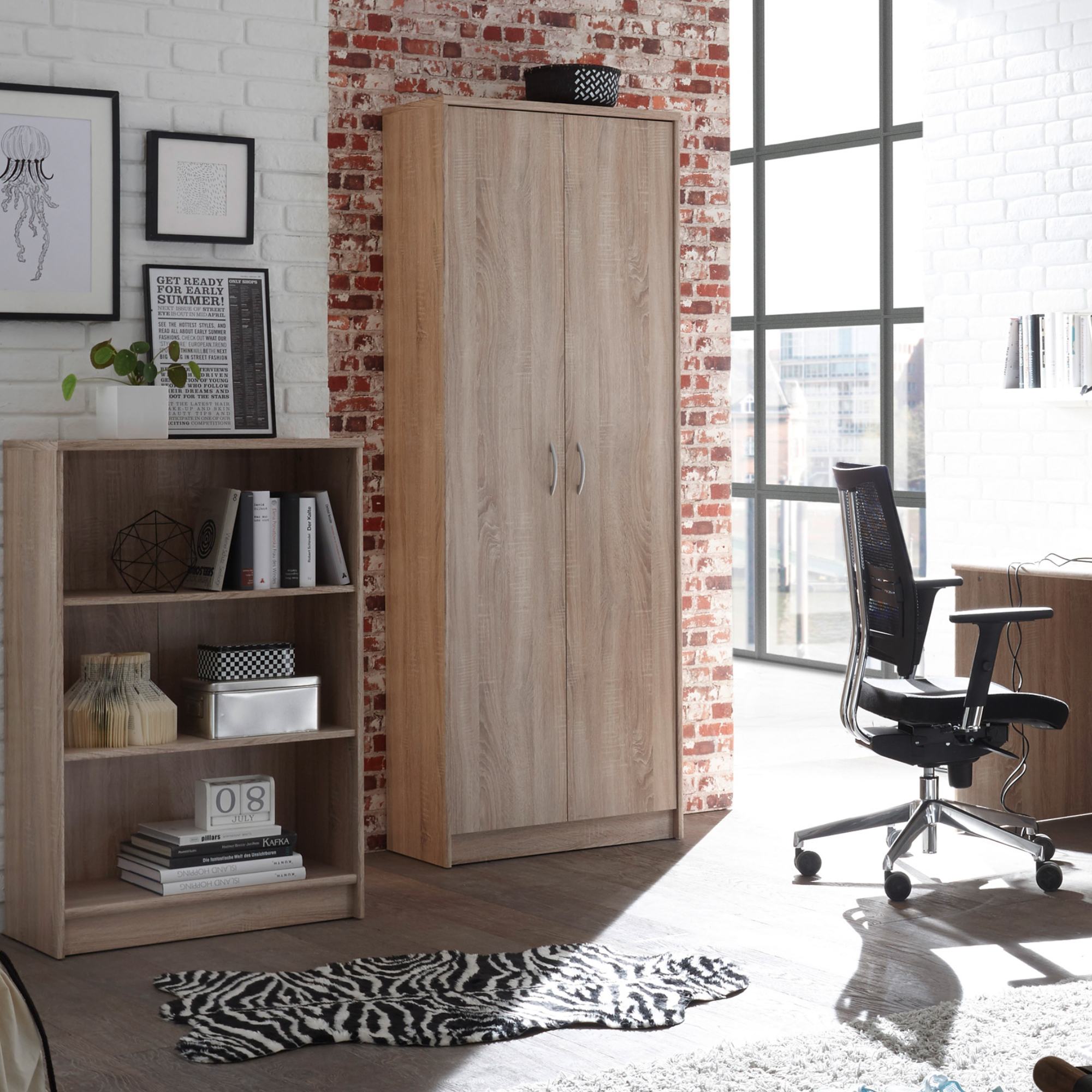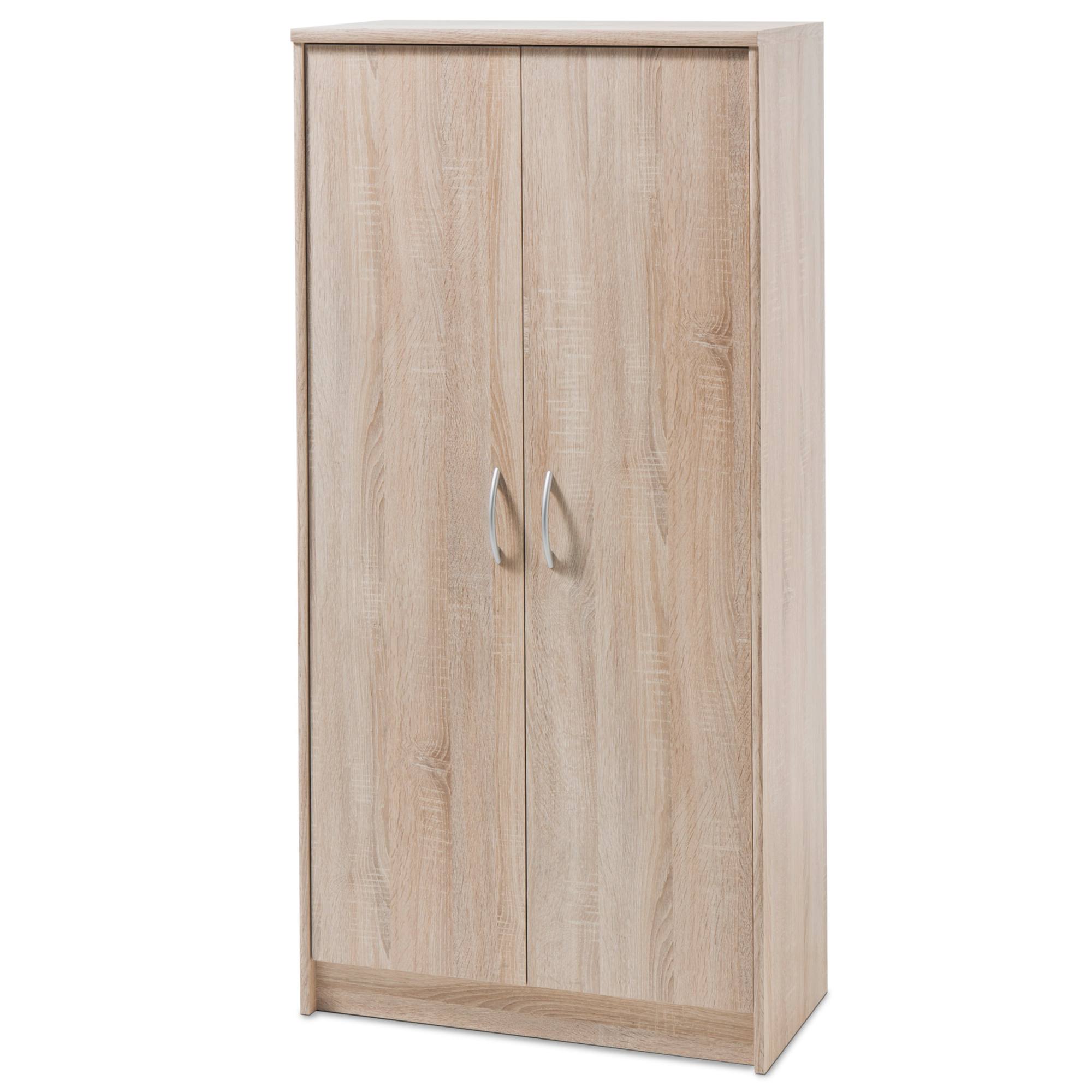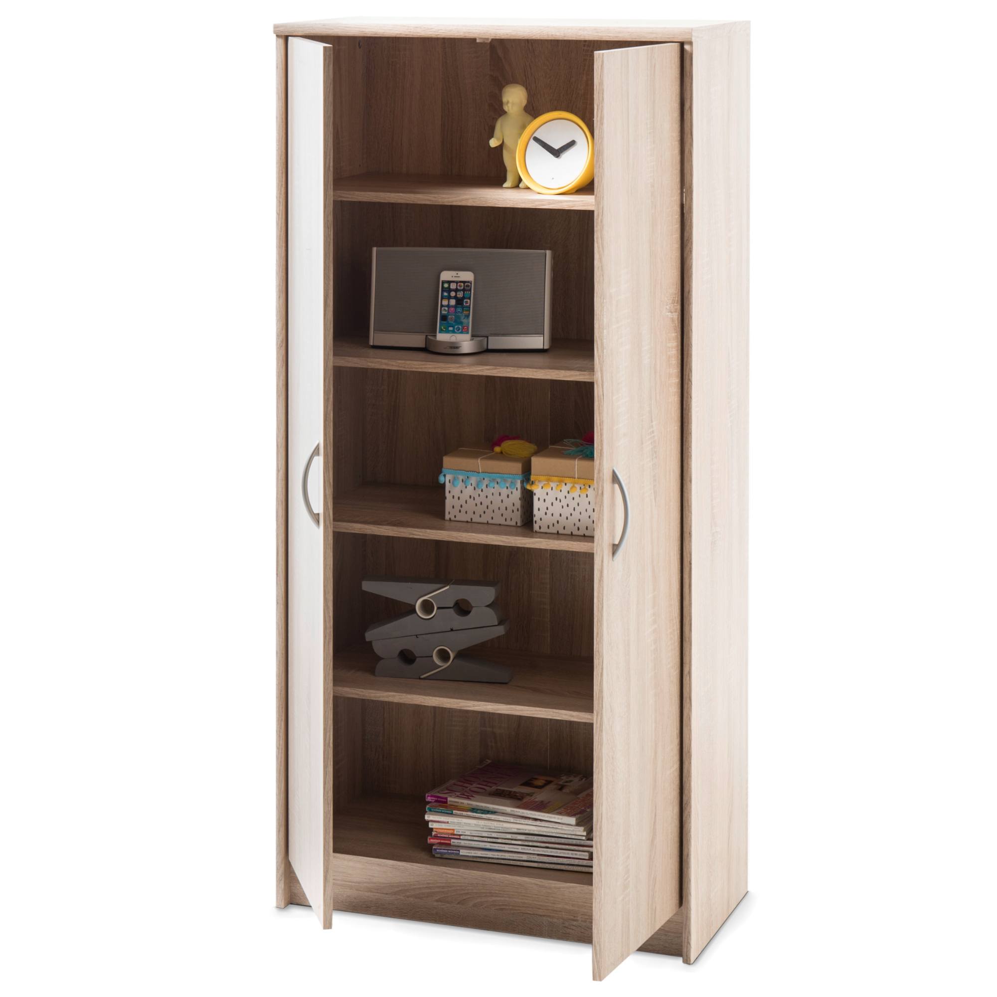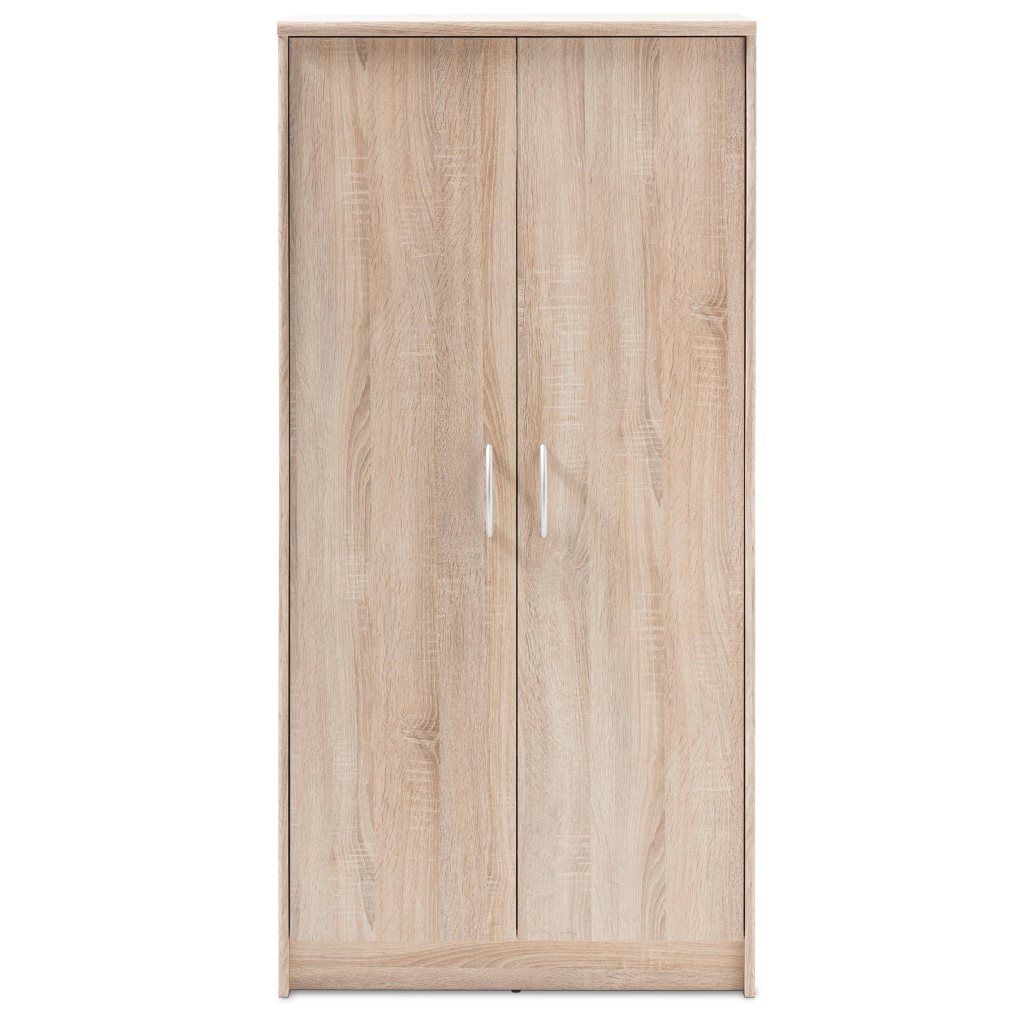 Skříň má 2 otočné dveře, za nimiž se nachází vnitřní vybavení, které je sestaveno z 4 vložených polic. Decentní úchytky usnadňují otevírání otočných dveří. Skříň je vyrobena z laminovaného dřevěného materiálu, který je odolný a nenáročný na údržbu.