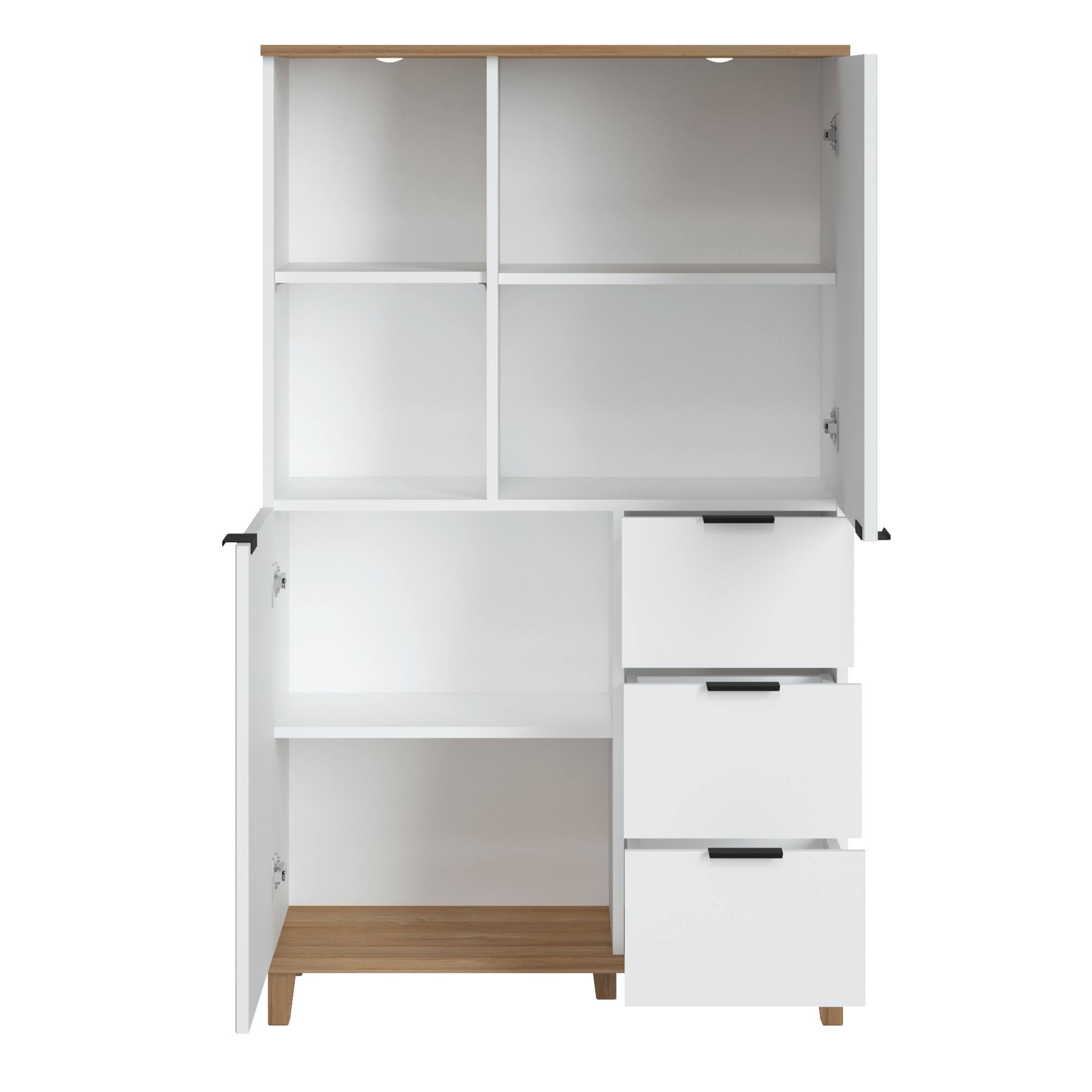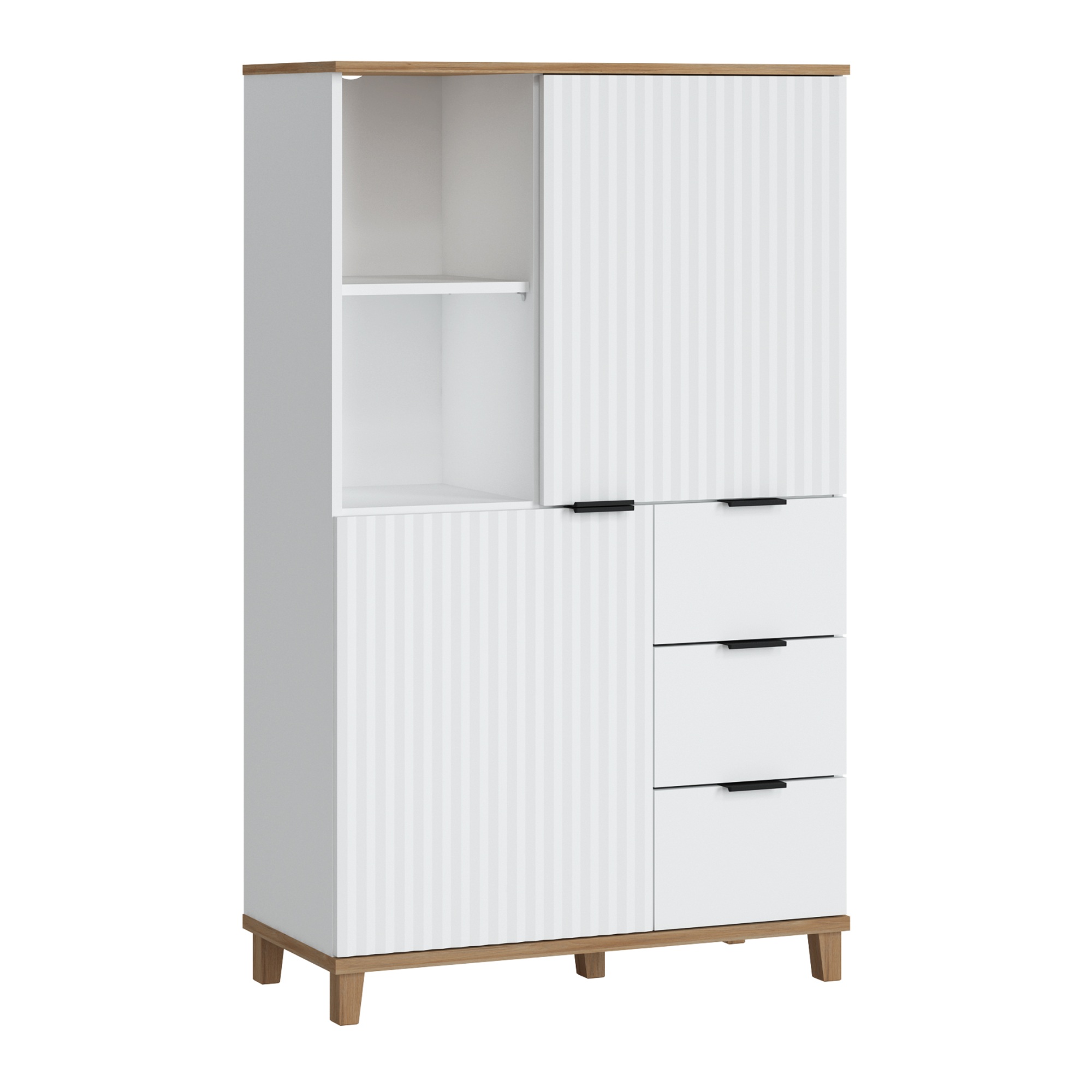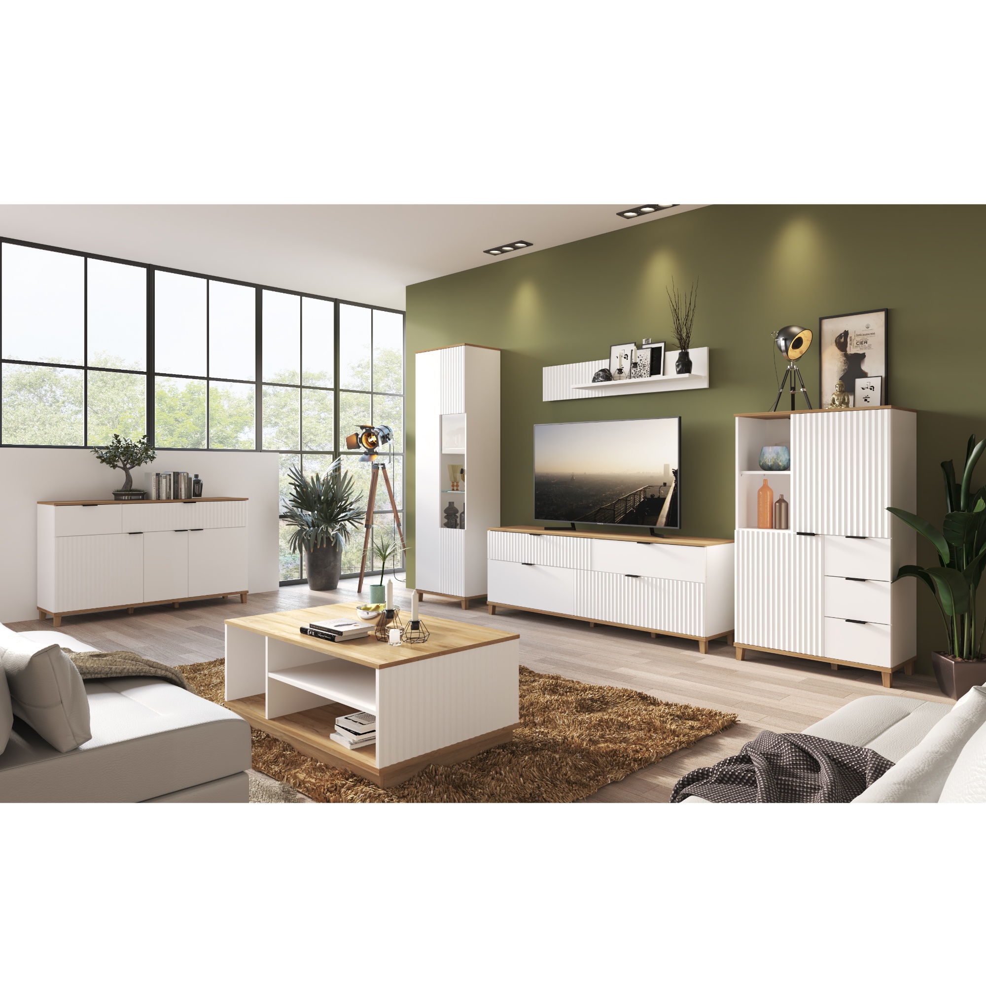 Vyrobena je v kombinaci laminovaného dřevěného materiálu a dřevovláknitých desek MDF, pro které je typická snadná udržovatelnost i dlouhá životnost. Horní část disponuje otevřeným prostorem s policí na levé straně a uzavřeným na pravé. Spodní oblast pak nabízí trojici zásuvek napravo a krytý prostor dělený policí nalevo. Manipulaci usnadňují černé kovové úchyty. Okraje nábytku jsou navíc opatřeny ABS hranami, které eliminují riziko mechanického poškození. Kontrastní barevné provedení, ve kterém se střetává alpská bílá s dekorem dubu grandson, domácnosti vdechne jiskru i dojem přírody. Moderní design pak podtrhují dvířka s dekorativním frézováním.