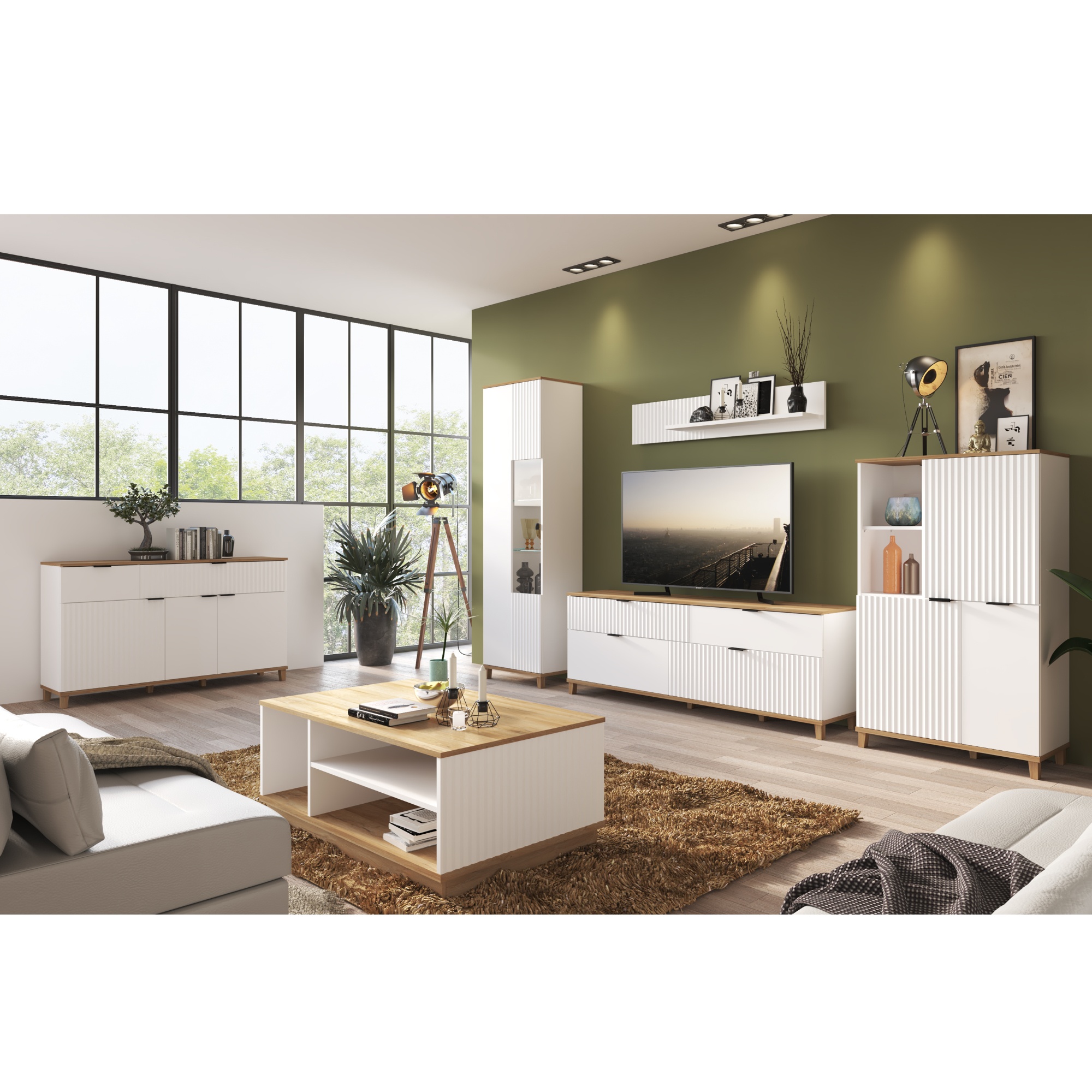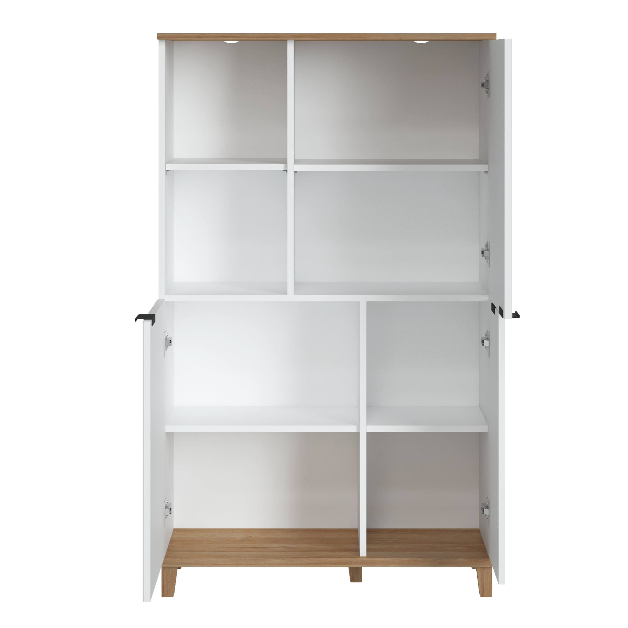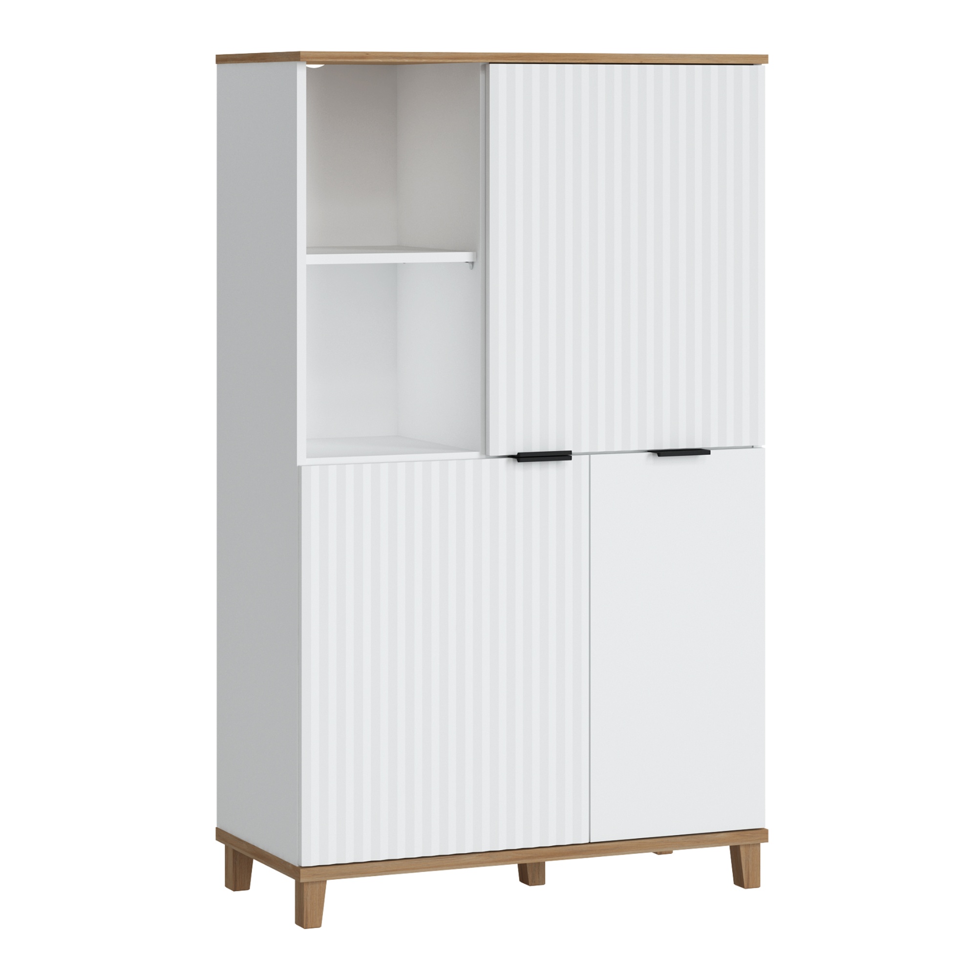 Vyrobena je v kombinaci laminovaného dřevěného materiálu a dřevovláknitých desek MDF, pro které je typická snadná udržovatelnost i dlouhá životnost. Horní část disponuje otevřeným prostorem s policí na levé straně a uzavřeným prostorem s policí na pravé. Spodní oblast pak kryje dvojice dvířek, za kterými se ukrývají další dvě sekce dělené policemi. Manipulaci usnadňují černé kovové úchyty. Okraje nábytku jsou navíc opatřeny ABS hranami, které eliminují riziko mechanického poškození. Kontrastní barevné provedení, ve kterém se střetává alpská bílá s dekorem dubu grandson, domácnosti vdechne jiskru i dojem přírody. Moderní design pak podtrhují dvířka s dekorativním frézováním a tichým dovíráním softclose.