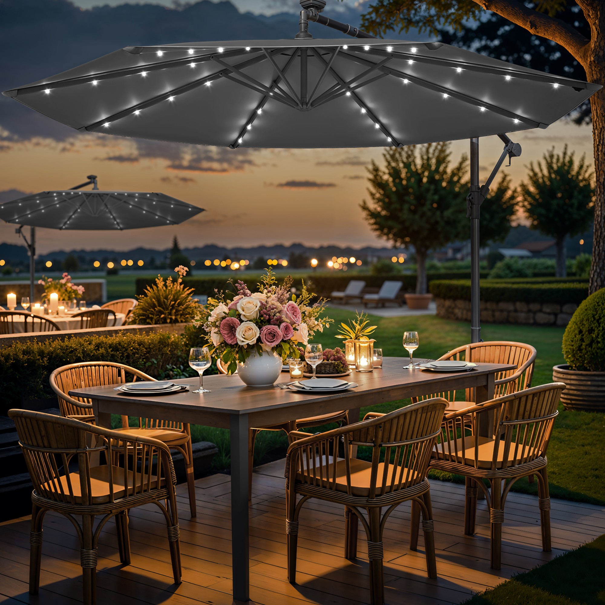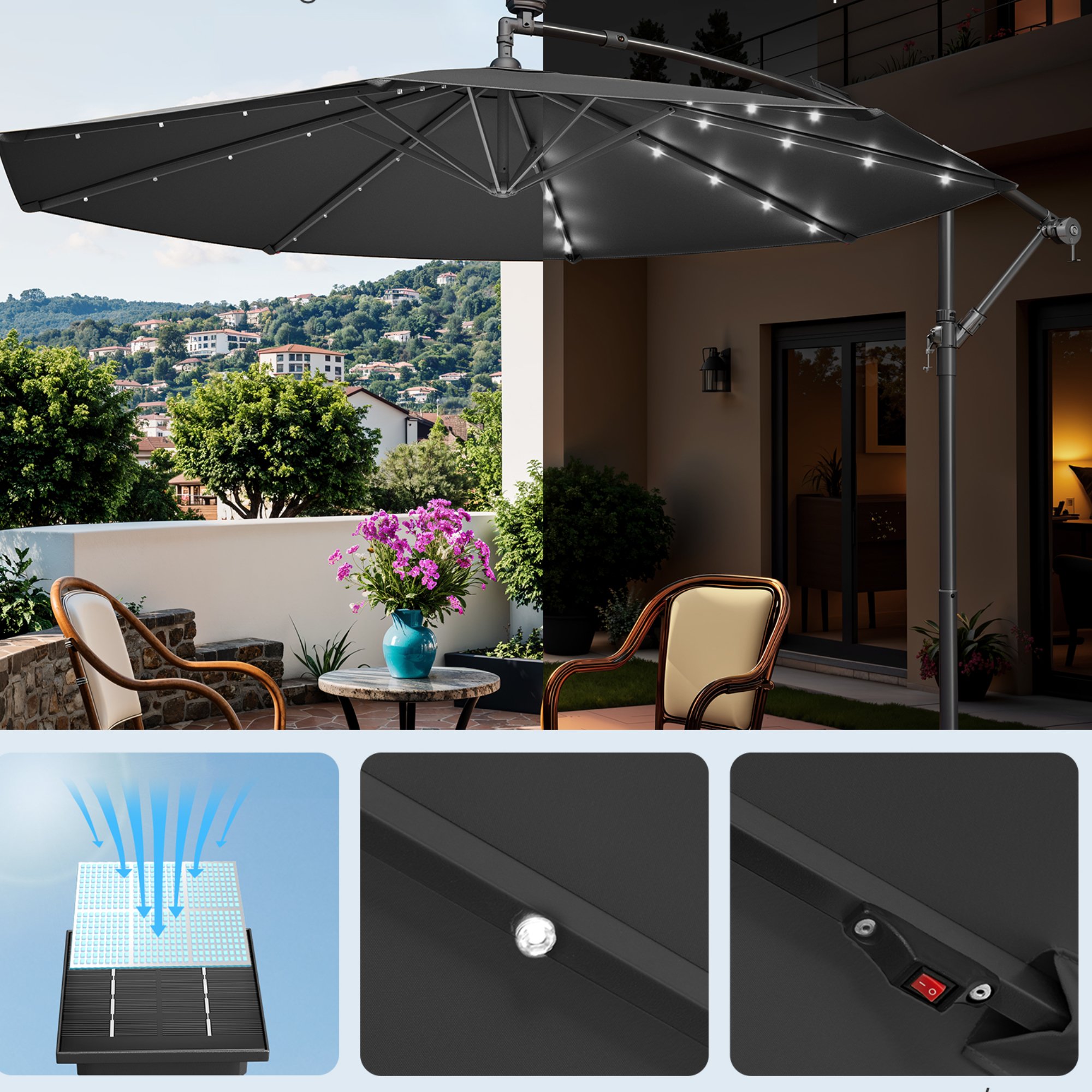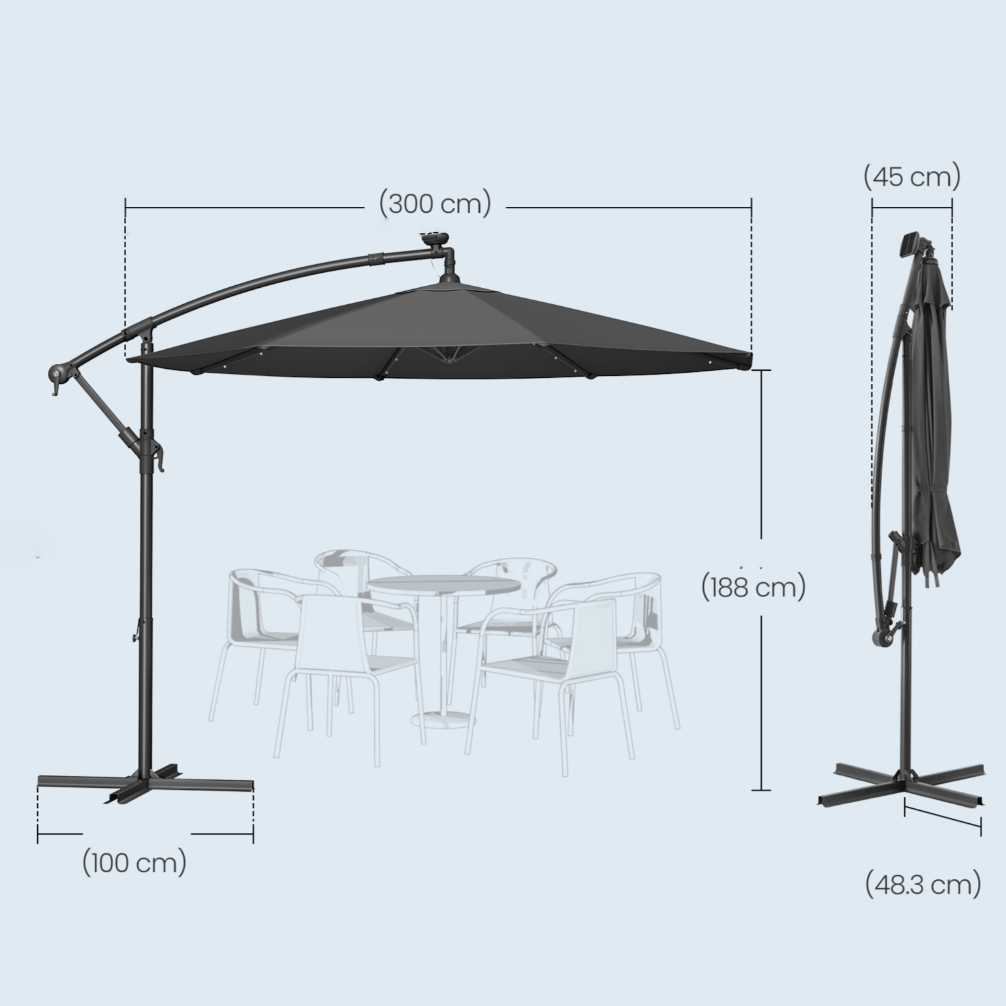 Konstrukce slunečníku je vyrobena z kovu a její povrch je práškově lakovaný. Potah je z polyesteru, který nabízí ochranu proti slunečnímu záření s faktorem UV 50+. Součástí slunečníku je 32 LED světel napájených slunečním světlem, díky kterým snadno vytvoříte romantickou atmosféru až na 6 hodin.